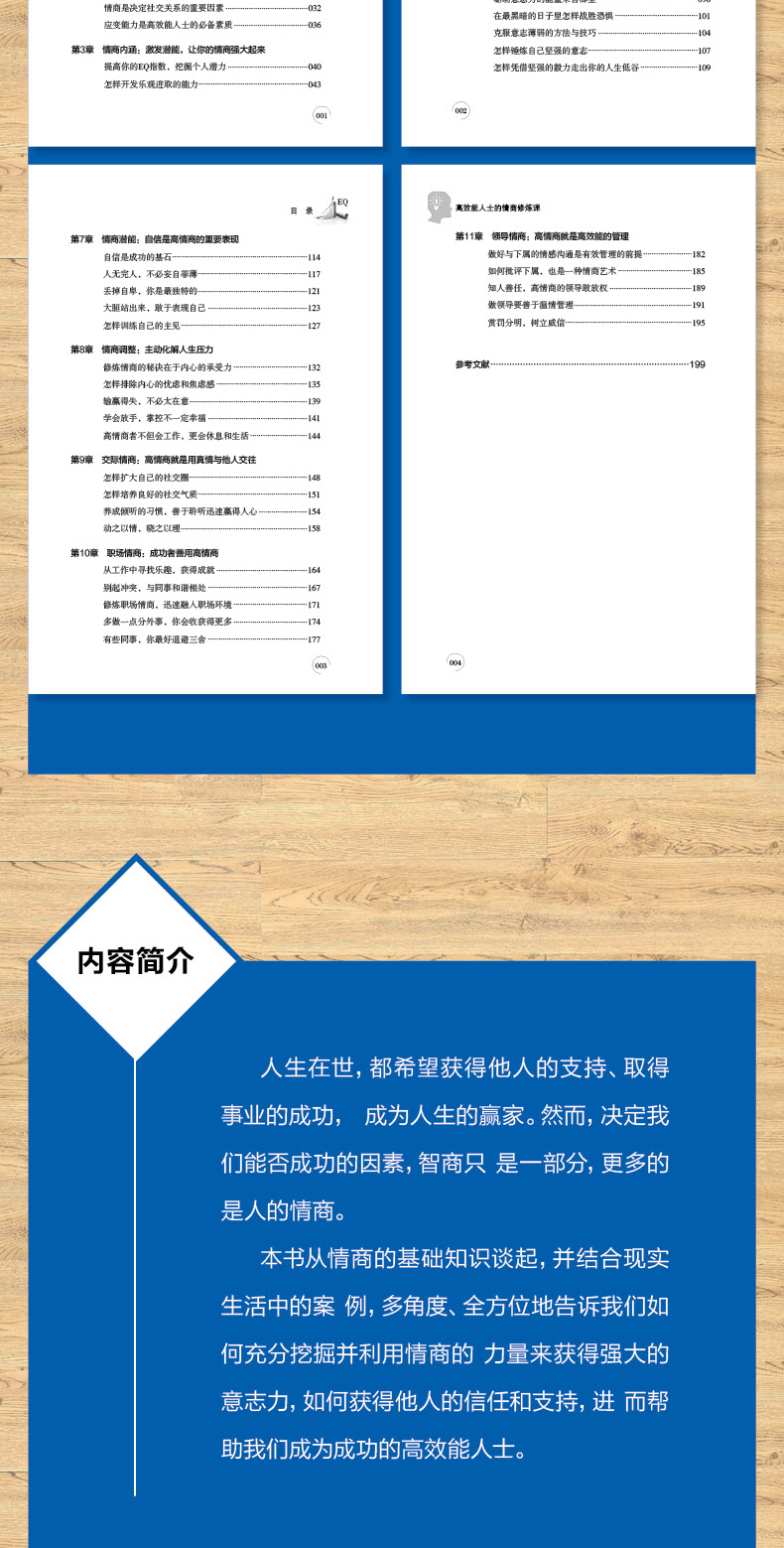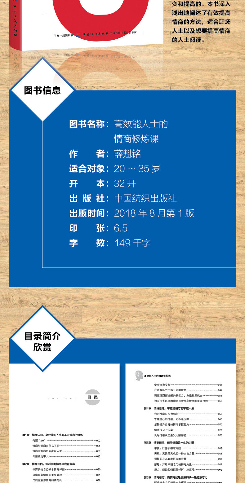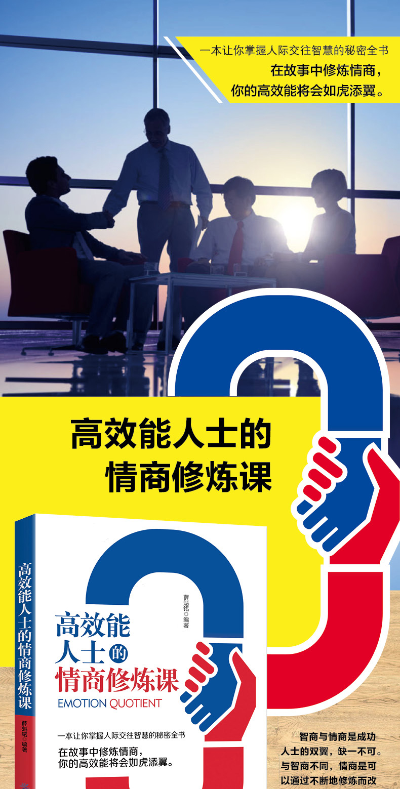 第1章 情商认知:高效能的人生离不开情商的修炼何谓“EQ”002情商与智商有什么不同005情商比智商更能决定人生009低情商危害大012第2章 情商评估:测测你的情商到底有多高你需要给自己做个情商评估020自信是高情商的重要表现025气质左右你情商的高与低028情商是决定关系的重要因素032应变能力是高效能人士的素质036第3章 情商内涵:激发潜能,让你的情商强大起来提高你的EQ指数,挖掘个人潜力040第4章 怎样开发乐观进取的能力043第5章 学会自我安慰046在疏解压力中提升你的情商049训练强烈而清晰的洞察力,方能把握机会053拥有从头再来的能力是激发高情商的重要过程056第4章 情绪管理:掌控情绪方能掌控人生你的情绪自控力如何060管理自己的情绪,而不是压抑066怎样提升自身的情绪掌控能力070情绪也会“传染”073良好情绪状态激发无限潜能076第5章 情商修炼:修炼情商是一生的功课善良:行善积德有好报082勇敢:无畏是灵魂的一种杰出力量085积极的心态有着巨大的力量088感恩:开启幸福之门的神奇力量089毅力:能助我们征服任何一座高峰092第6章 情商意志:高情商就是磨炼钢铁一般的意志力驱动意志力的能量来自哪里098在黑暗的日子里怎样战胜恐惧101克服意志薄弱的方法与技巧104怎样锤炼自己坚强的意志107怎样凭借坚强的毅力走出你的人生低谷109