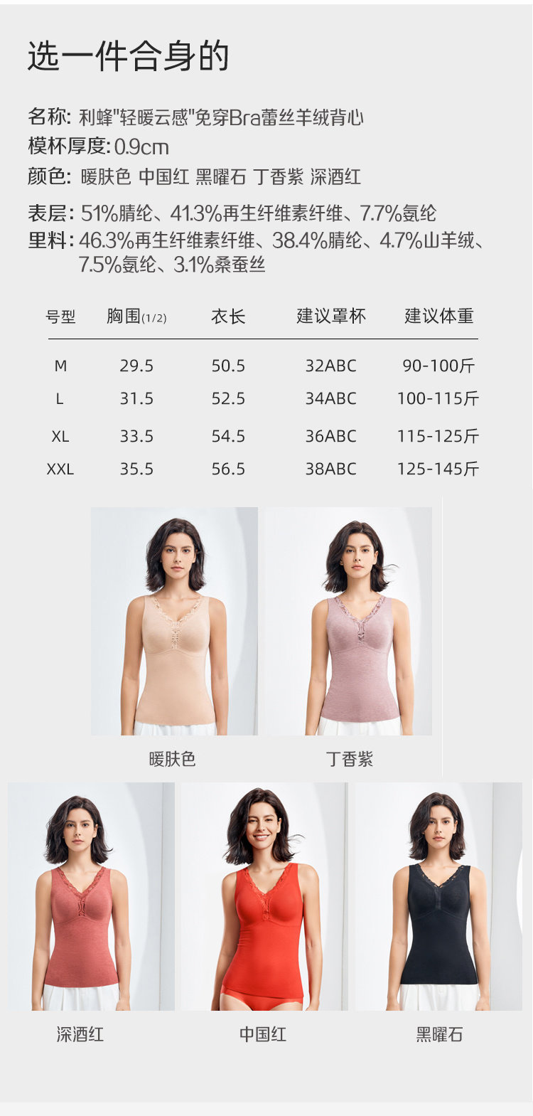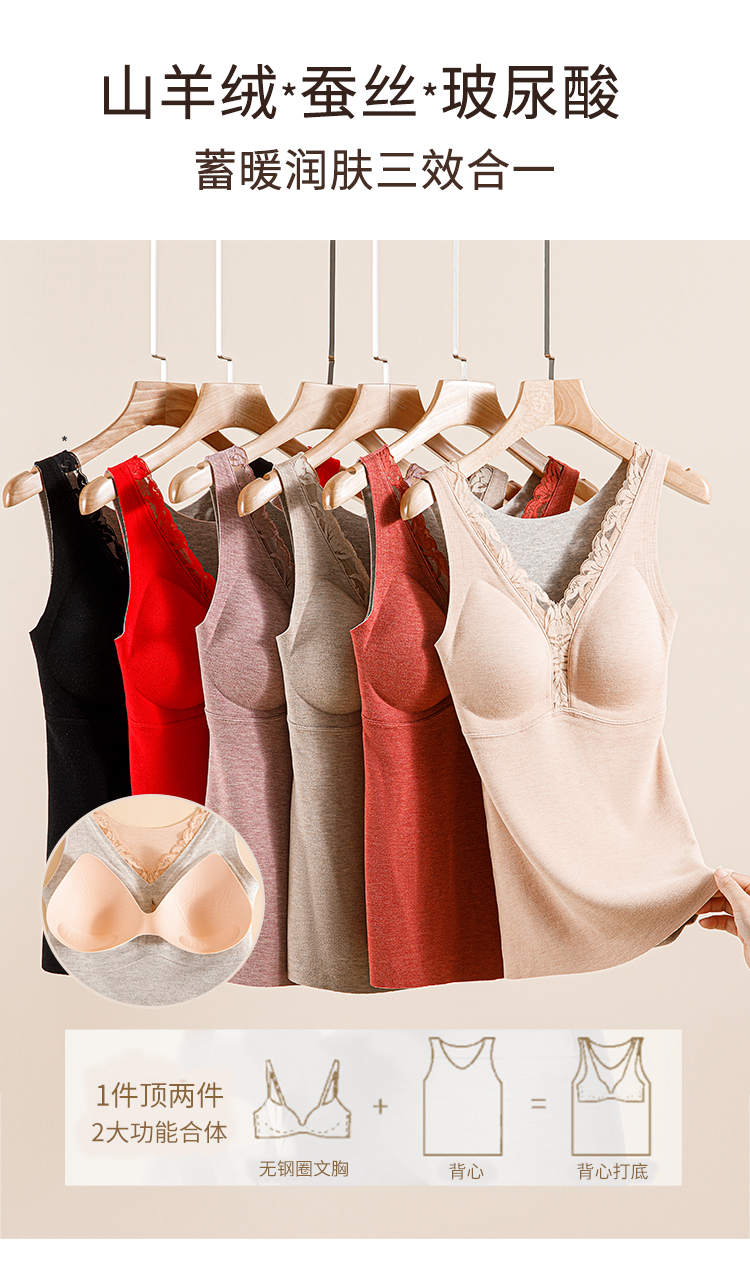 【利蜂"轻暖云感"免穿BRA蕾丝羊绒背心】 新年红品 山羊绒*蚕丝*玻尿酸蓄暖润肤三效合一