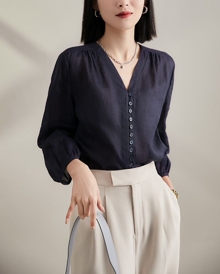 【品牌授权】Flyzoo泡泡袖衬衫 V领+泡泡袖 透气吸汗 轻奢英伦风 温柔显瘦 气质 专柜品质