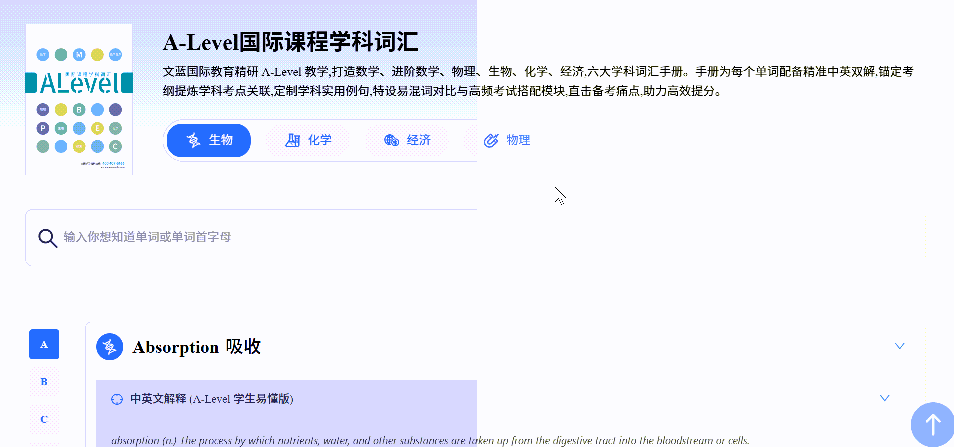 文蓝国际教育精研 A-Level 教学,打造物理、生物、化学、经济学科词汇库,共计上千词汇。