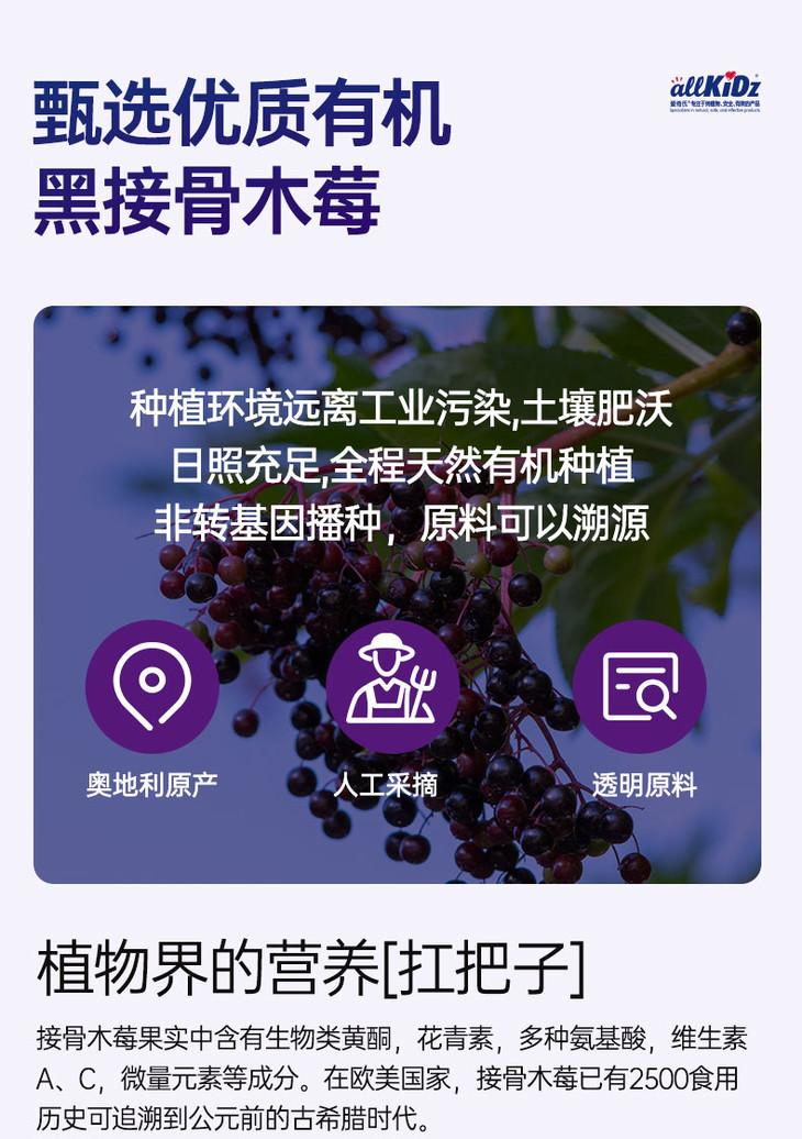 储存方式:由于接骨木莓中的花青素属于天然色素,温度过高或者存储不当会加快色素降解