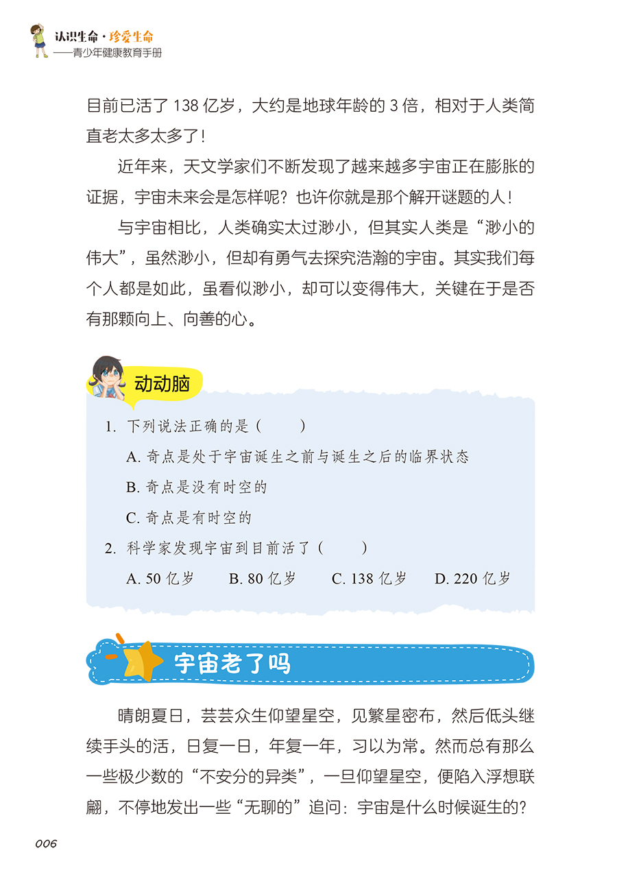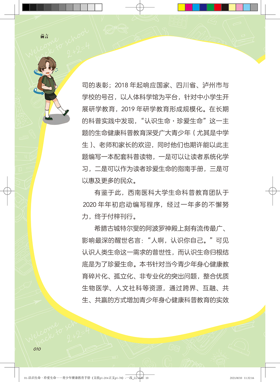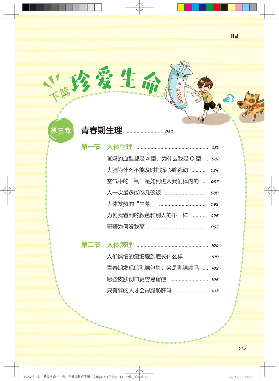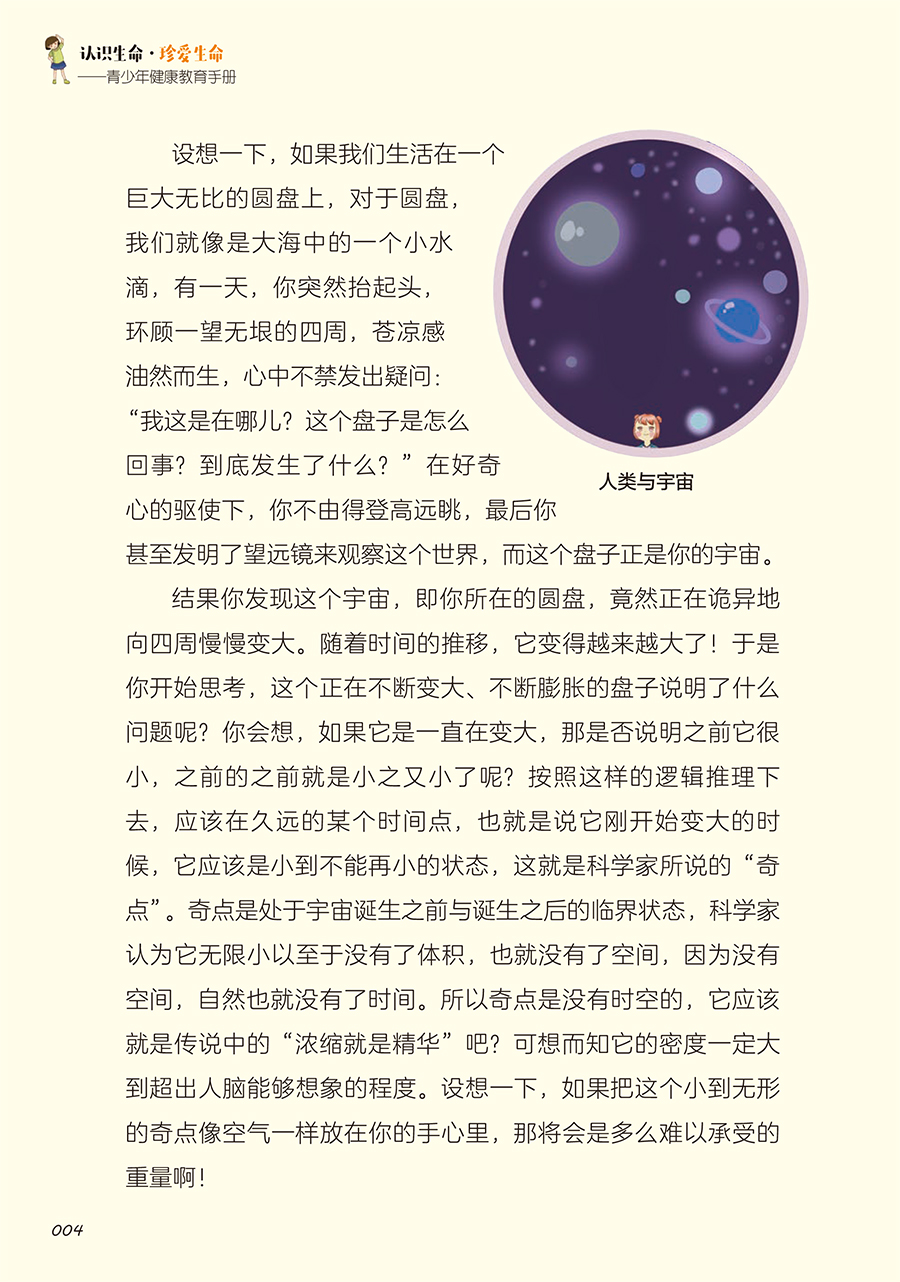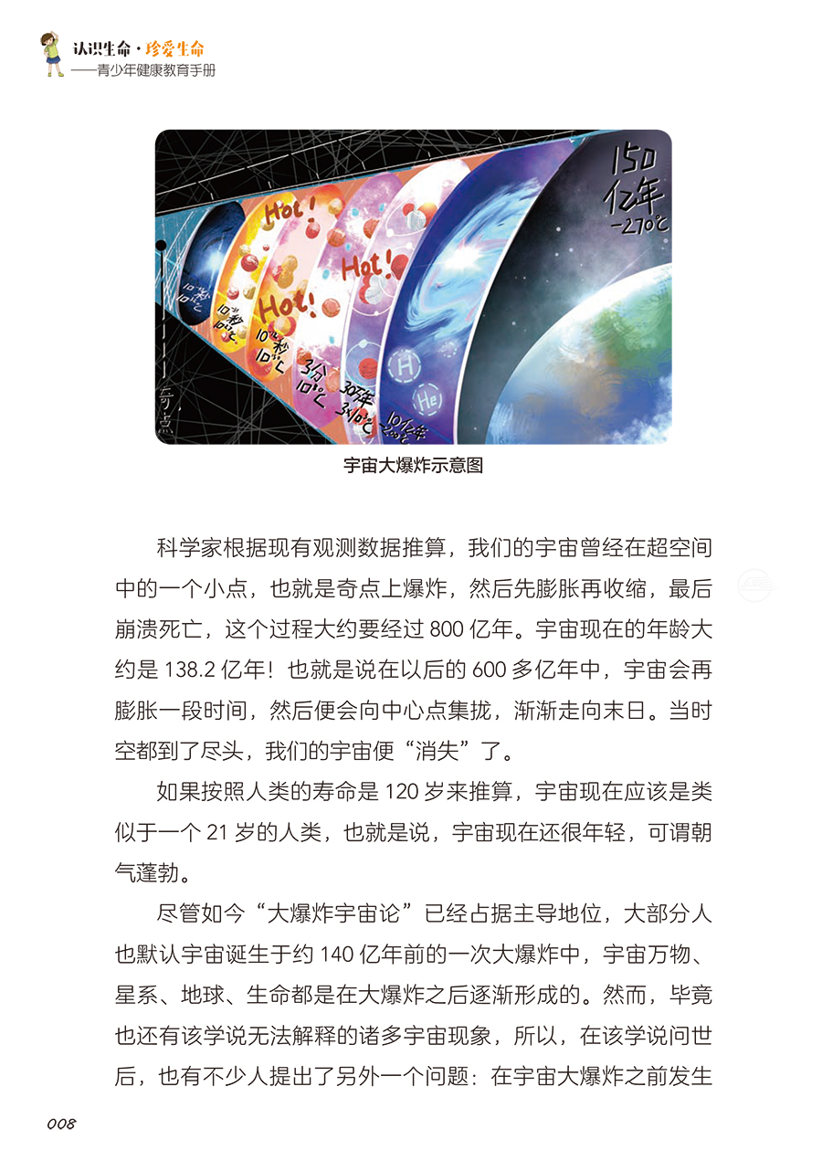 主要内容包括:认识生命、珍爱生命两大板块。其中1.认识生命包括:宇宙演进、生命起源、人体构造等;2.珍爱生命包括:生命救护(常见病防治、急救)、青春期健康知识(青春期生理及对策、青春期心理及对策)、伦理与法规等。编写人员主要来自西南医科大学,分别医学、心理、法律等领域教育及科研人员,可严把书稿的科学性。内容撰写上完全根据青少年的理解需要,知识深入浅出、语言通俗易懂,并配以生动活泼的原创漫画,进一步加深青少年的理解记忆。