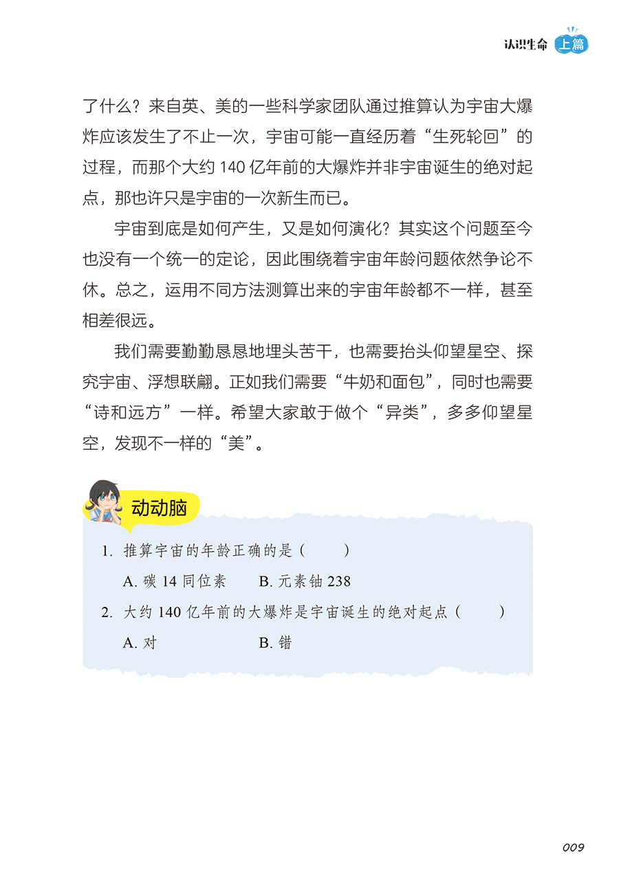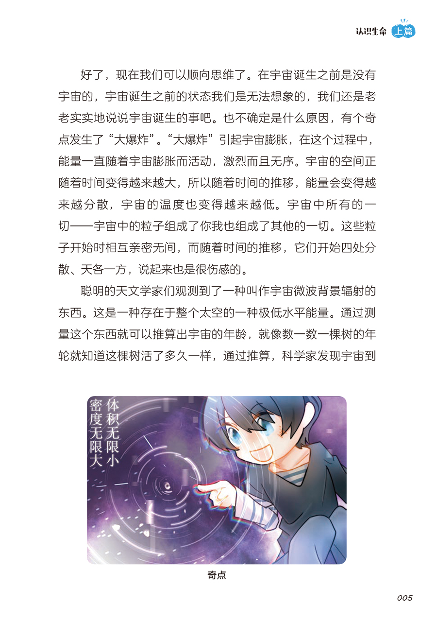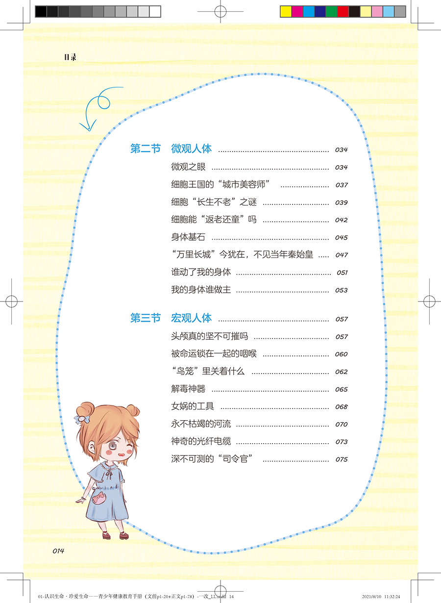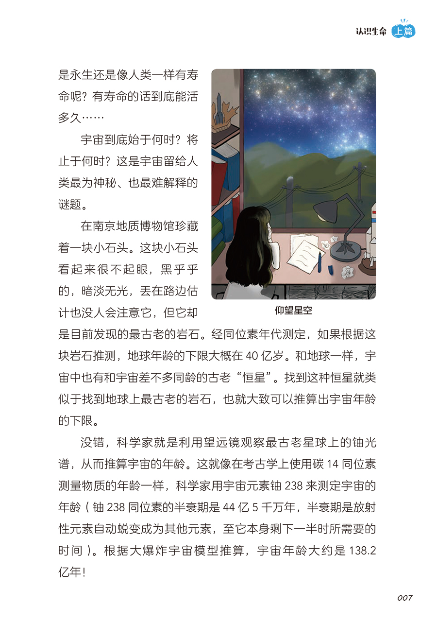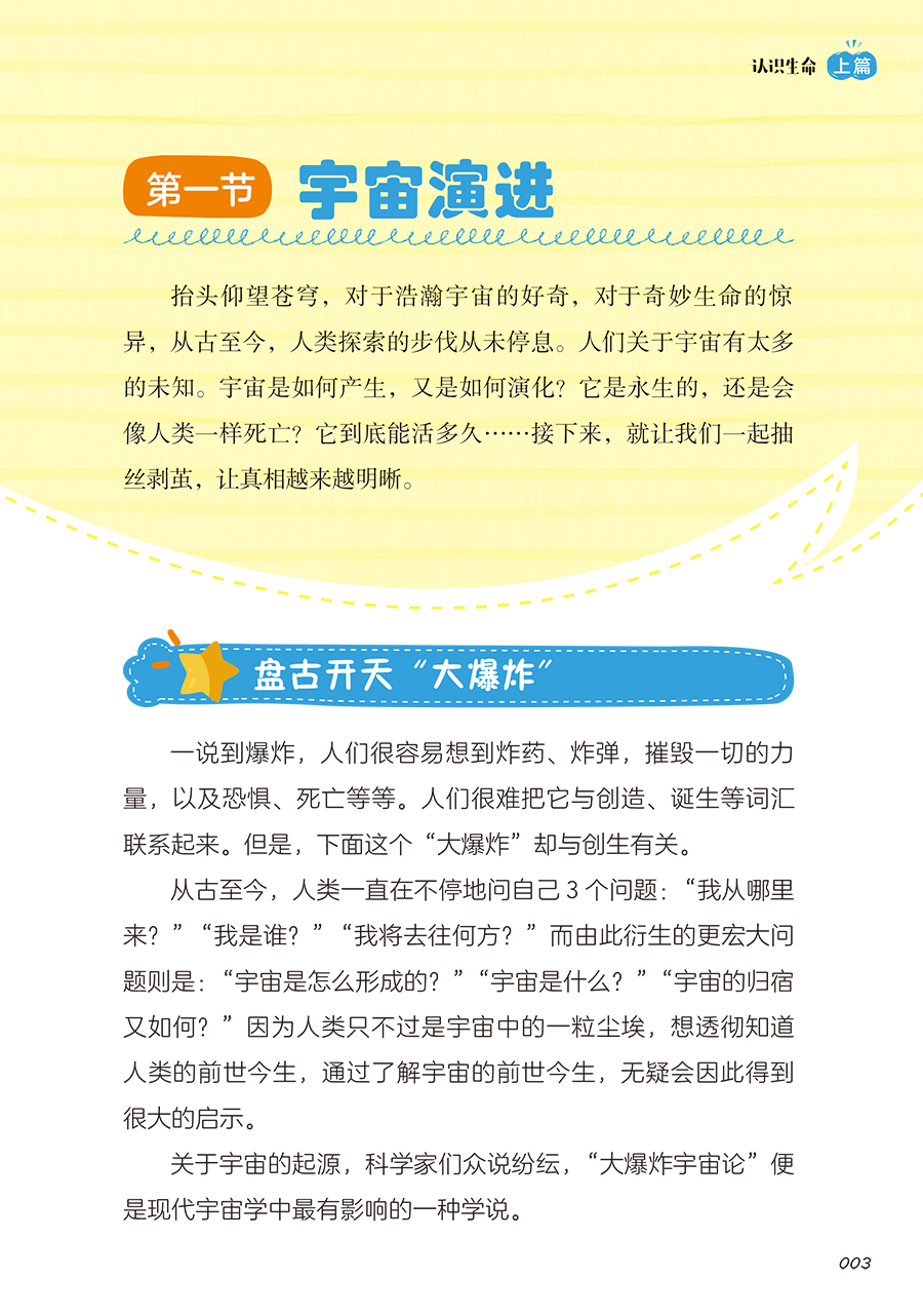 主要内容包括:认识生命、珍爱生命两大板块。其中1.认识生命包括:宇宙演进、生命起源、人体构造等;2.珍爱生命包括:生命救护(常见病防治、急救)、青春期健康知识(青春期生理及对策、青春期心理及对策)、伦理与法规等。编写人员主要来自西南医科大学,分别医学、心理、法律等领域教育及科研人员,可严把书稿的科学性。内容撰写上完全根据青少年的理解需要,知识深入浅出、语言通俗易懂,并配以生动活泼的原创漫画,进一步加深青少年的理解记忆。