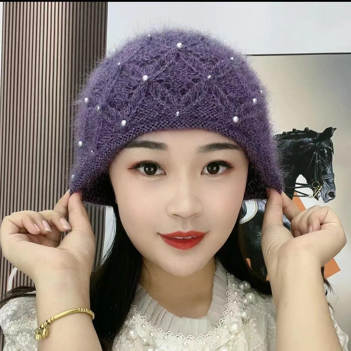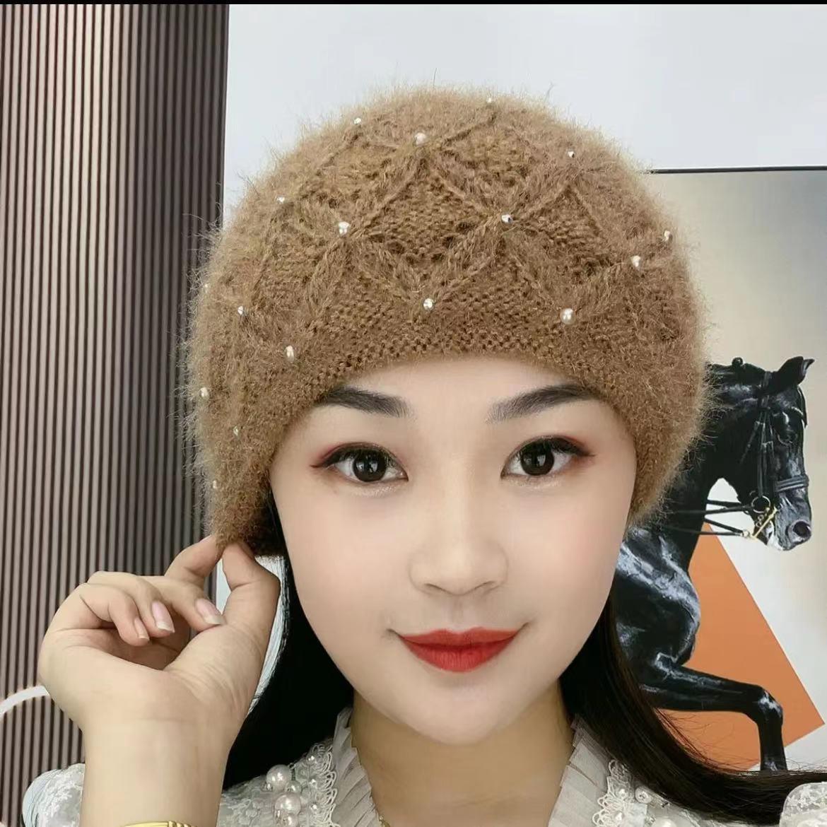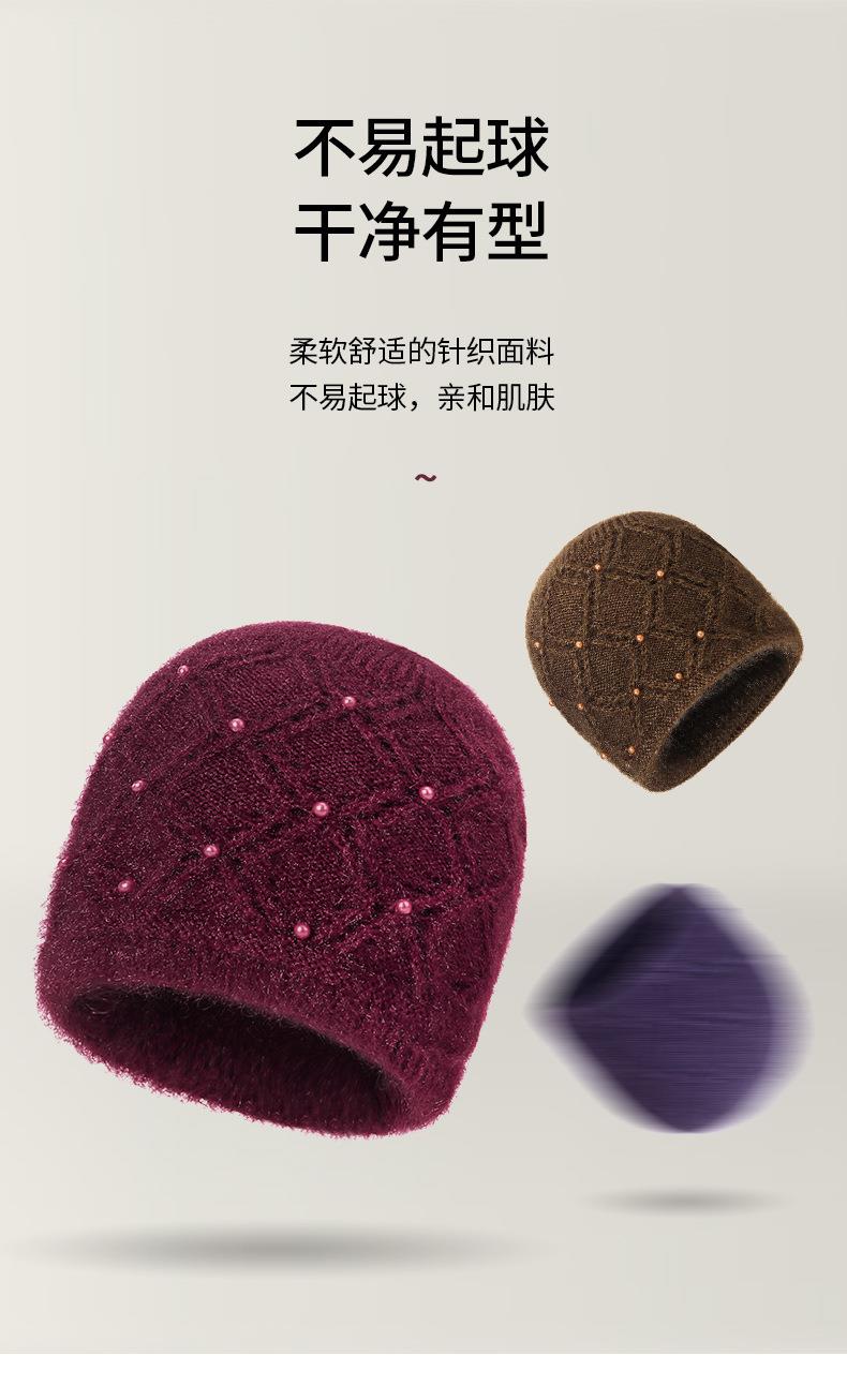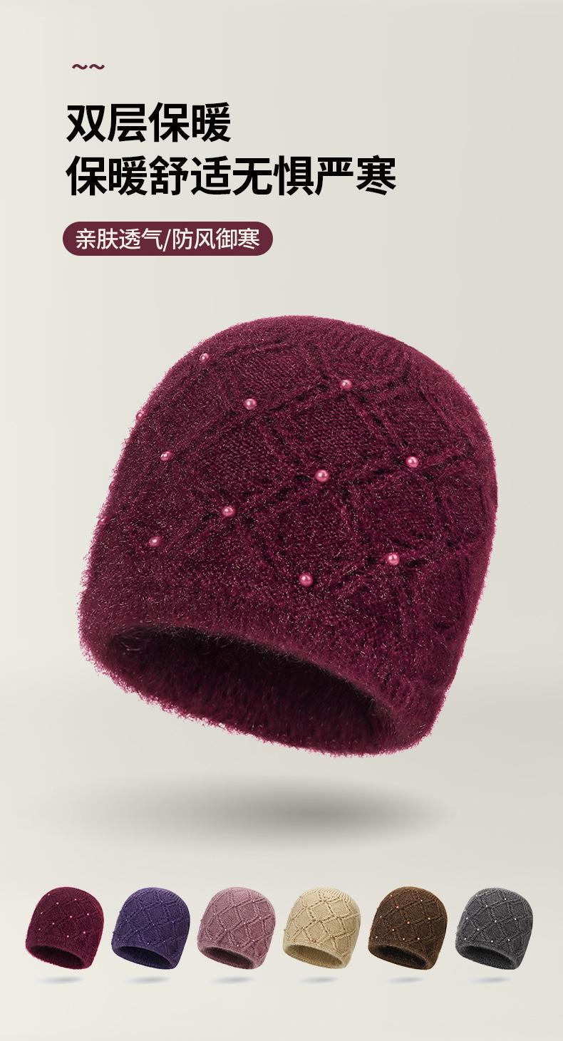 冬季新款女松鼠绒保暖珍珠针织毛线帽中老年护耳毛线帽老太妈妈帽