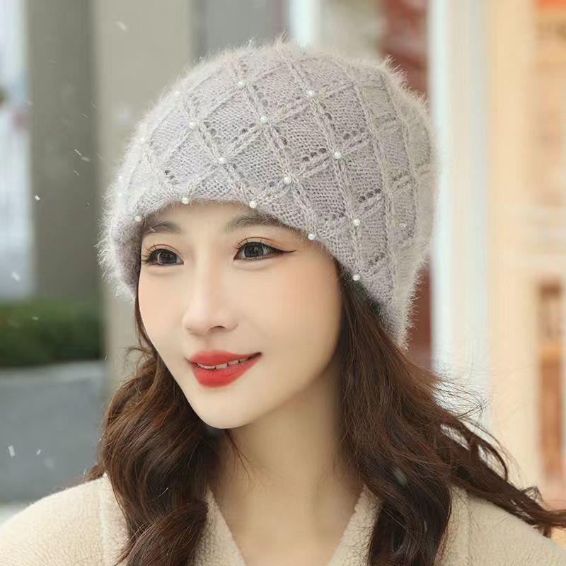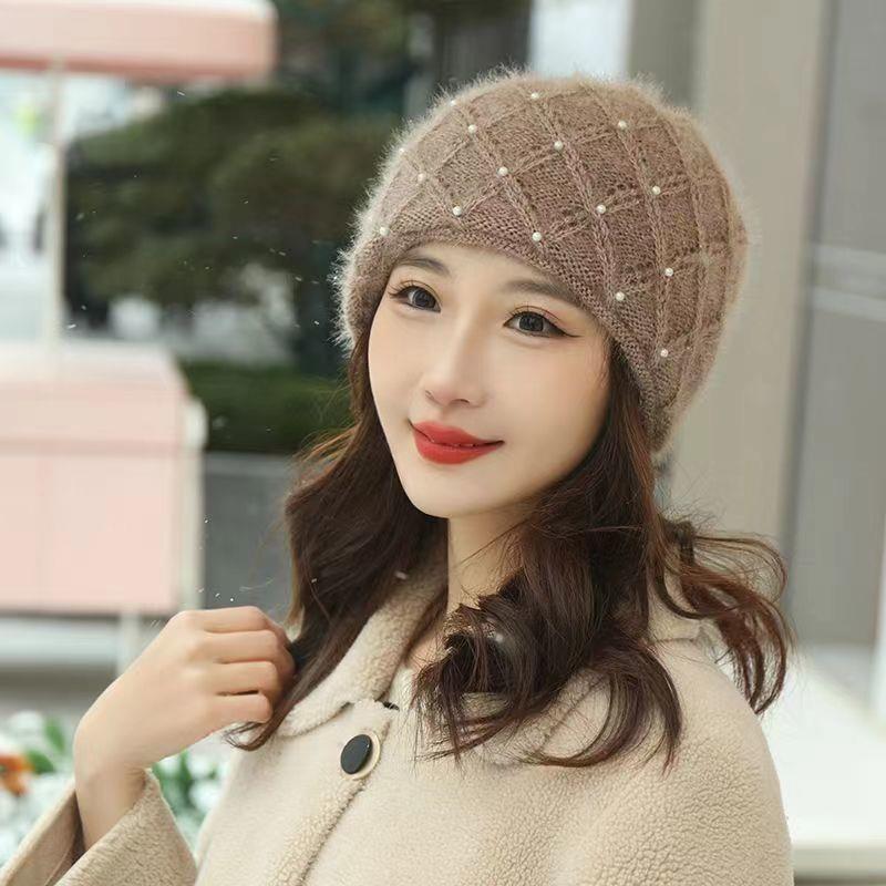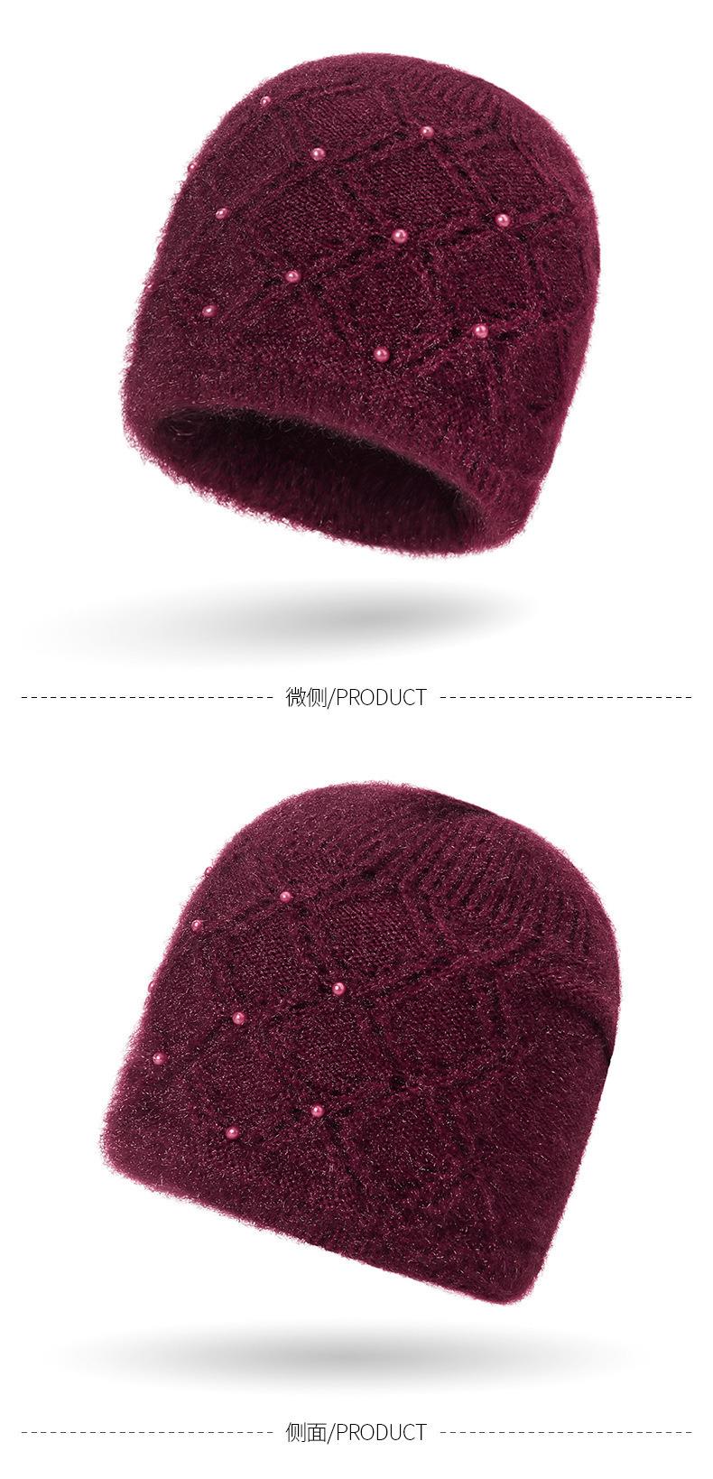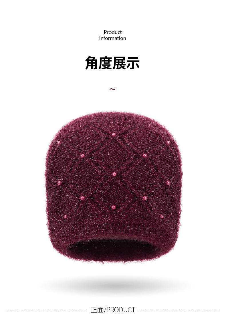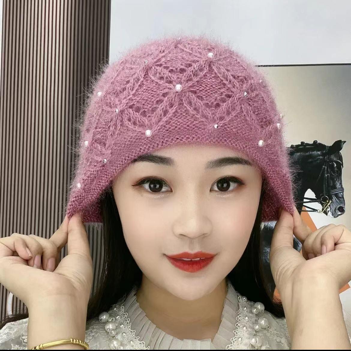冬季新款女松鼠绒保暖珍珠针织毛线帽中老年护耳毛线帽老太妈妈帽