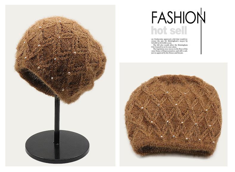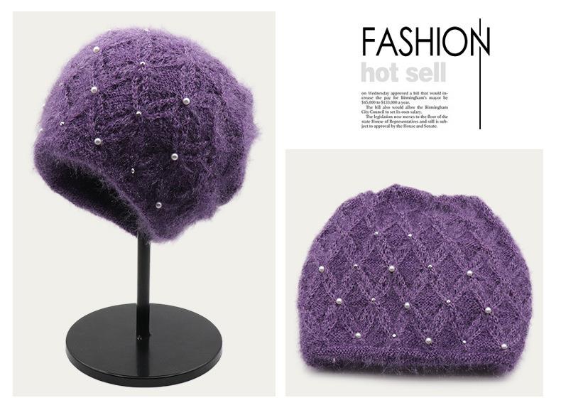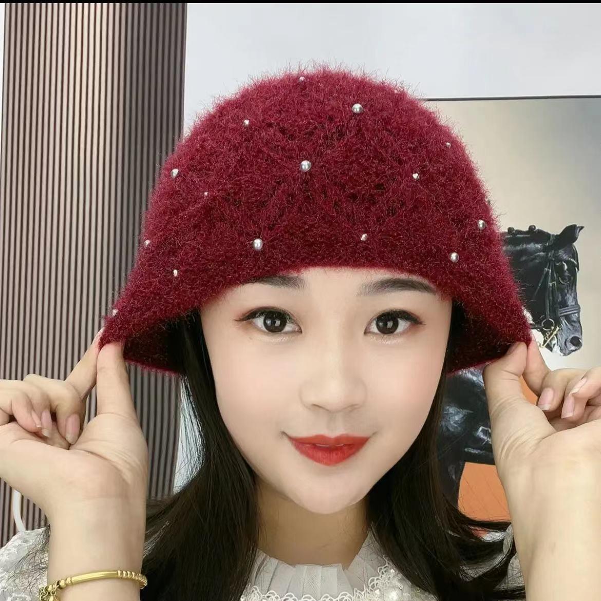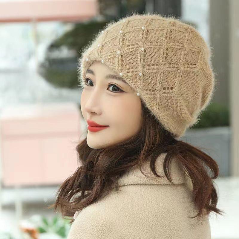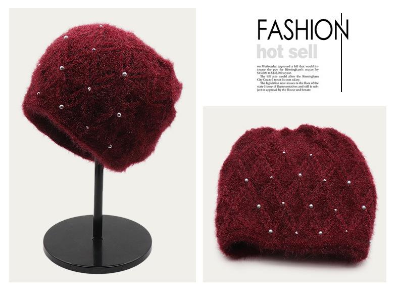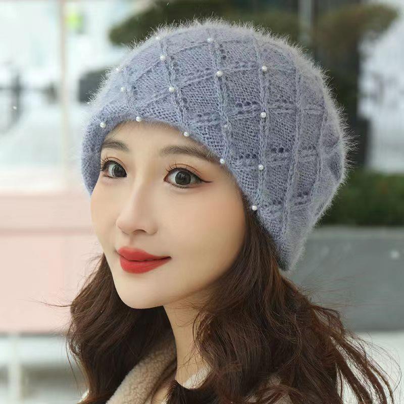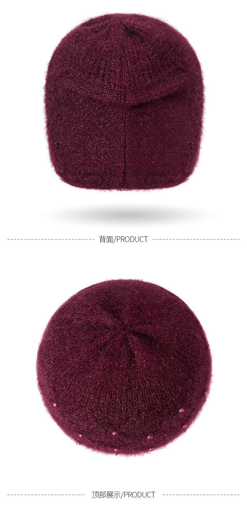 冬季新款女松鼠绒保暖珍珠针织毛线帽中老年护耳毛线帽老太妈妈帽