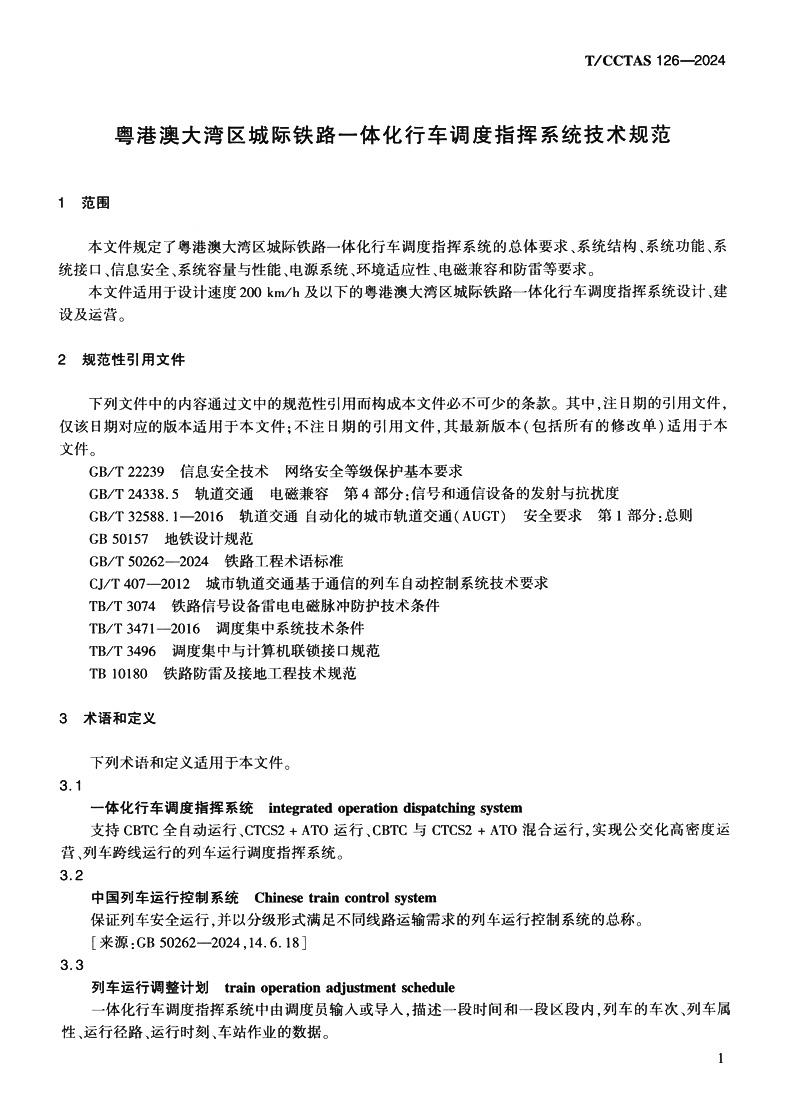 书名:粤港澳大湾区城际铁路一体化行车调度指挥系统技术规范T/CCTAS 126—2024
