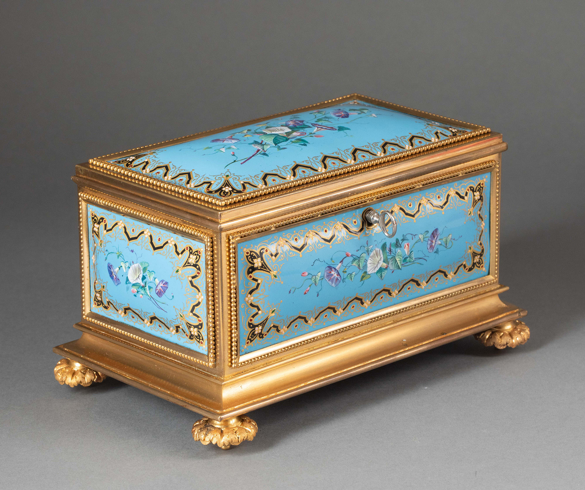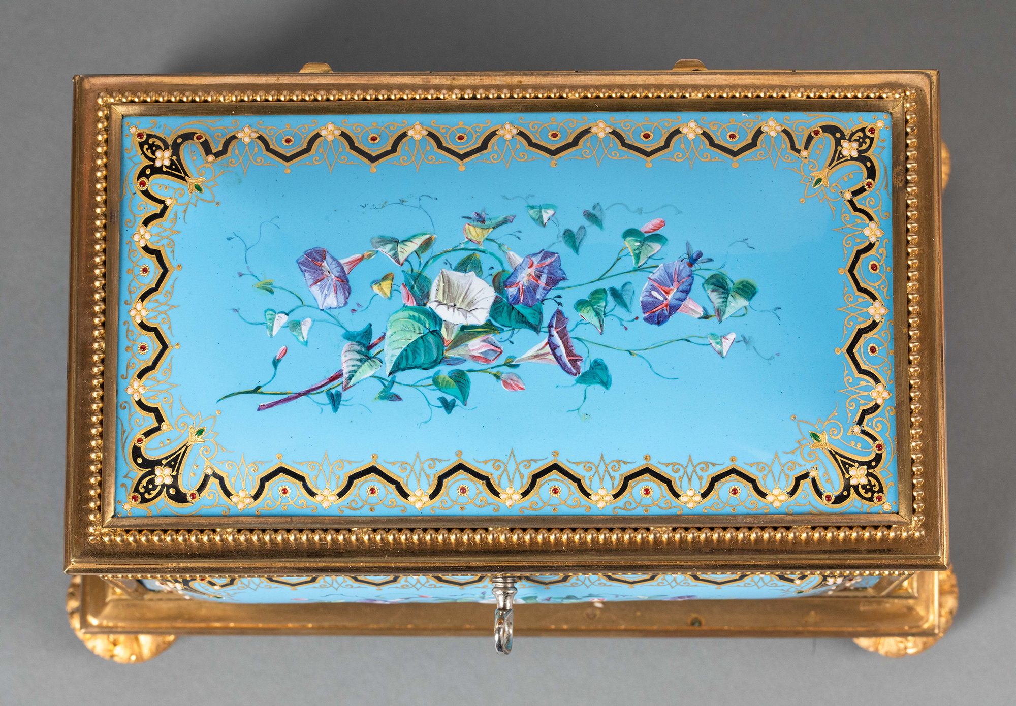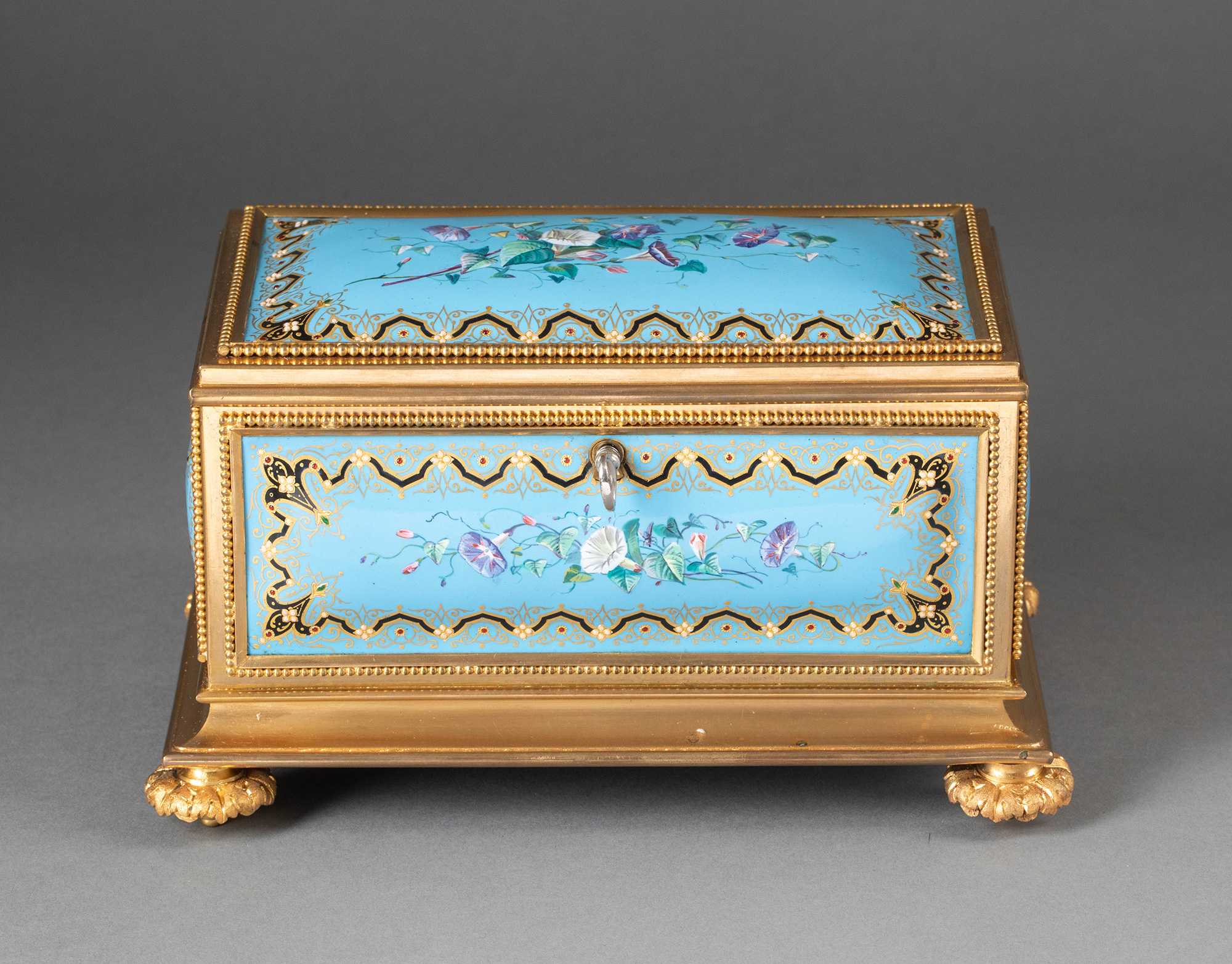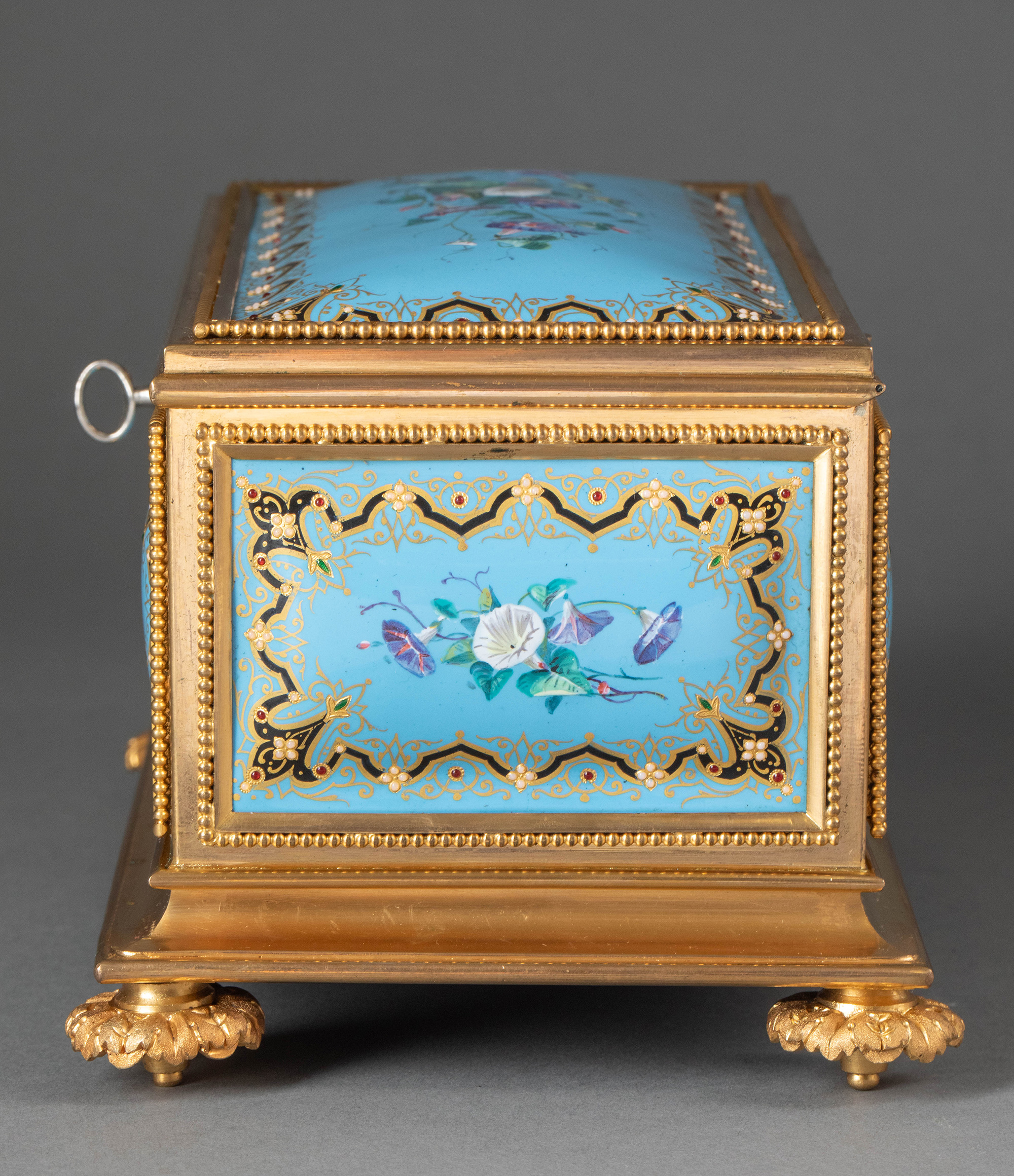 19世纪末法国出品铜鎏金精雕装饰天蓝地牵牛花主题布雷松珐琅彩绘描金珍宝盒