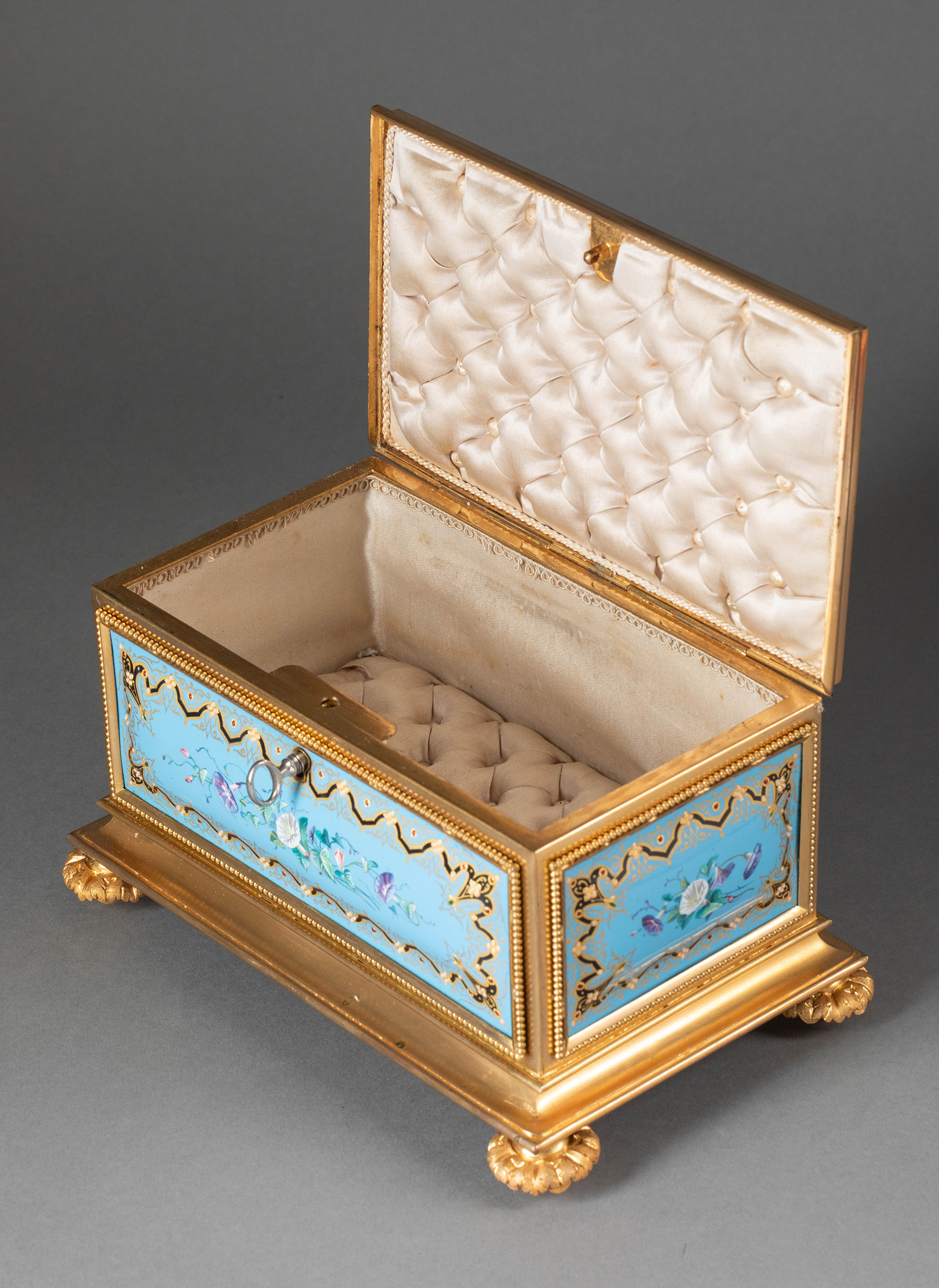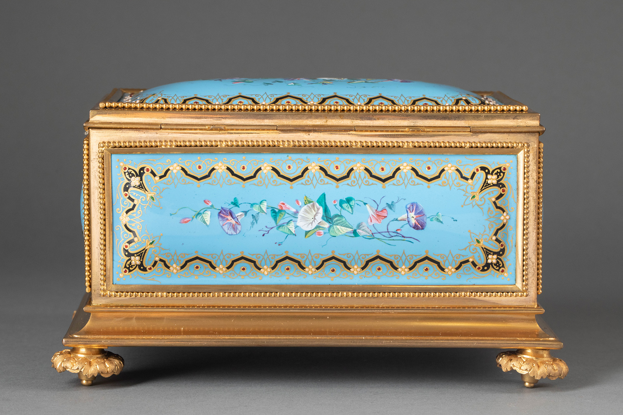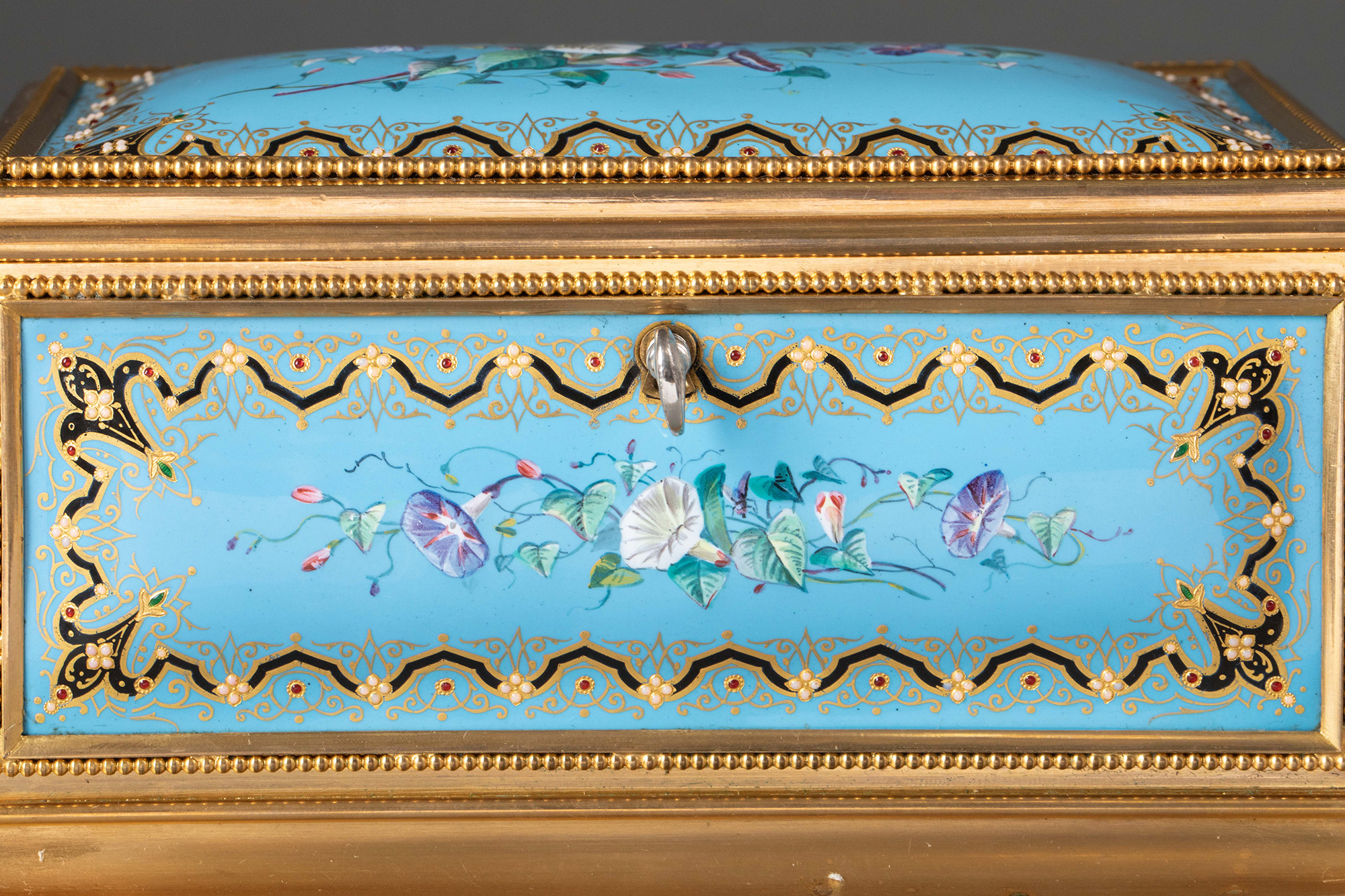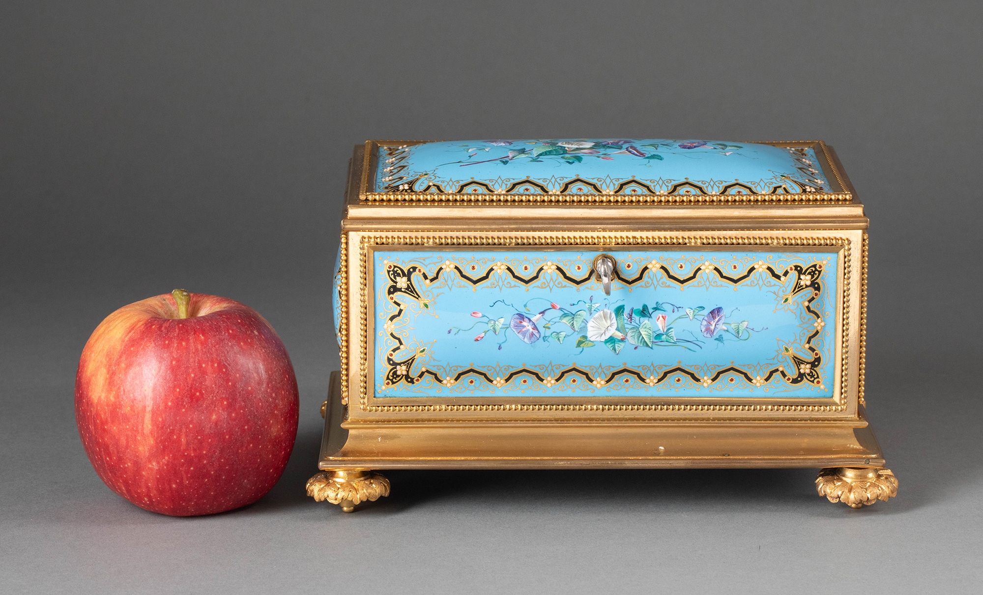 19世纪末法国出品铜鎏金精雕装饰天蓝地牵牛花主题布雷松珐琅彩绘描金珍宝盒