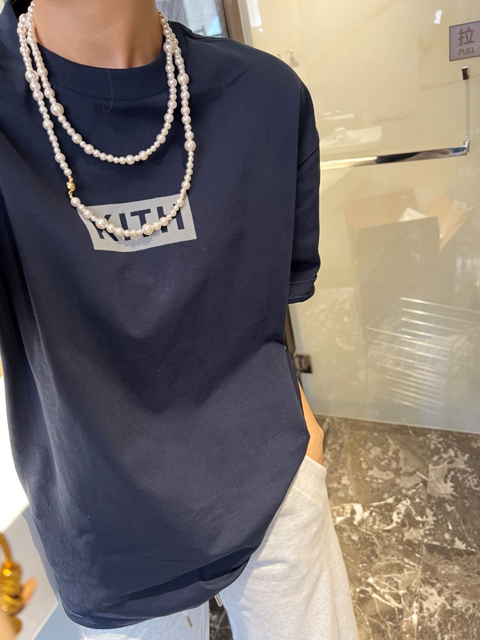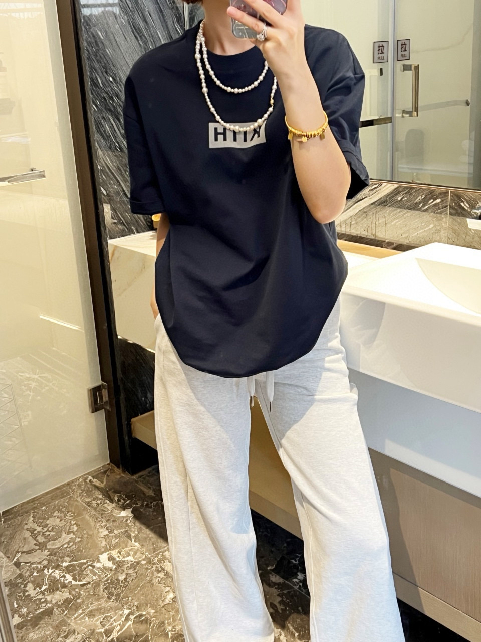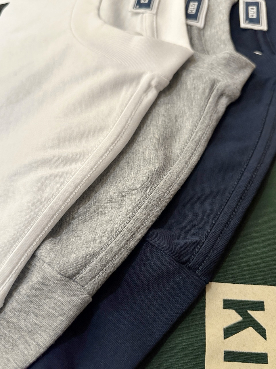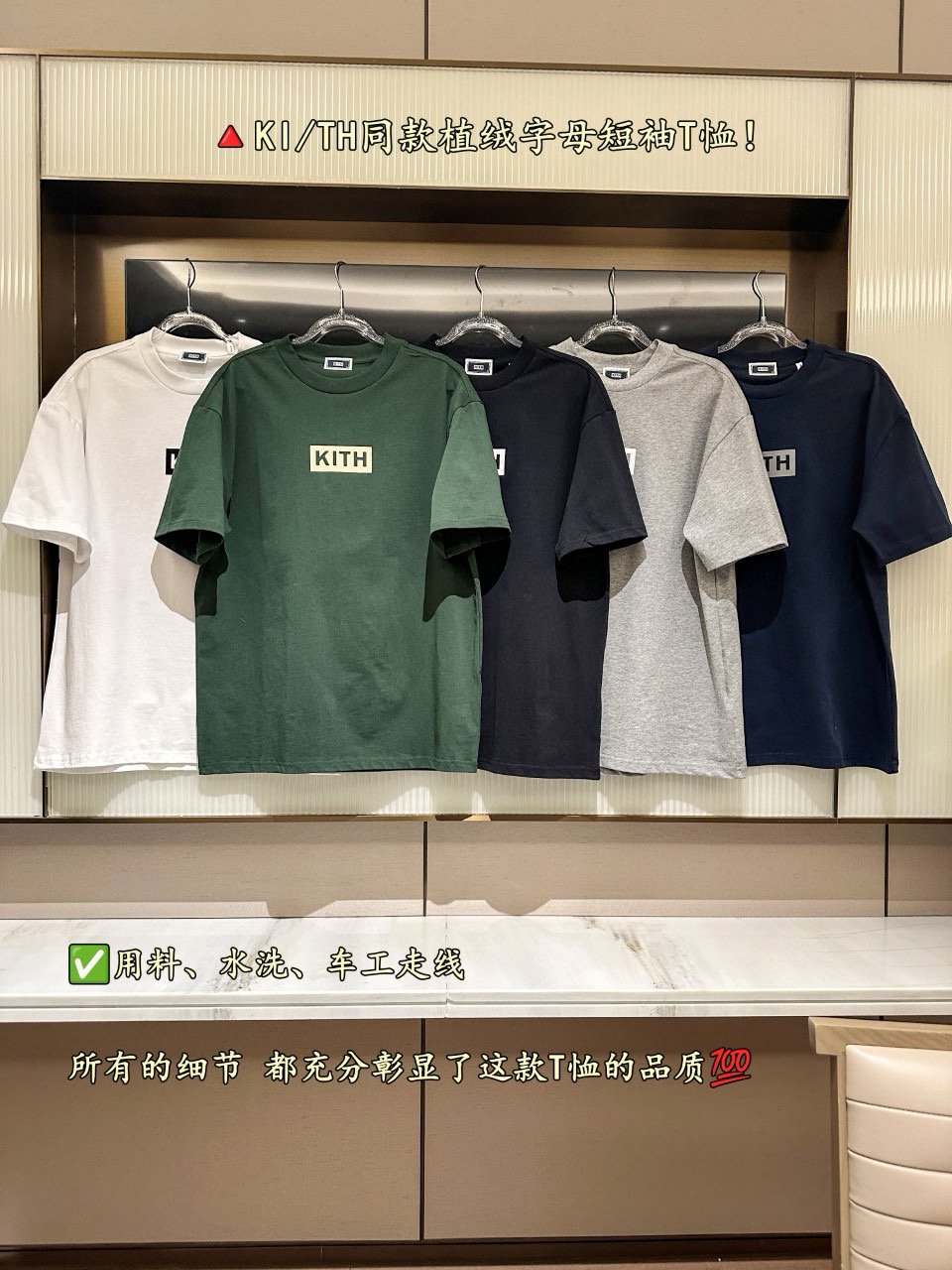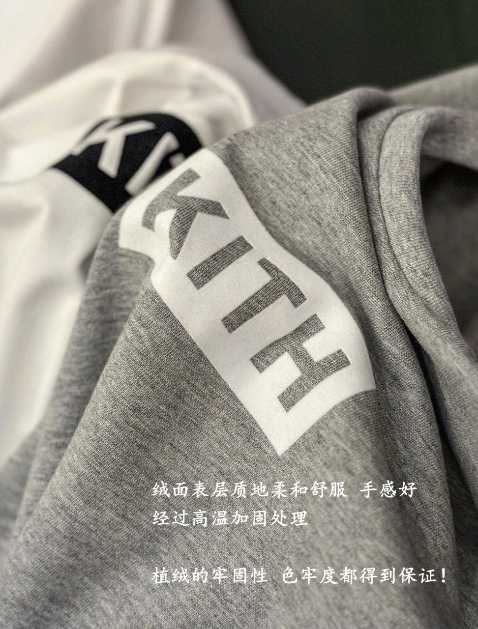 胸前醒目的 KI/TH Logo,印花为进口植绒印花,相对平时的胶浆 油墨完全的不一样,绒面表层质地柔和舒服 手感好,经过高温加固处理,植绒的牢固性,色牢度都得到保证!