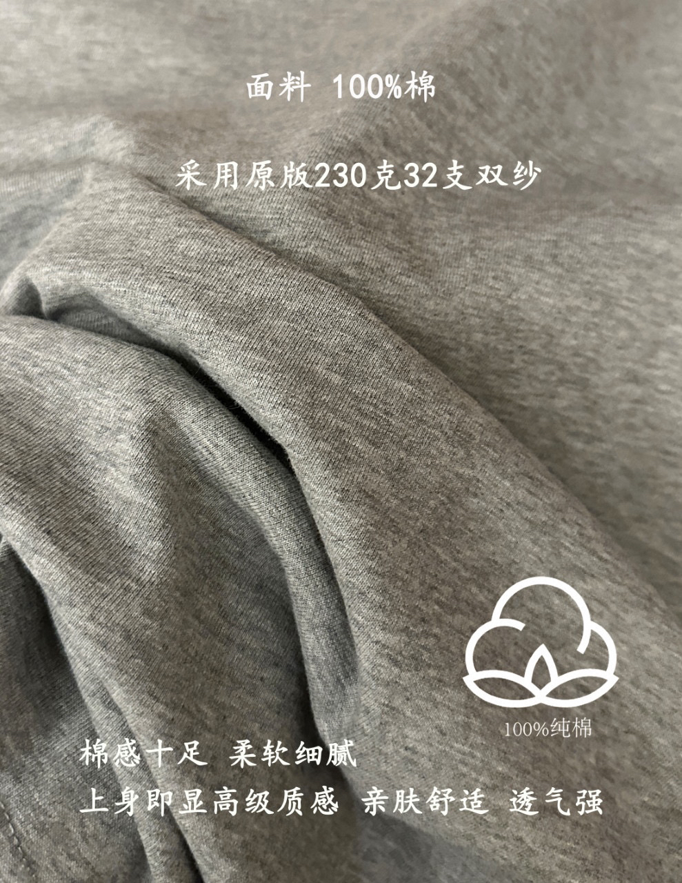 采用原版230克32支双纱,棉感十足,柔软细腻 上身即显高级质感,亲肤舒适 透气强!