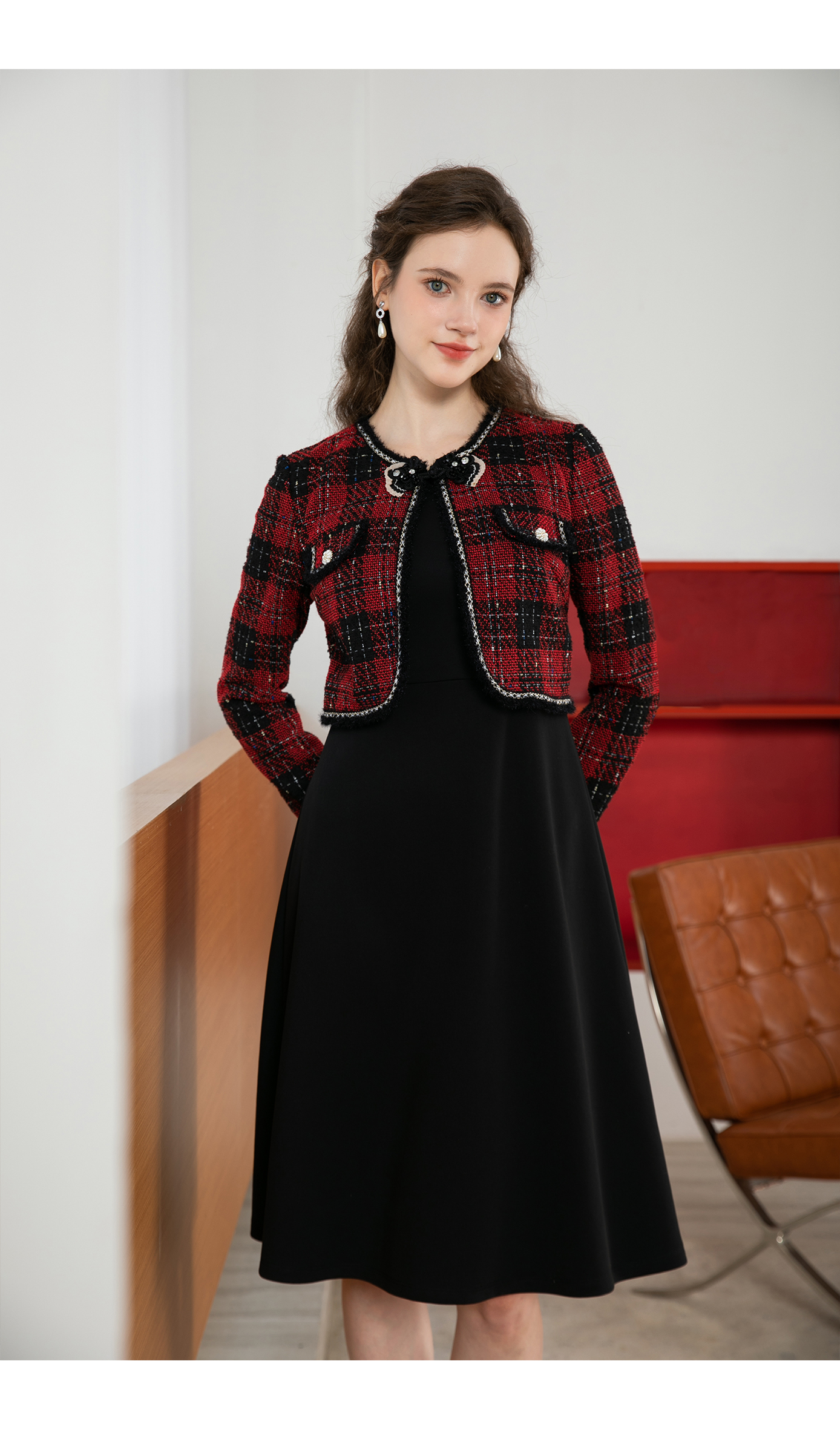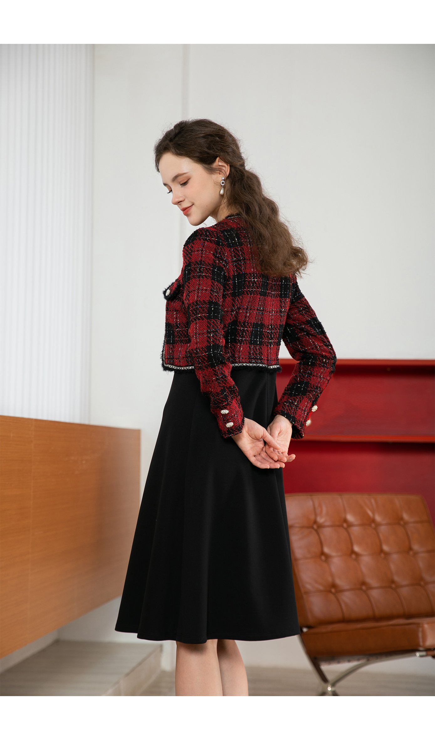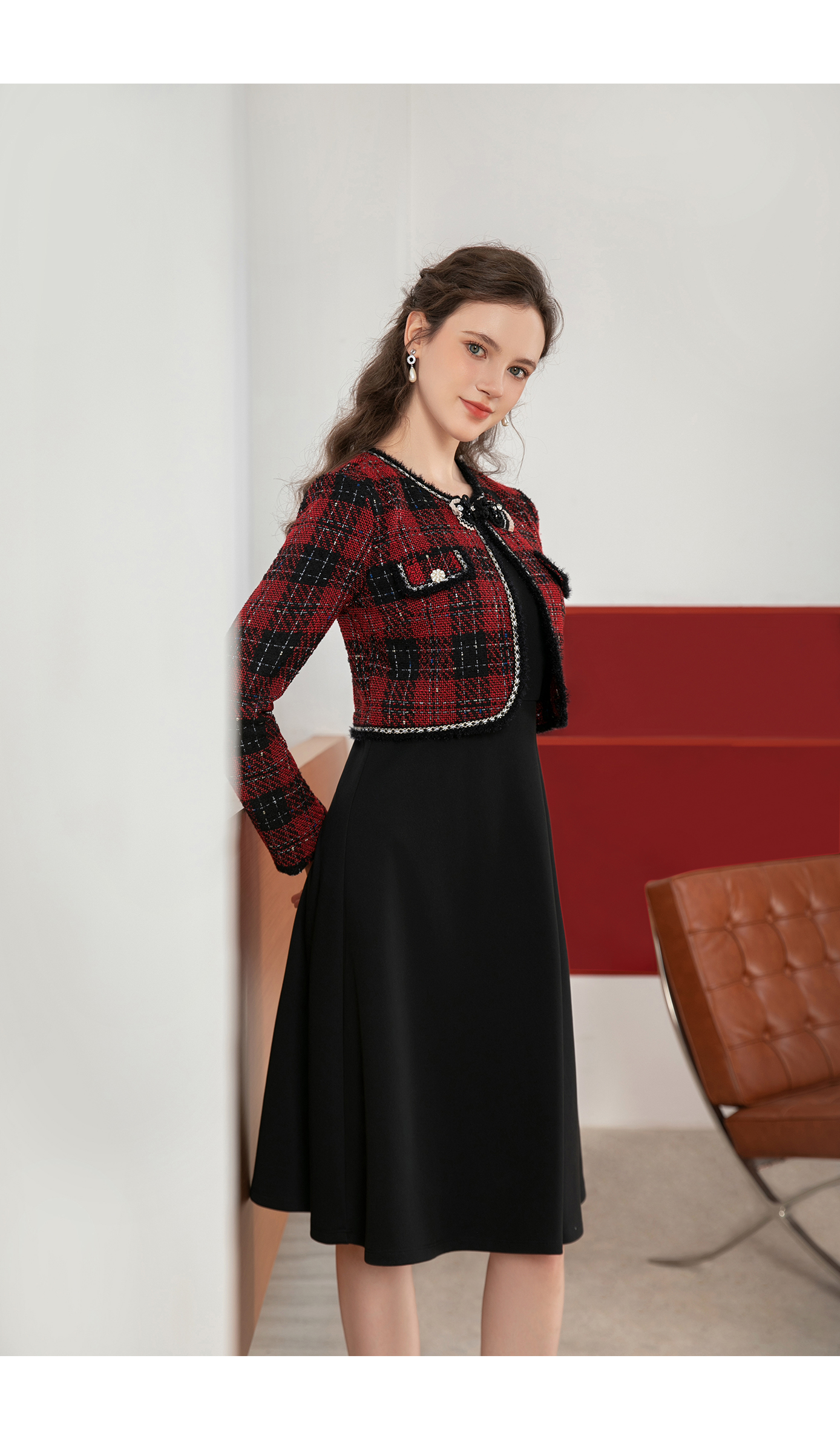 司歌假两件小香风连衣裙收腰弹力A901045y