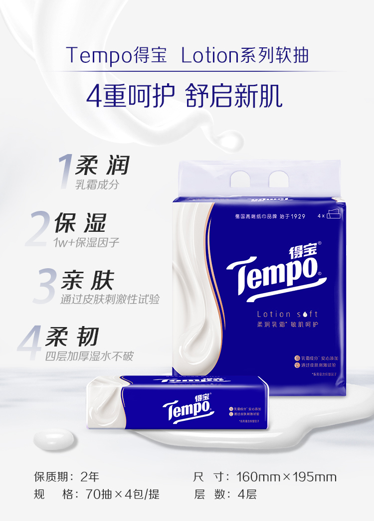 『Tempo得宝』lotion抽取式乳霜柔敏纸面巾70抽四层4包