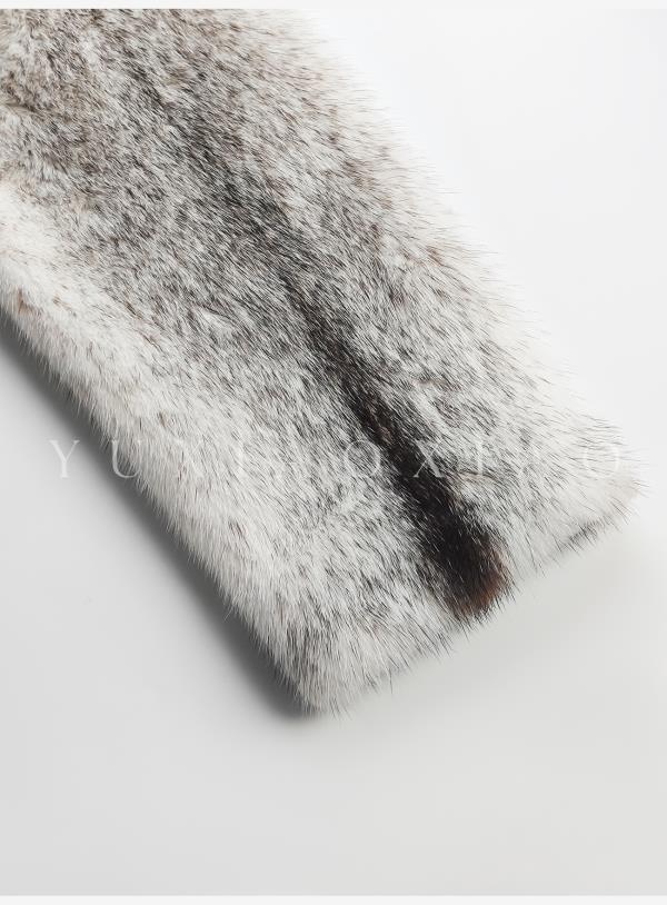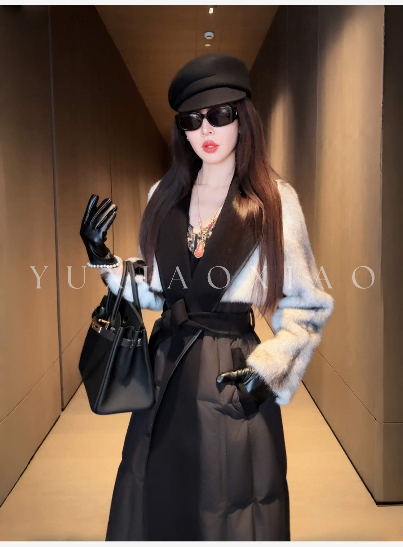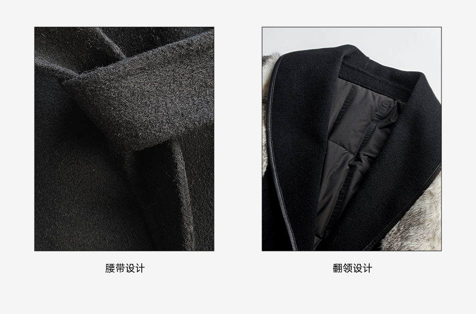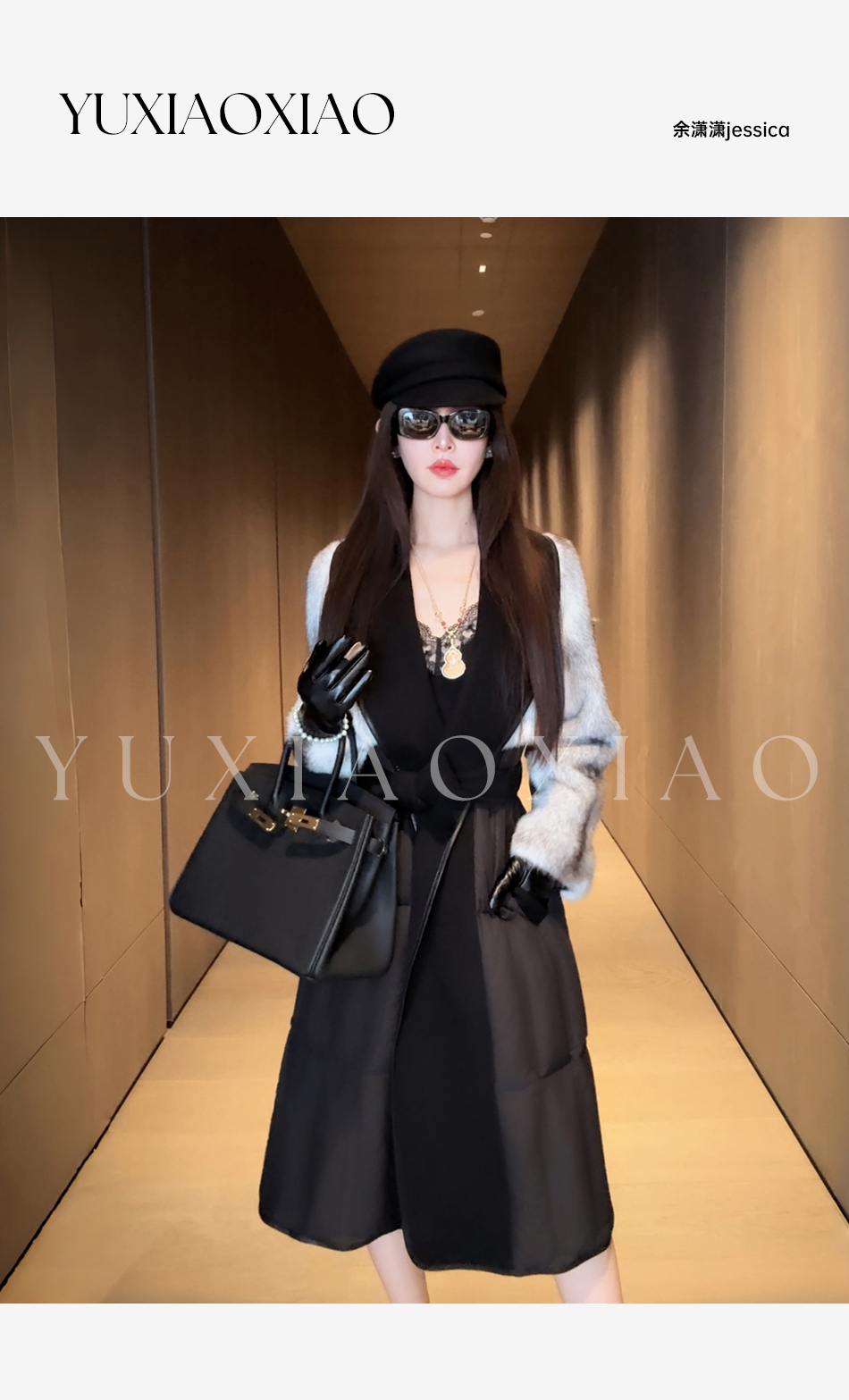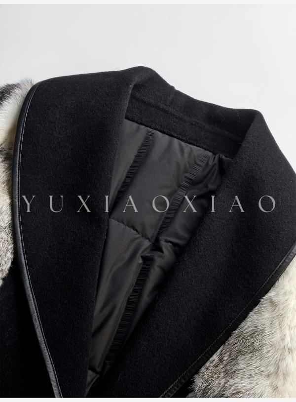 余潇潇【禁忌女王】山羊绒桑蚕丝混纺拼黑十字貂翻领长款水貂羽绒服