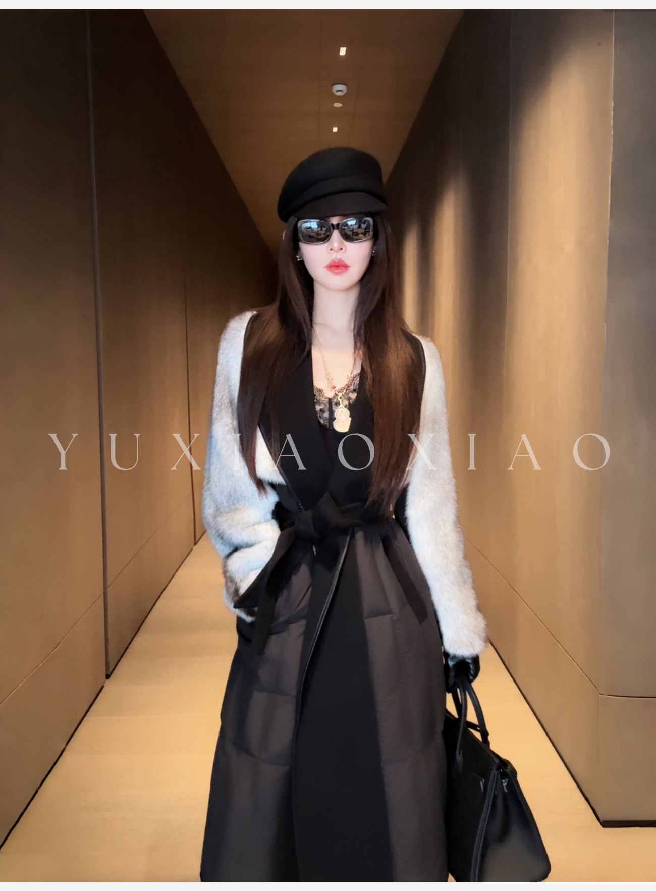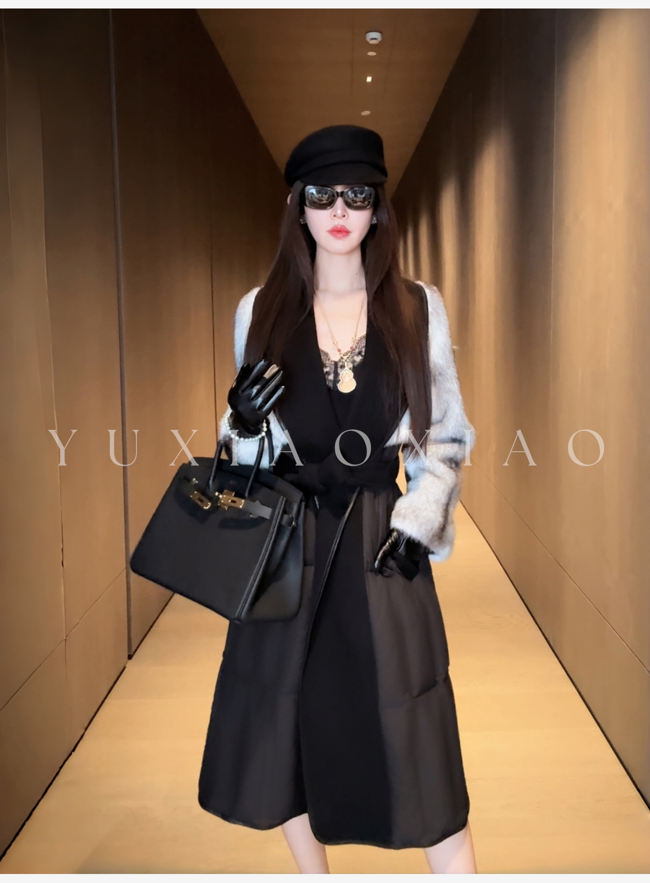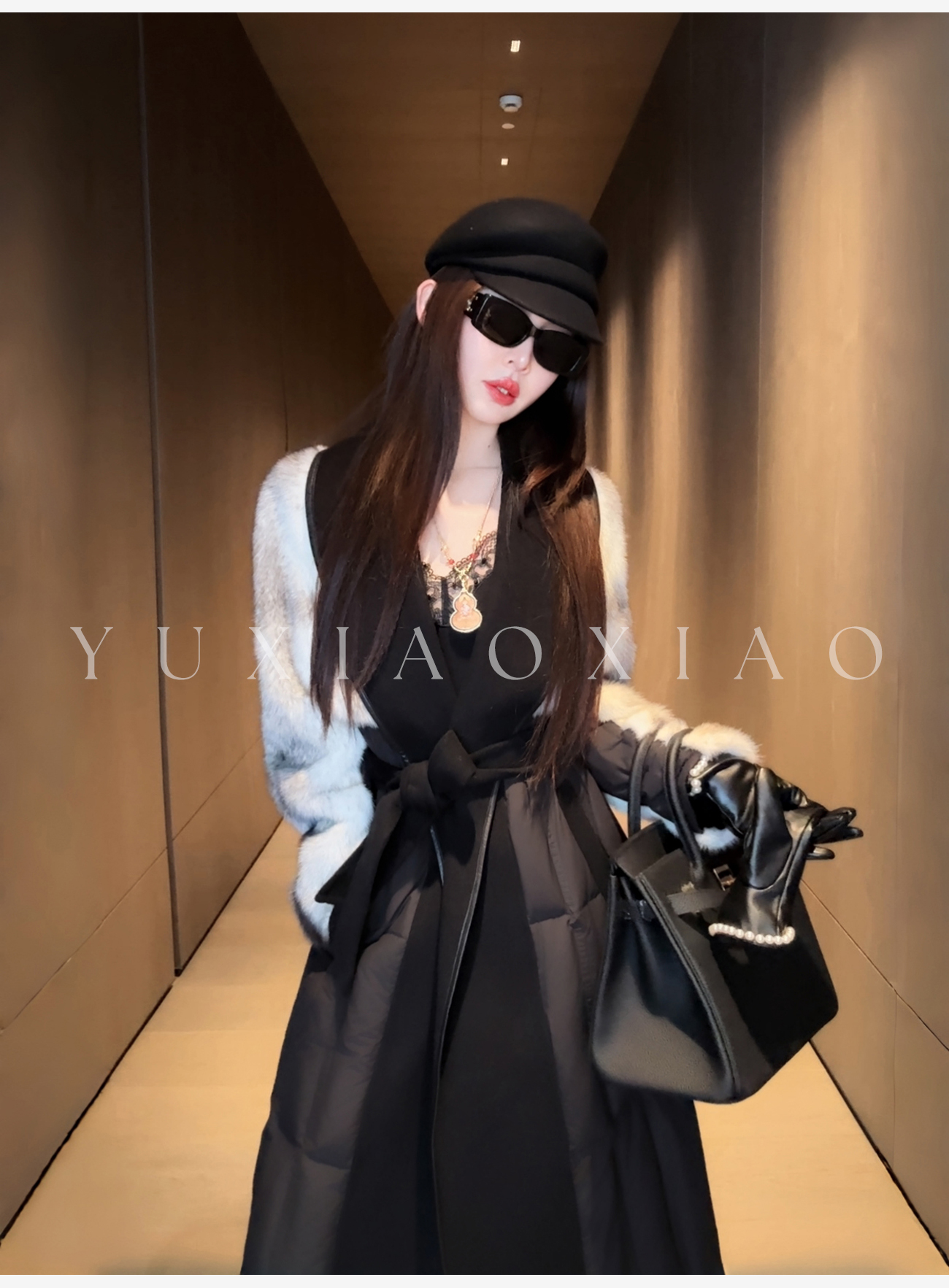 余潇潇【禁忌女王】山羊绒桑蚕丝混纺拼黑十字貂翻领长款水貂羽绒服
