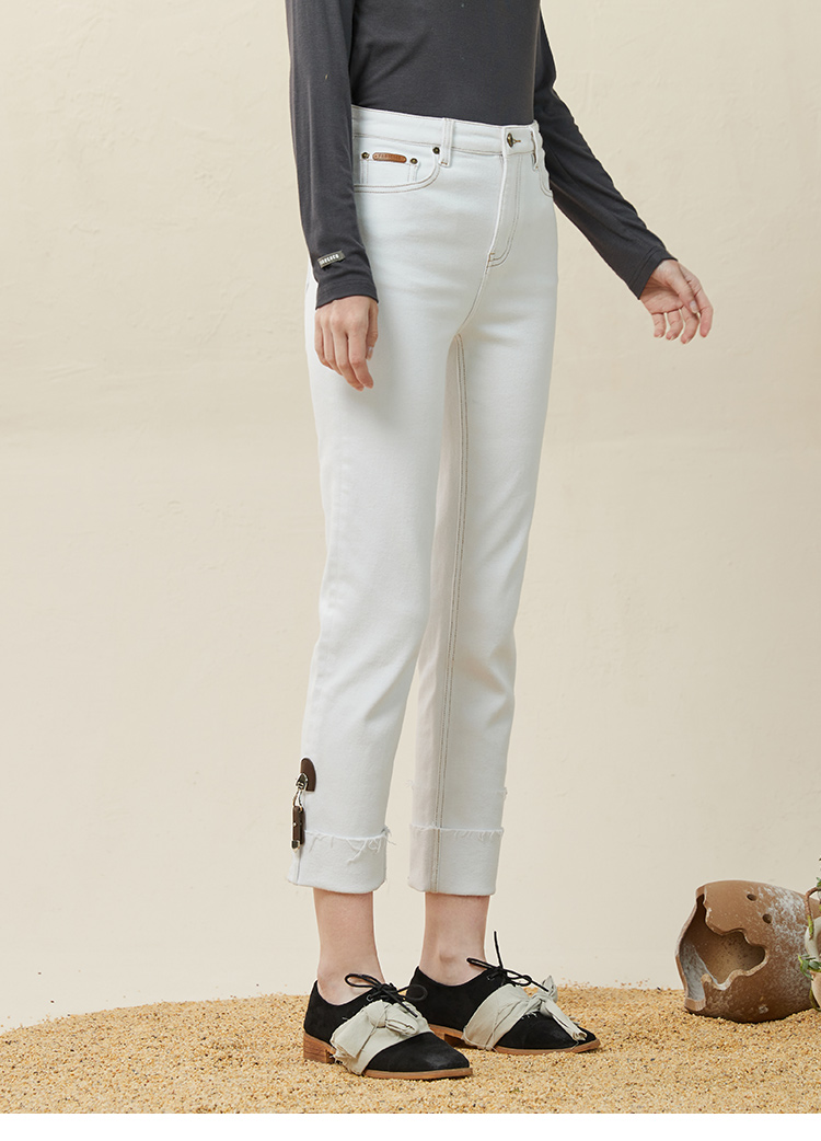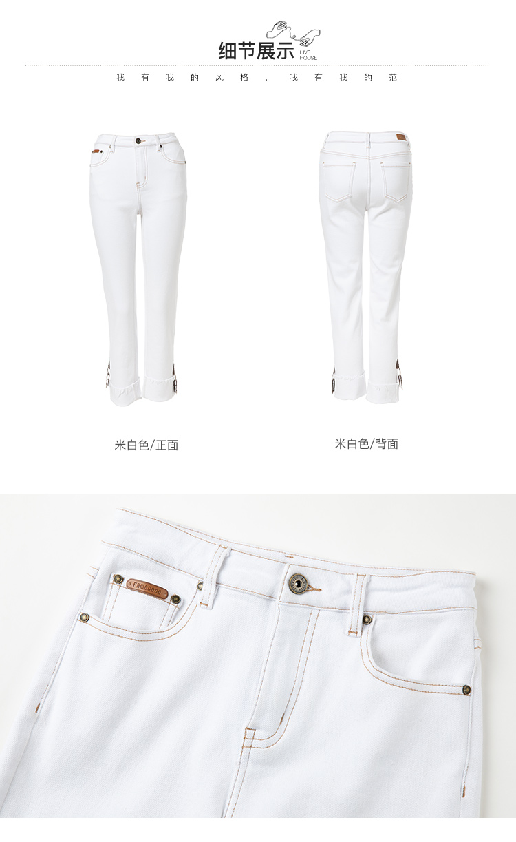 Famecoco范可儿直筒翻边牛仔裤女冬丹宁拼接pu皮袢九分裤F228GA014