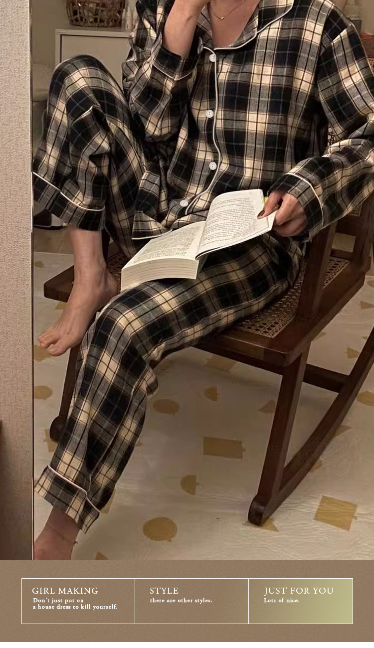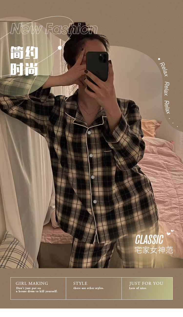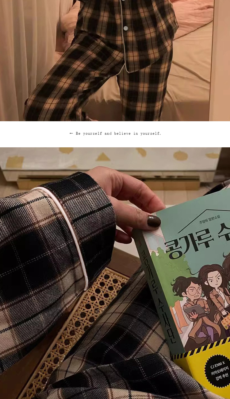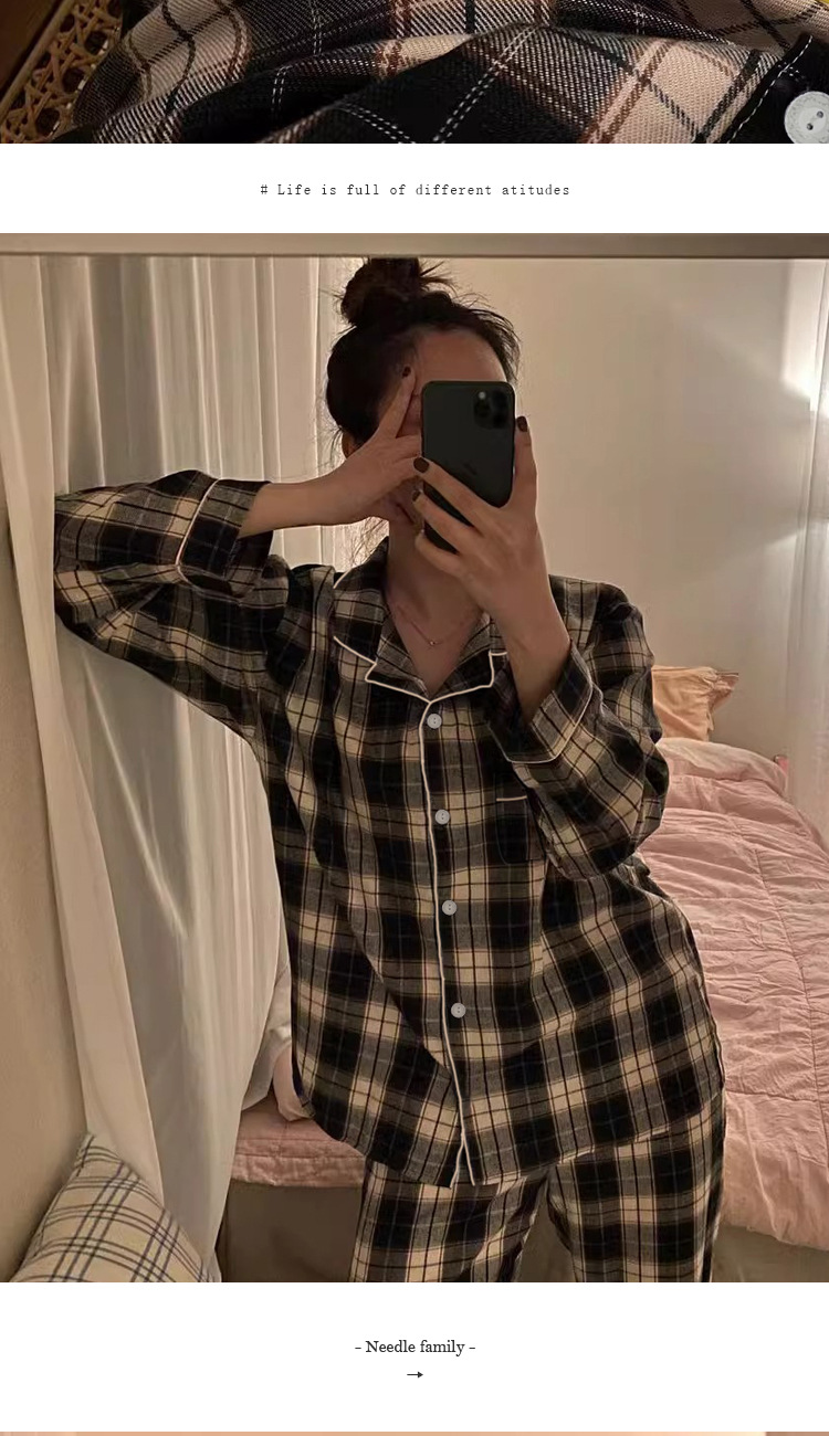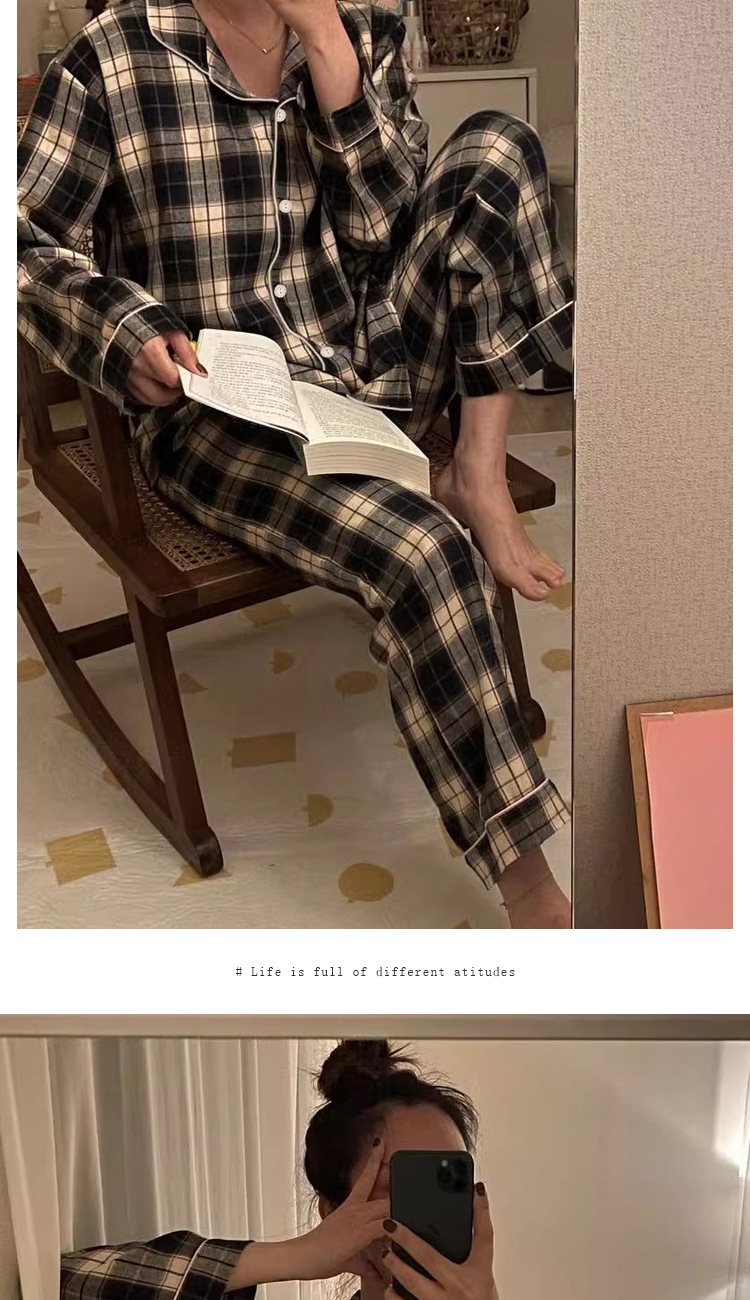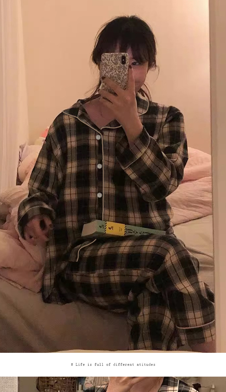 【睡觉也要满满仪式感】ins日系休闲睡衣女秋季薄款少女家居舒适格纹翻领开衫两件套,轻薄舒适,格纹少女风格。ry