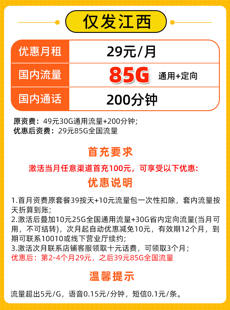 【只发四川】联通29元/月210G通用流量 1200分钟