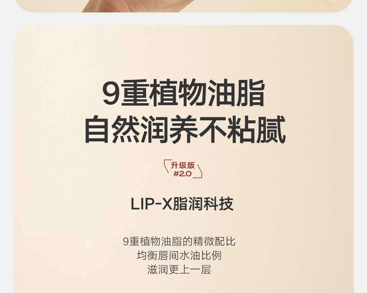 看它的成分表,感觉不像是在看唇膏,更像是国际大牌的护肤精华。它的核心成分选用了几款奢华珍贵的植物籽油、天然蜂蜡和树蜡(目前润唇膏原料里的最高级别,市面肯下本用天然的蜂蜡和树蜡的太少了,大多用的都是成本低的石蜡和地蜡),还有一堆修护、保湿成分。 它淡黄色的膏体,全都来自9种珍贵的天然植物油脂。为了给脆弱的嘴巴加强水润,还添加了微囊包裹透明质酸钠,以及最新一代的保湿剂糖脂来讲水分牢牢锁住。