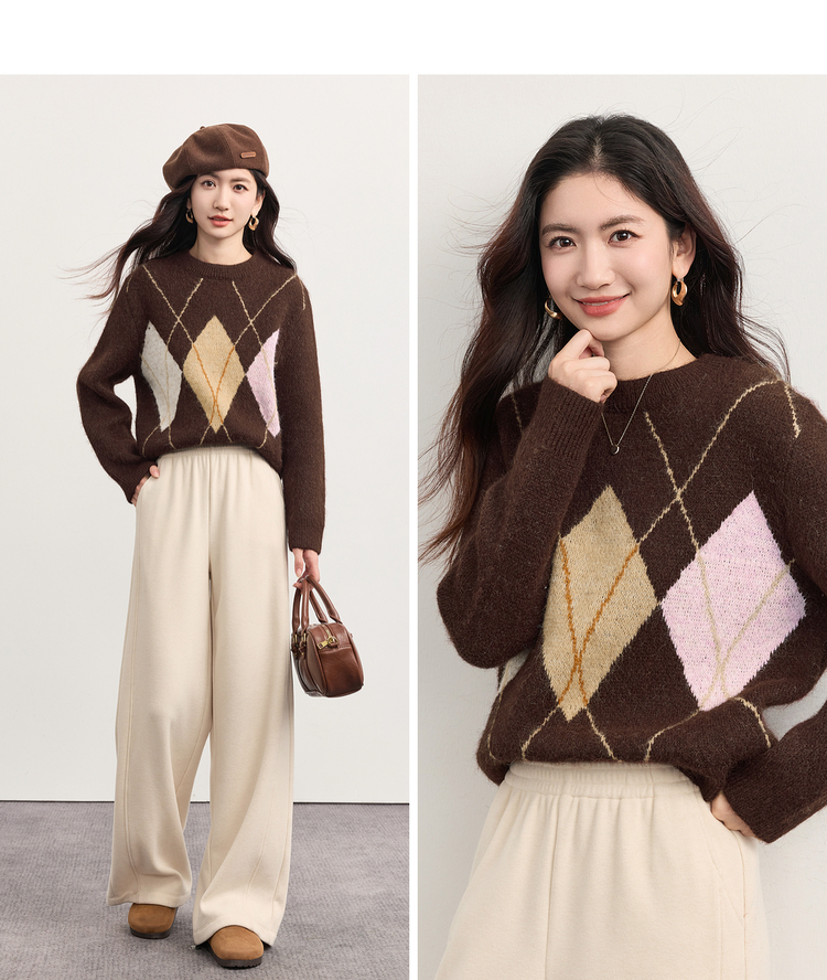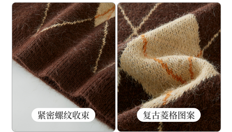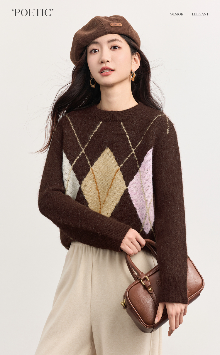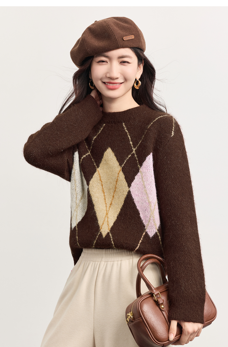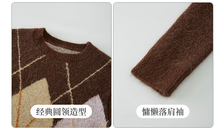 【11/14新品】熙世界miu系学院撞色菱格毛衣女25秋冬新款慵懒风正肩圆领针织衫
