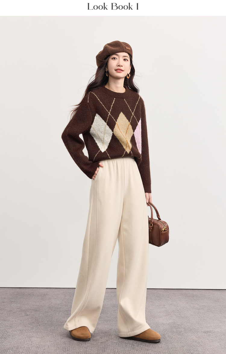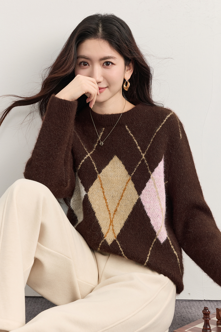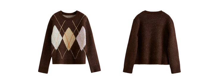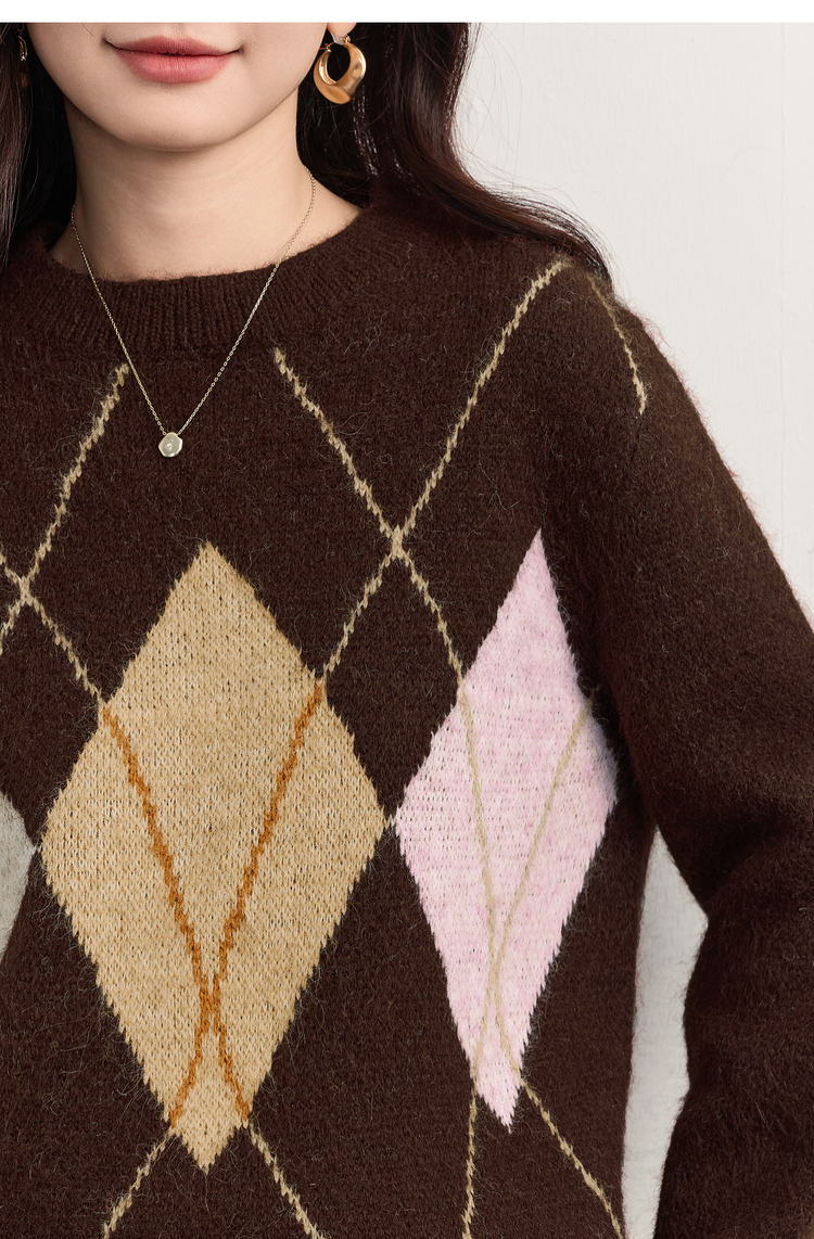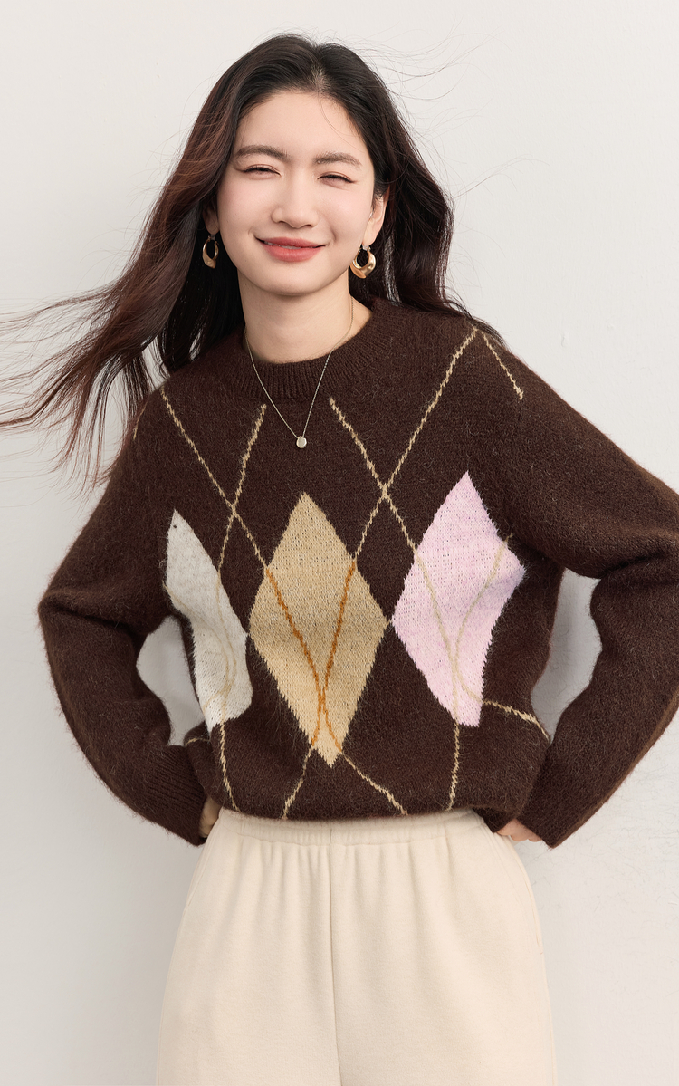 【11/14新品】熙世界miu系学院撞色菱格毛衣女25秋冬新款慵懒风正肩圆领针织衫