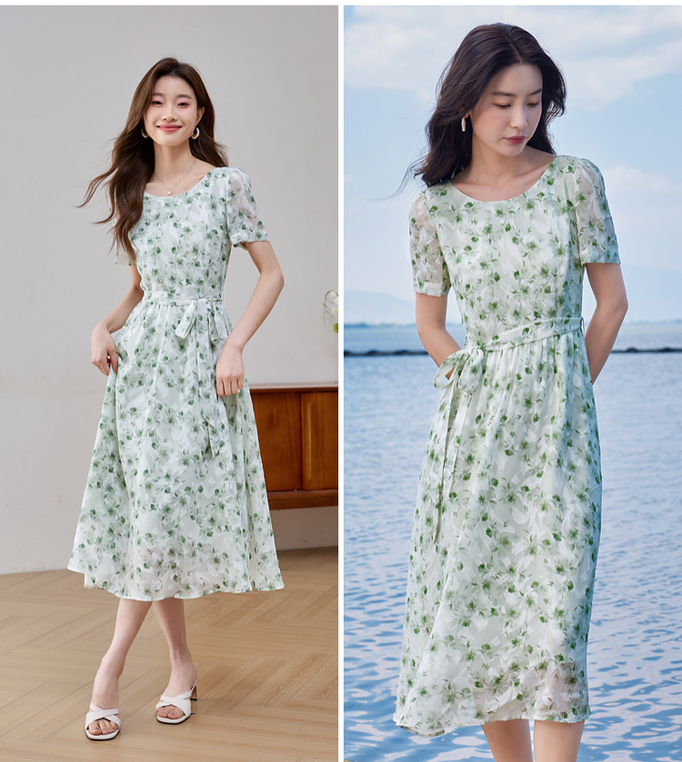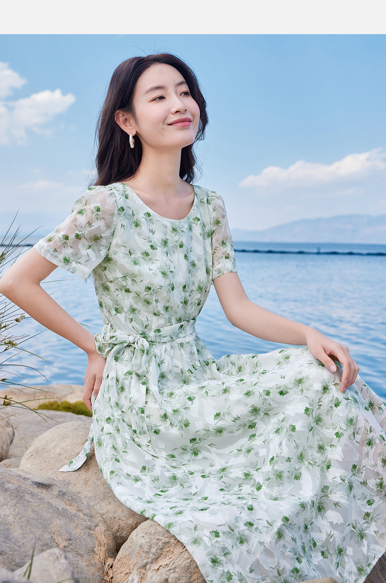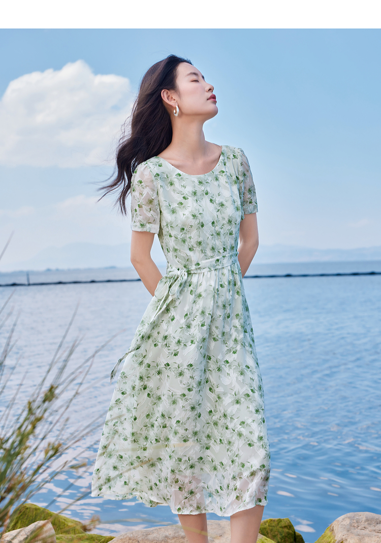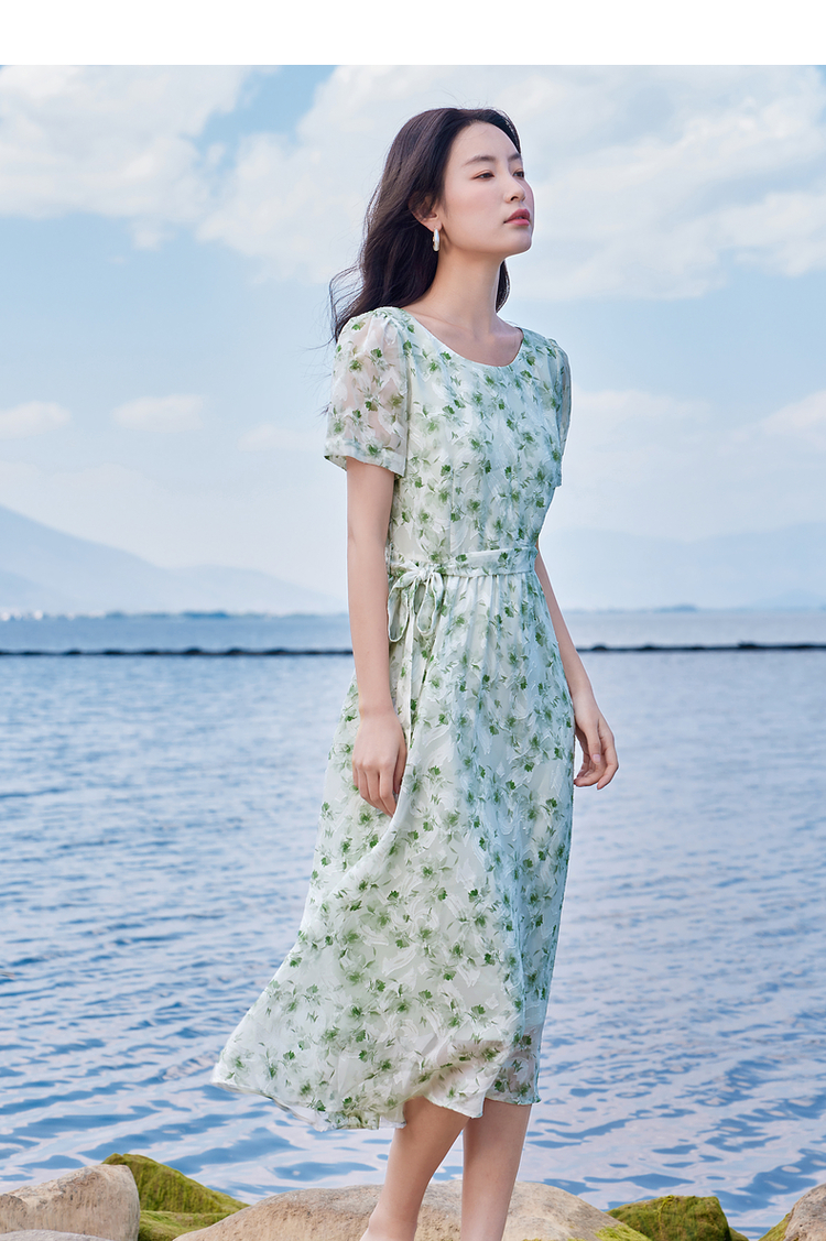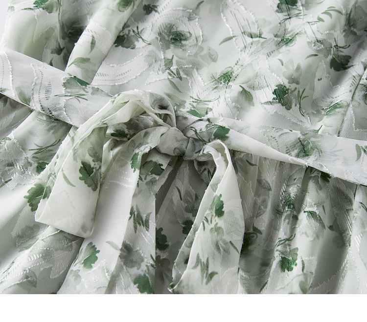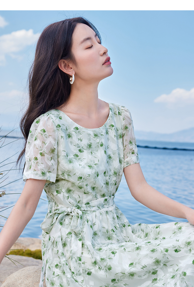 【专属特价】熙世界薄荷曼波绿色碎花连衣裙夏新款海边度假气质收腰雪纺裙子