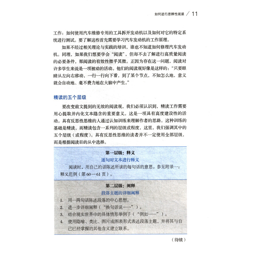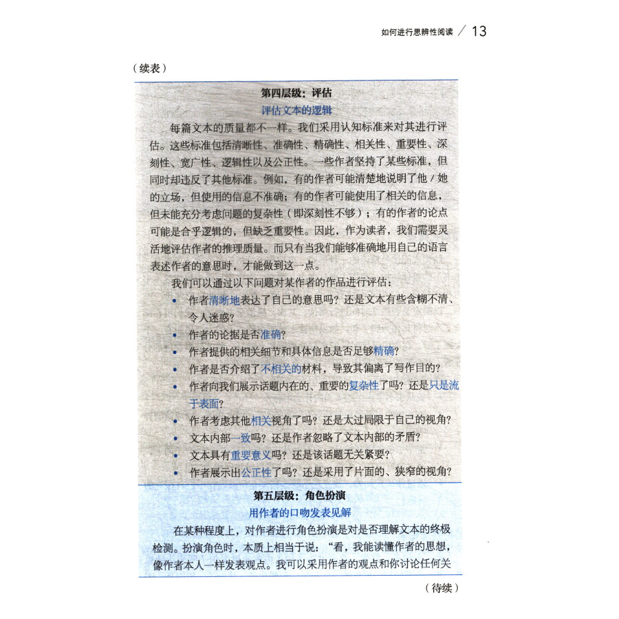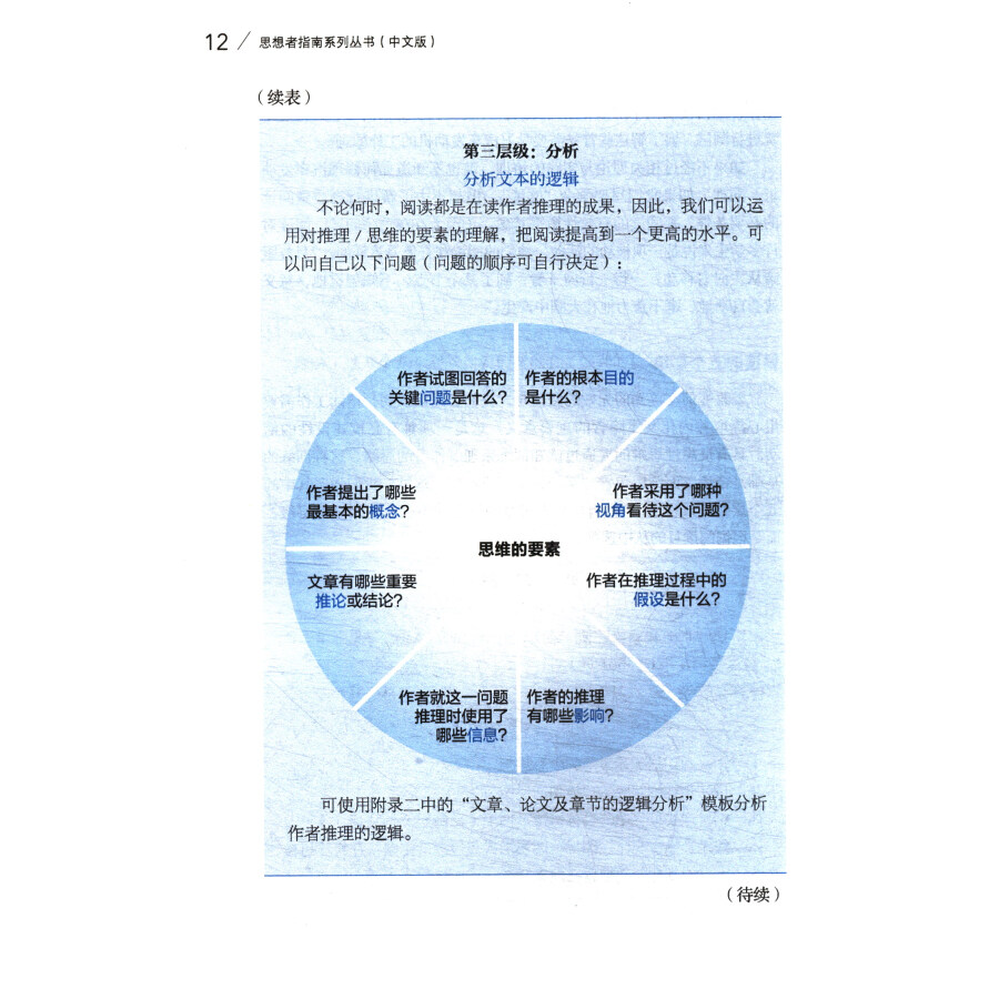 首先,学习者应该了解思辨的基本特点和理论框架。根据理查德-保罗和琳达-埃尔德(Linda Elder)的研究,所有的推理都有一个目的,都试图澄清或解决问题,都基于假设,都从某一视角展开,都基于数据、信息和证据,都通过概念和观念进行表达,都通过推理或阐释得出结论并对数据赋予意义,都会产生影响或后果。分析一个推理或论述的质量或有效性,意味着按照思辨的标准进行检验,这个标准包括清晰性、准确性、精确性、相关性、深刻性、宽广性、逻辑性、公正性、重要性、完整性等维度。一个拥有思辨能力的人具备八大品质,包括诚实、谦虚、相信理性、坚忍不拔、公正、勇气、同理心、独立思考。