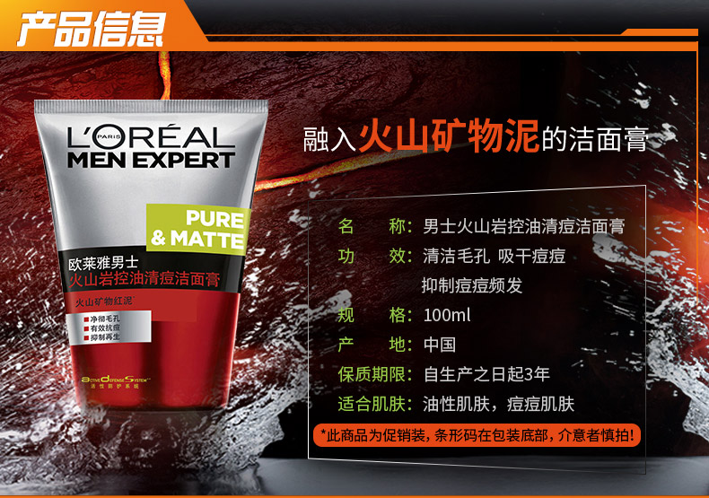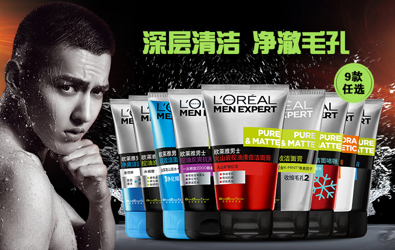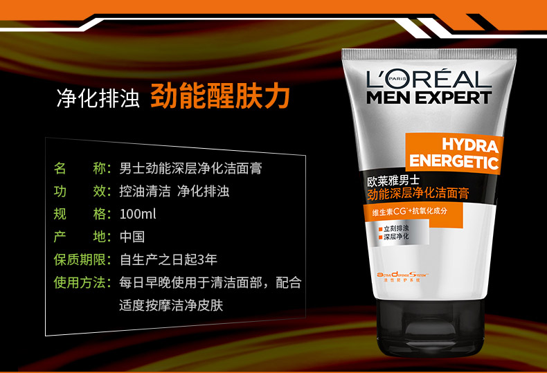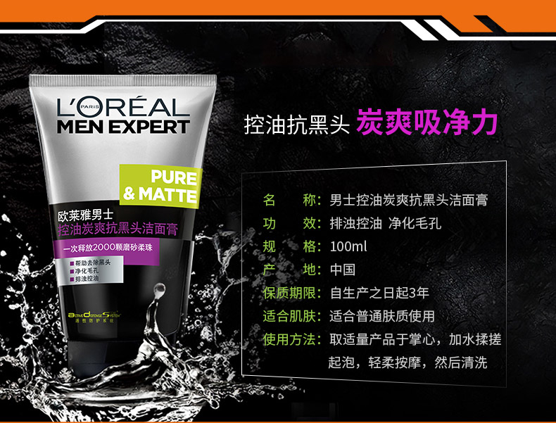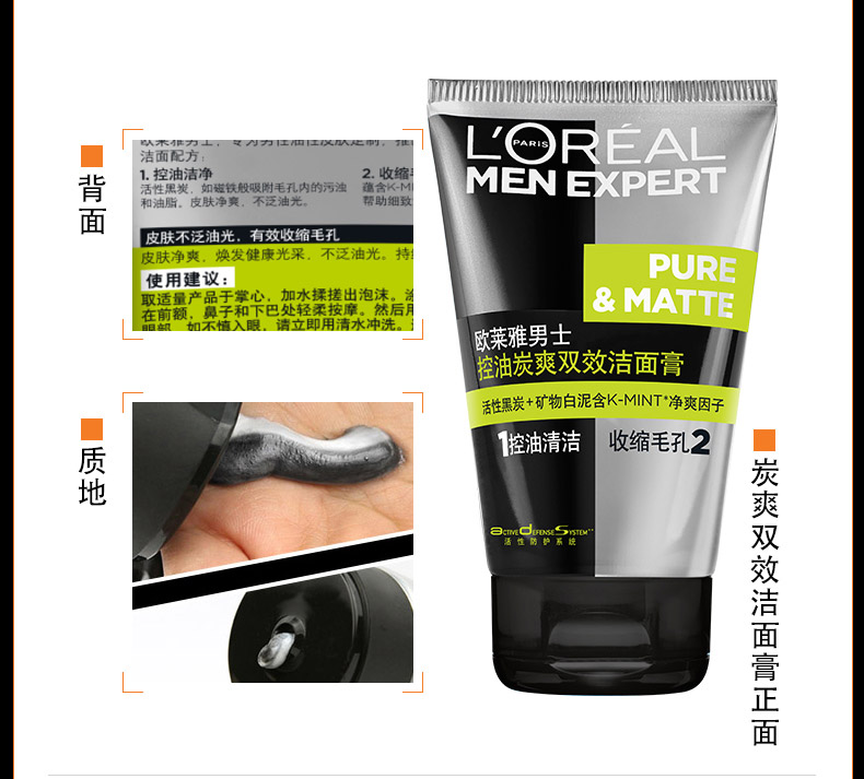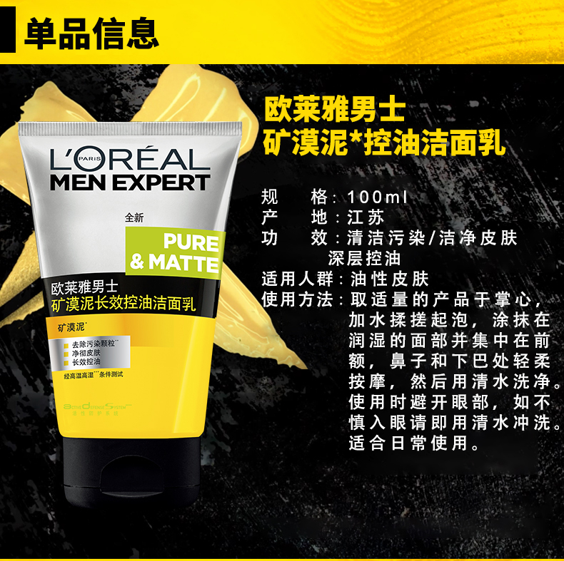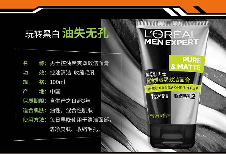 欧莱雅男士(控油碳爽抗黑头/矿漠泥长效控油) 洁面膏100ml
