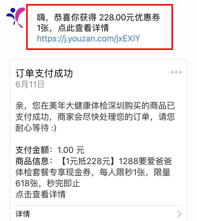 方法1: 下单成功后,【美年大健康深圳】微信公众号会推送现金券链接,您可以点击查看; 如下图: