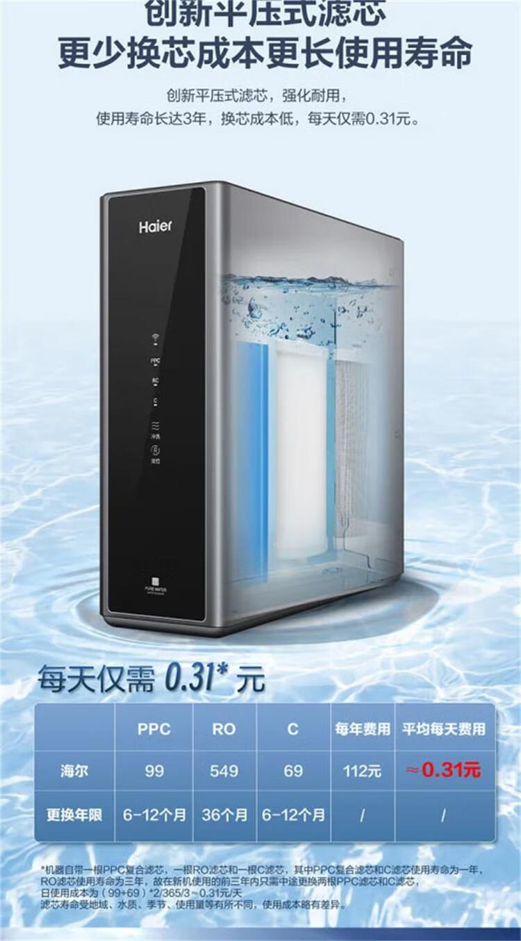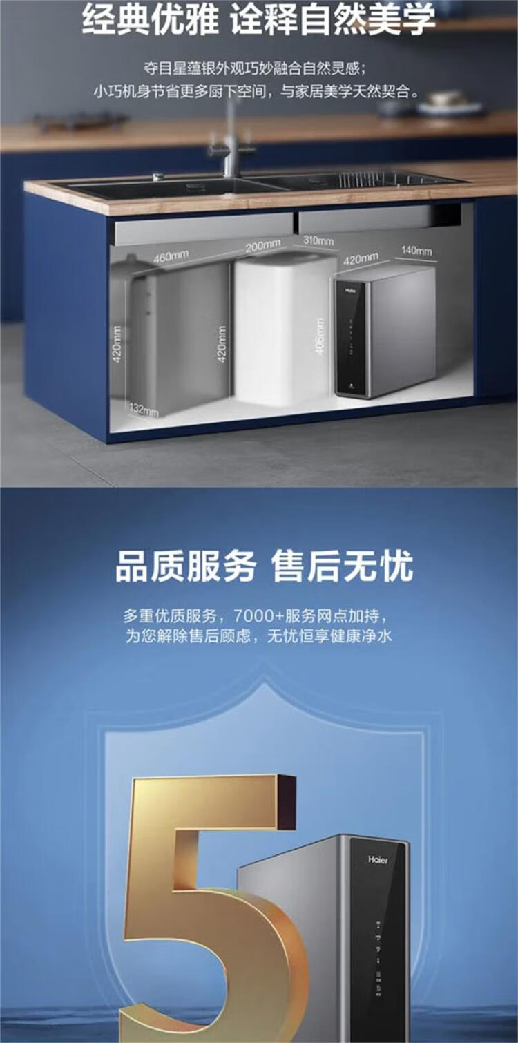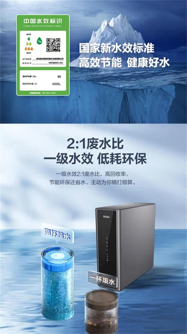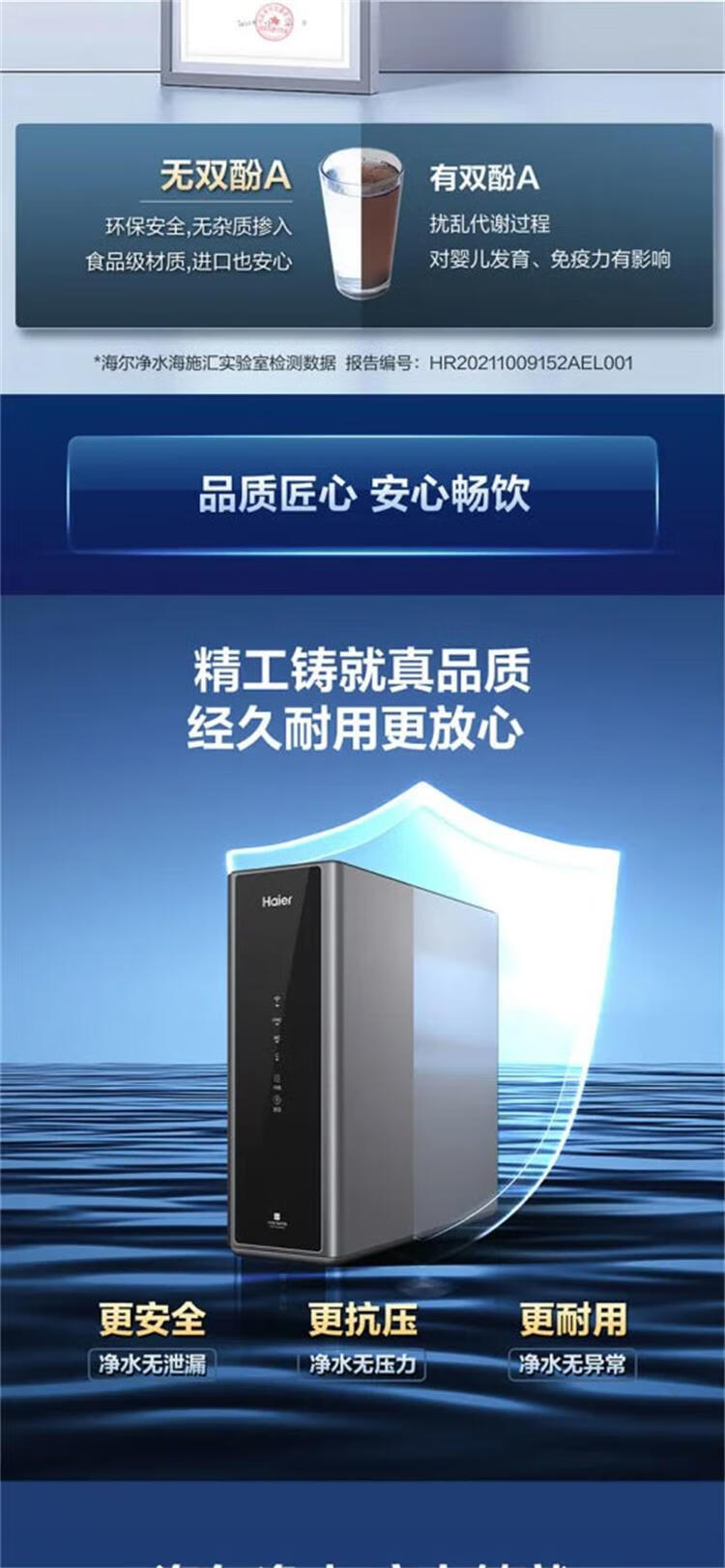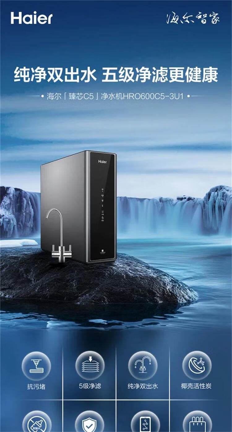海尔(haier)海尔净水器HRO600C5-3U1家用600G纯净双出水长效RO膜反渗透抗污堵 HRO600C5-3U1
