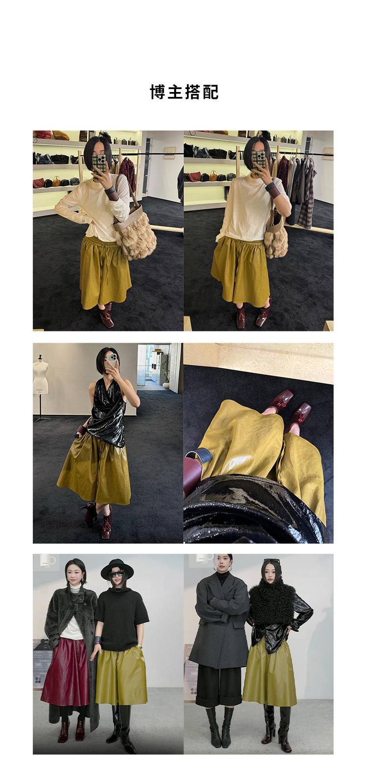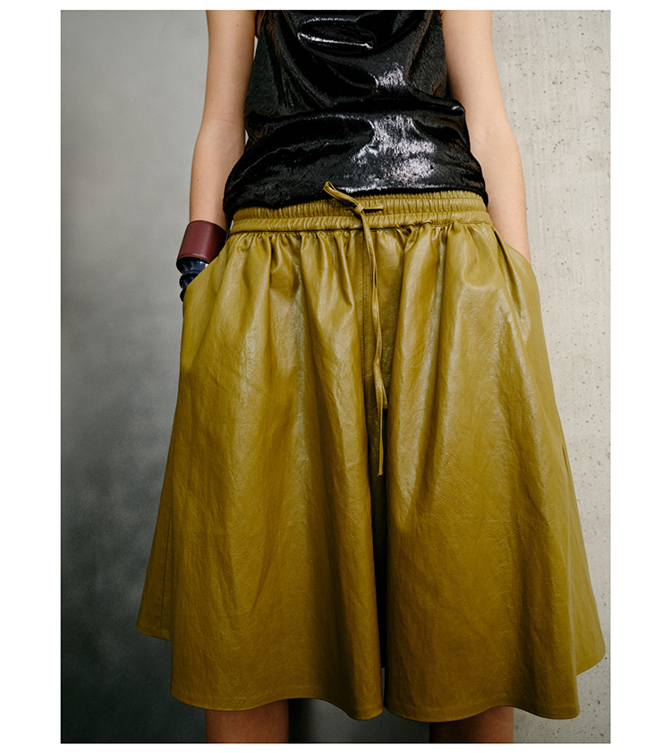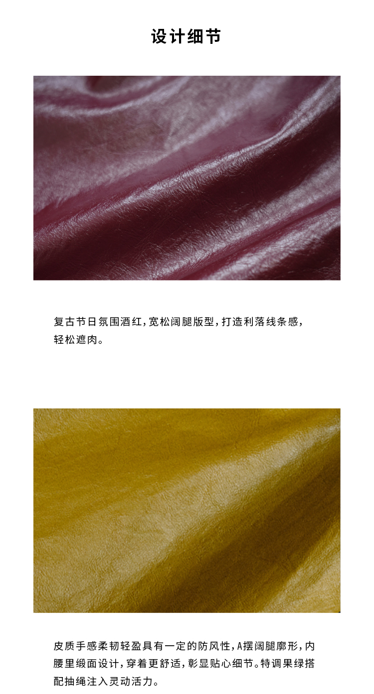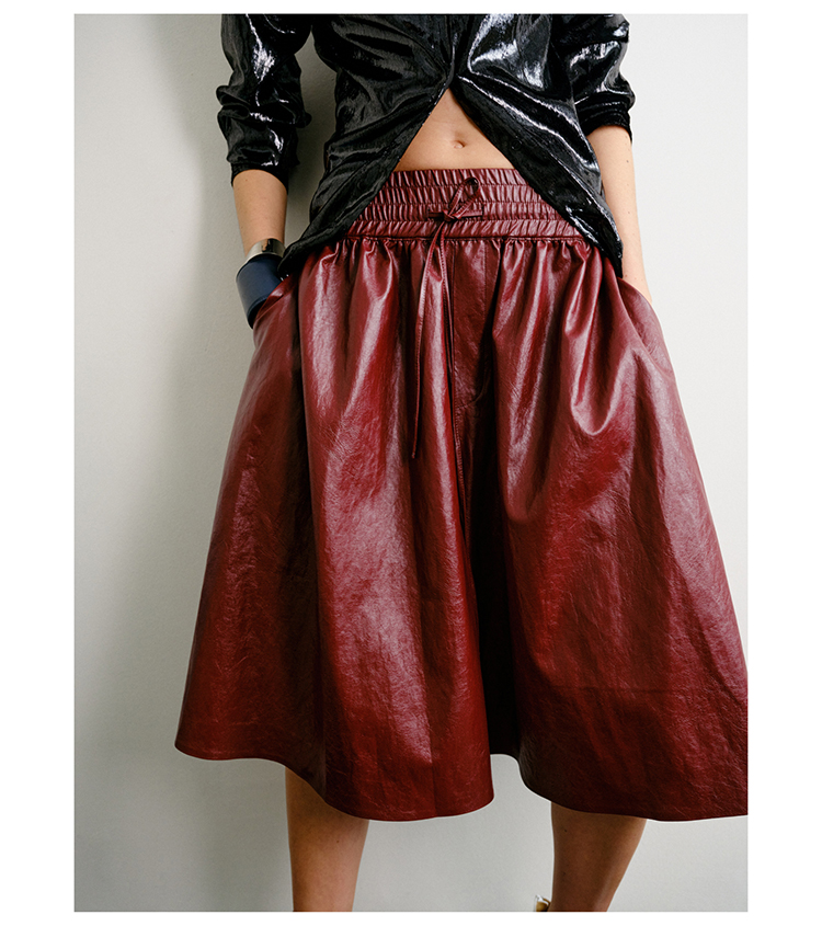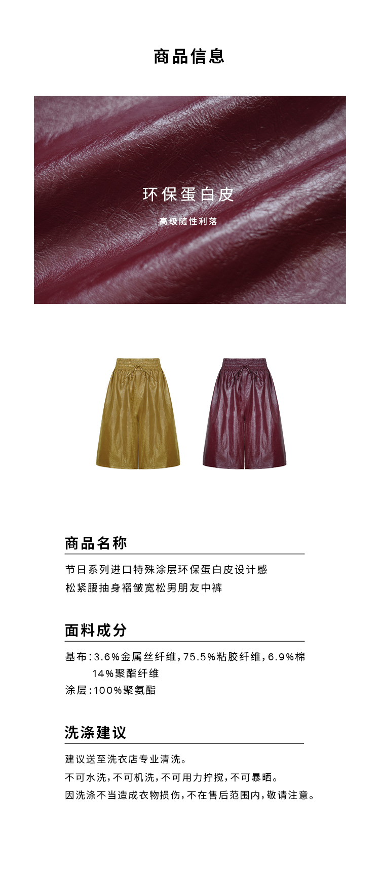 HIDEMI 【当当同款】节日系列进口特殊涂层环保蛋白皮设计感松紧腰抽身褶皱宽松男朋友中裤 勃艮第酒红/橄榄绿