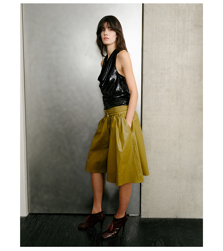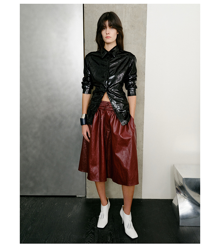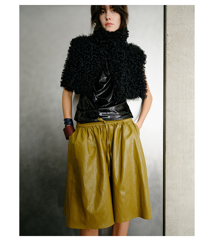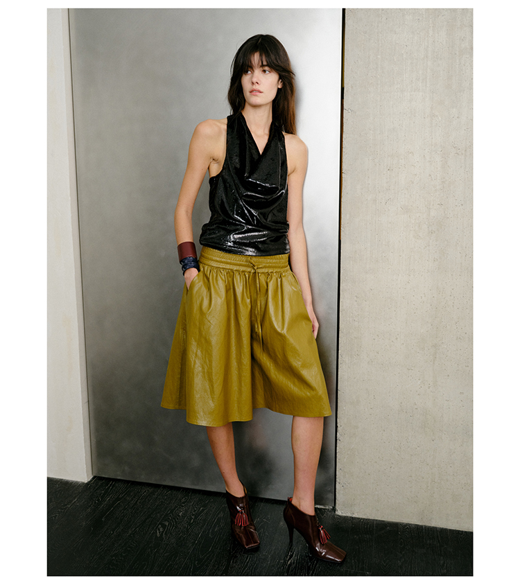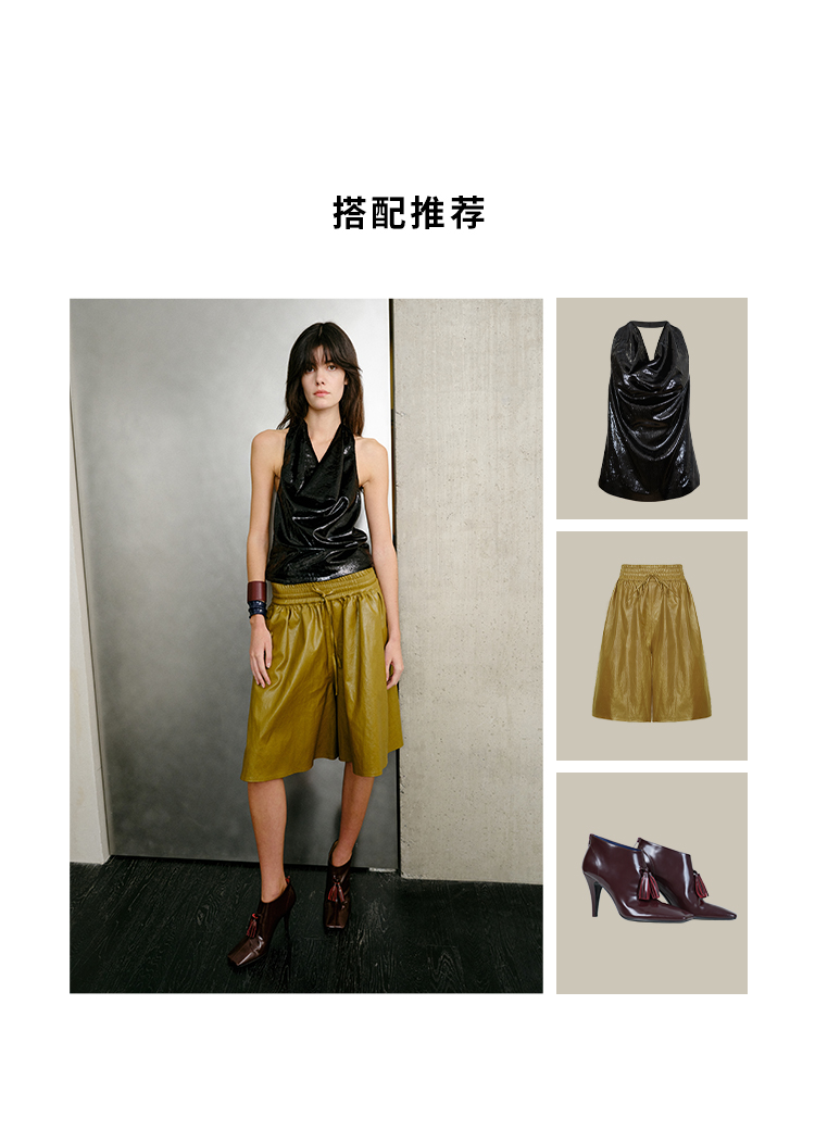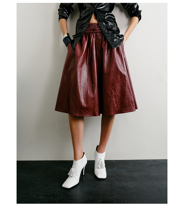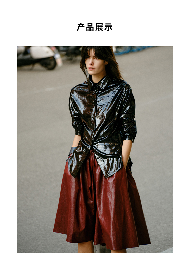 HIDEMI 【当当同款】节日系列进口特殊涂层环保蛋白皮设计感松紧腰抽身褶皱宽松男朋友中裤 勃艮第酒红/橄榄绿