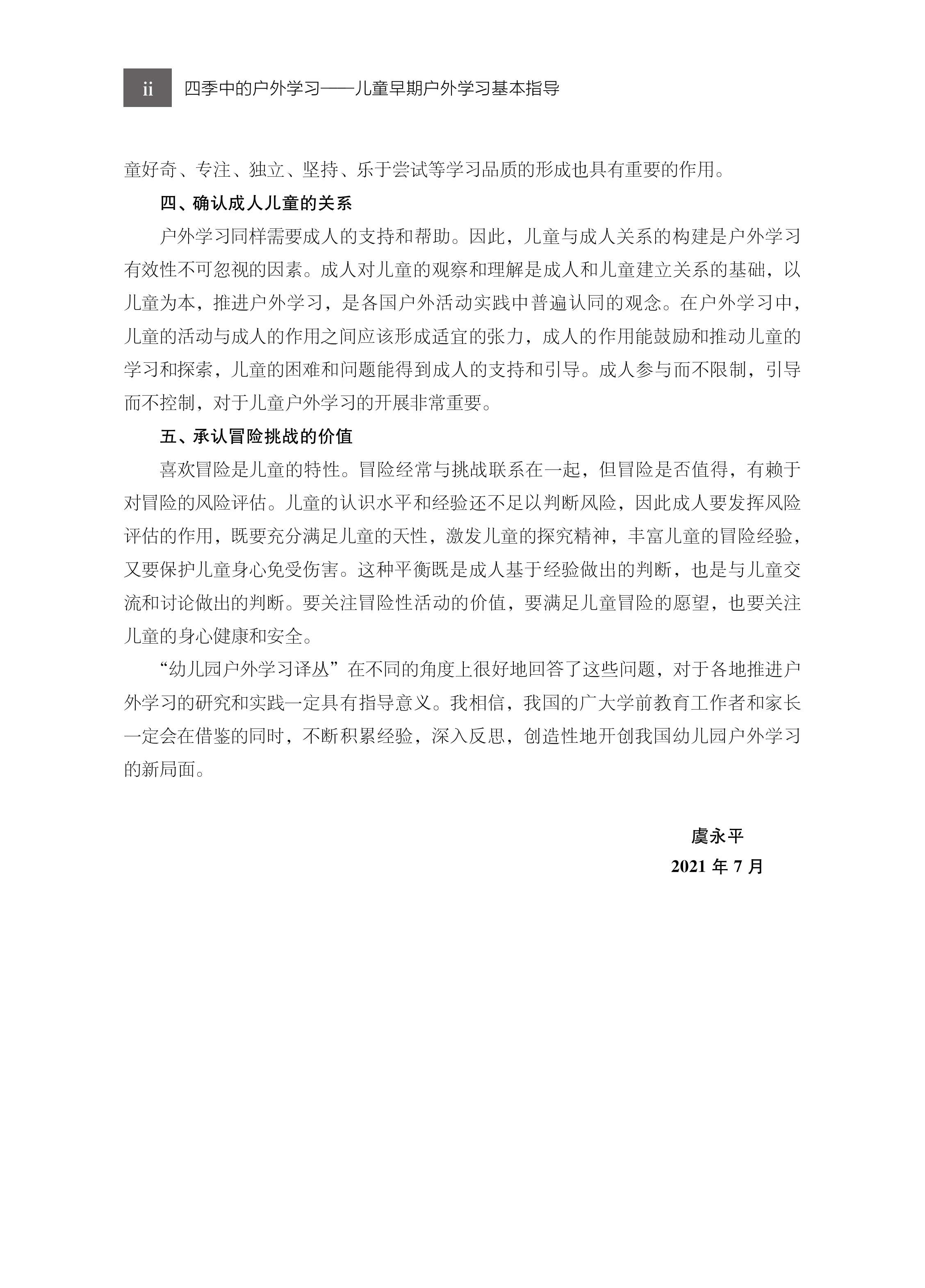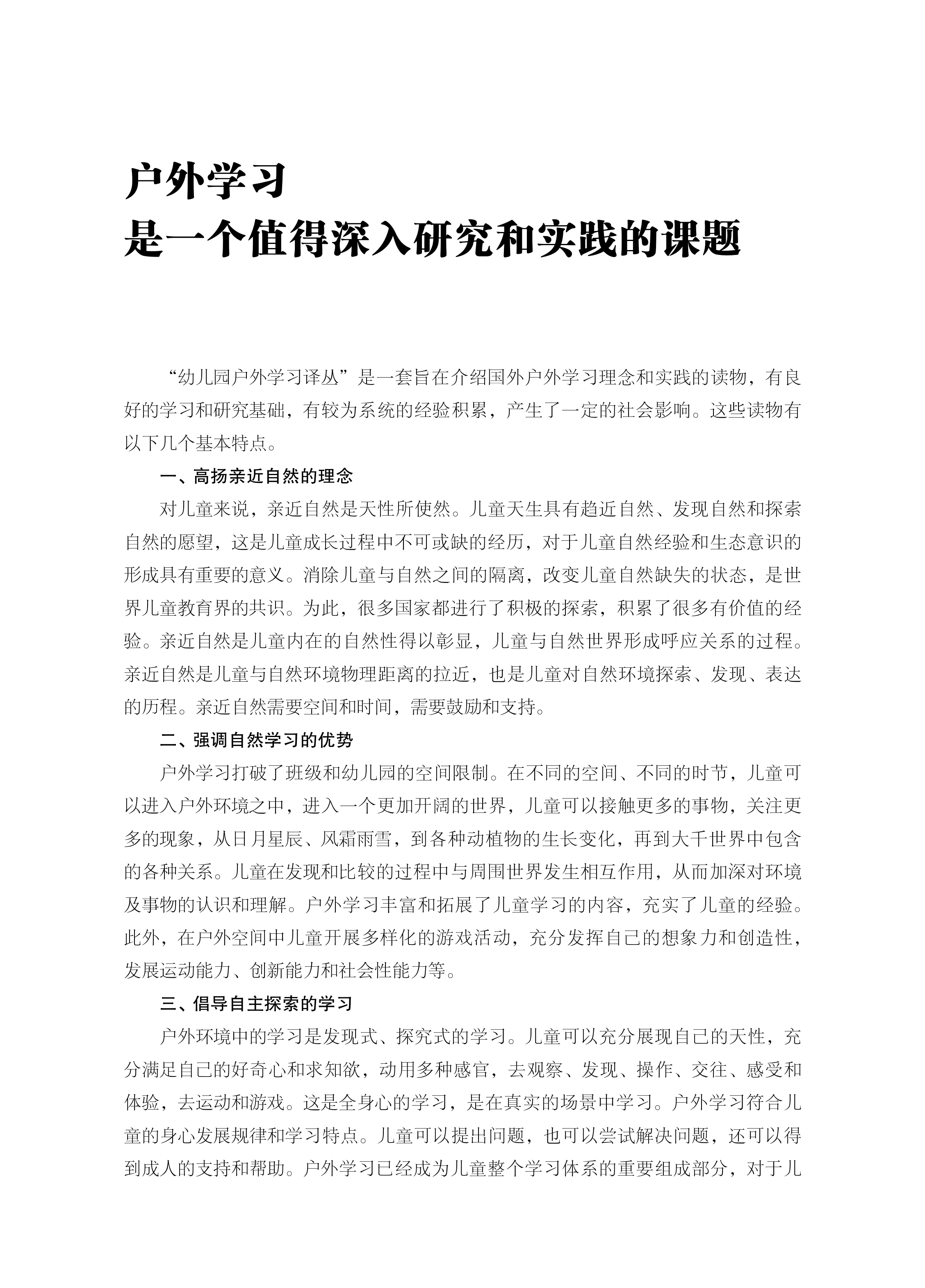 “幼儿园户外学习译丛”是一套旨在介绍国外户外学习理念和实践的读物,有良好的学习和研究基础,较为系统的经验积累,产生了一定的社会影响。这些读物高扬亲近自然的理念、强调自然学习的优势、倡导自主探究的学习、确认成人儿童的关系、承认冒险挑战的价值。
