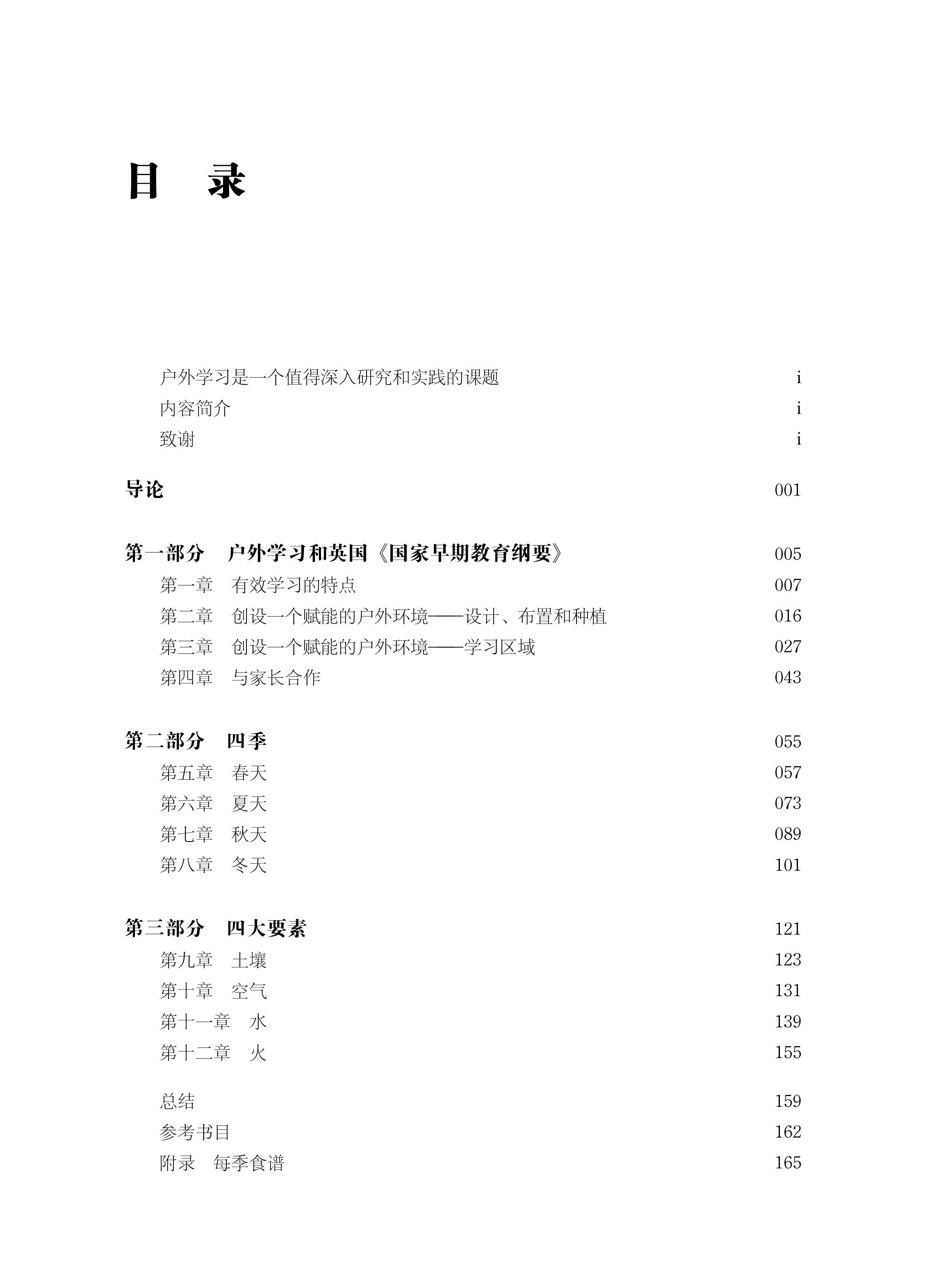 本书提供了一年四季带领儿童进行户外活动的详细指导,鼓励成人每天带领儿童到户外活动,以促进儿童对周围世界的认识,帮助儿童通过与环境互动来促进其学习与发展。书中援引了户外游戏对儿童早期发展意义的前沿研究,为开展有效的户外学习提供了指导,提供了与家长合作的建议,以及成人角色的定位,提供了故事、诗歌等资源清单以及四季食谱的附录。
