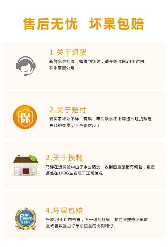 注:水果生鲜售后有保障,但不接受退货(拒签,延迟签收不售后),资料提交齐全,及时反馈,就能快速理赔。