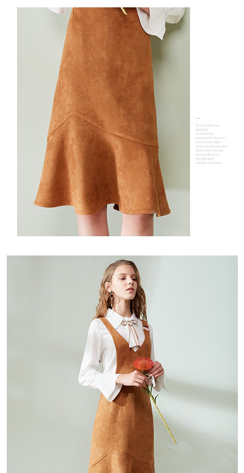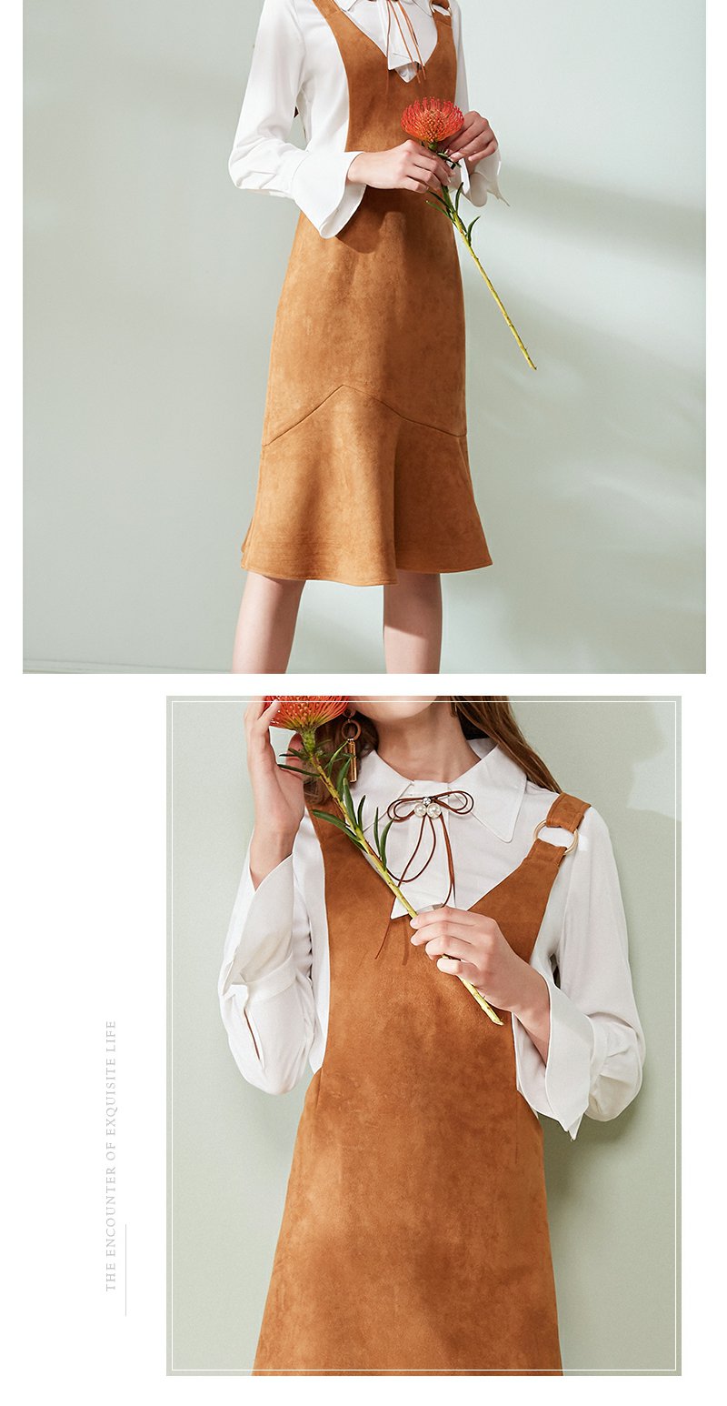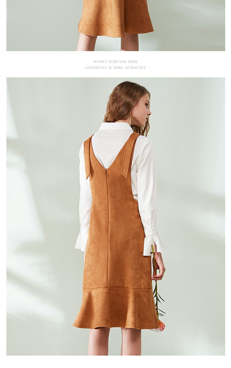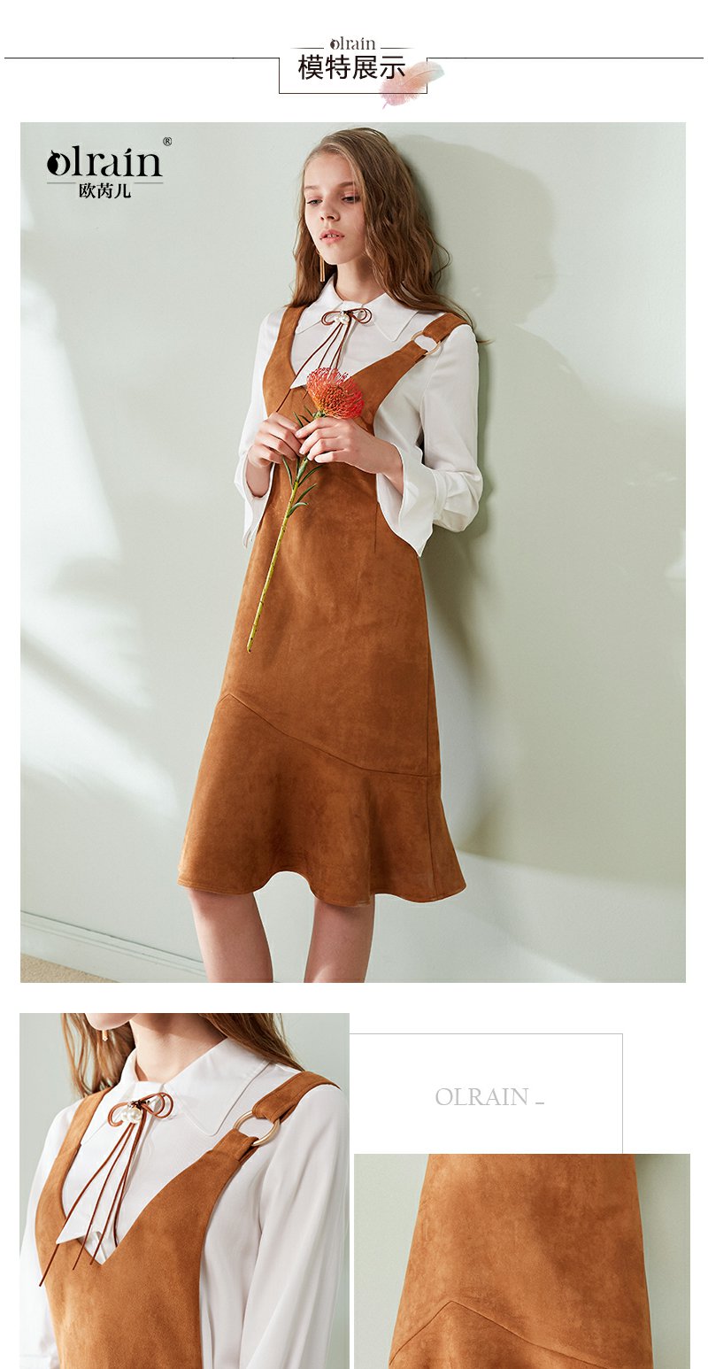 欧芮儿女装荷叶边麂皮绒无袖V领背带连衣裙女中长款