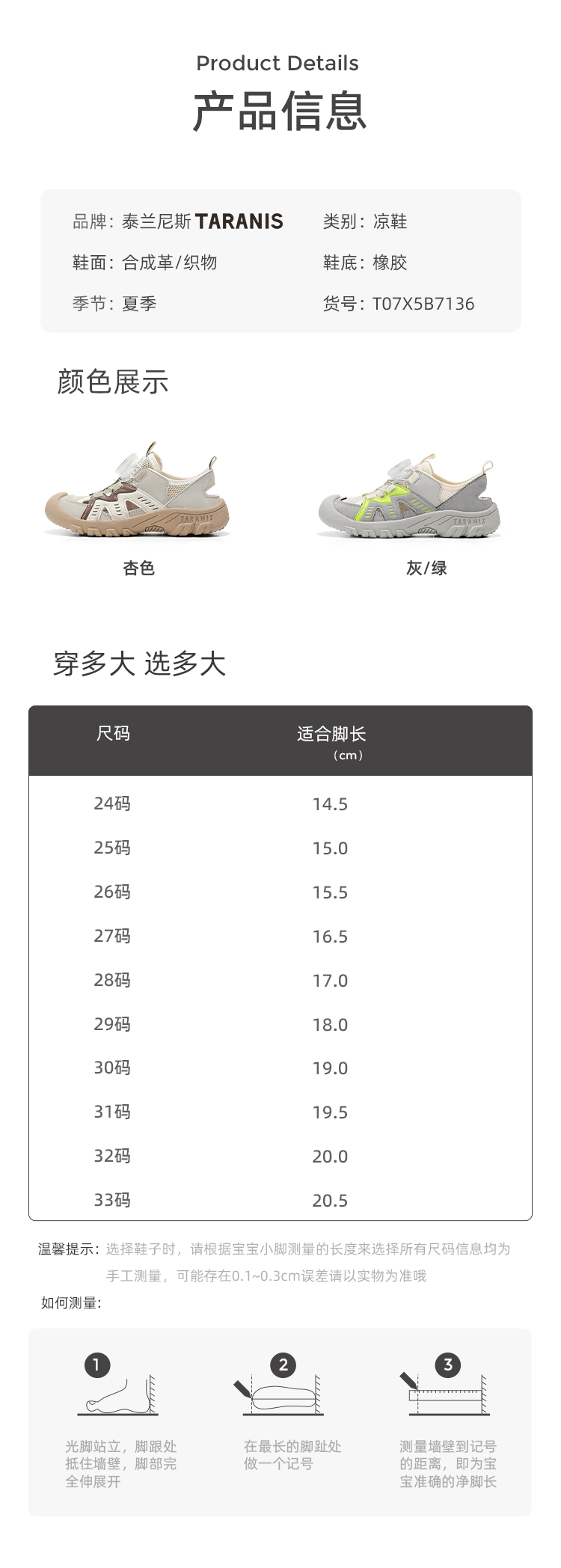 泰兰尼斯夏季小童段超轻户外溯溪鞋凉鞋T07X5B7136