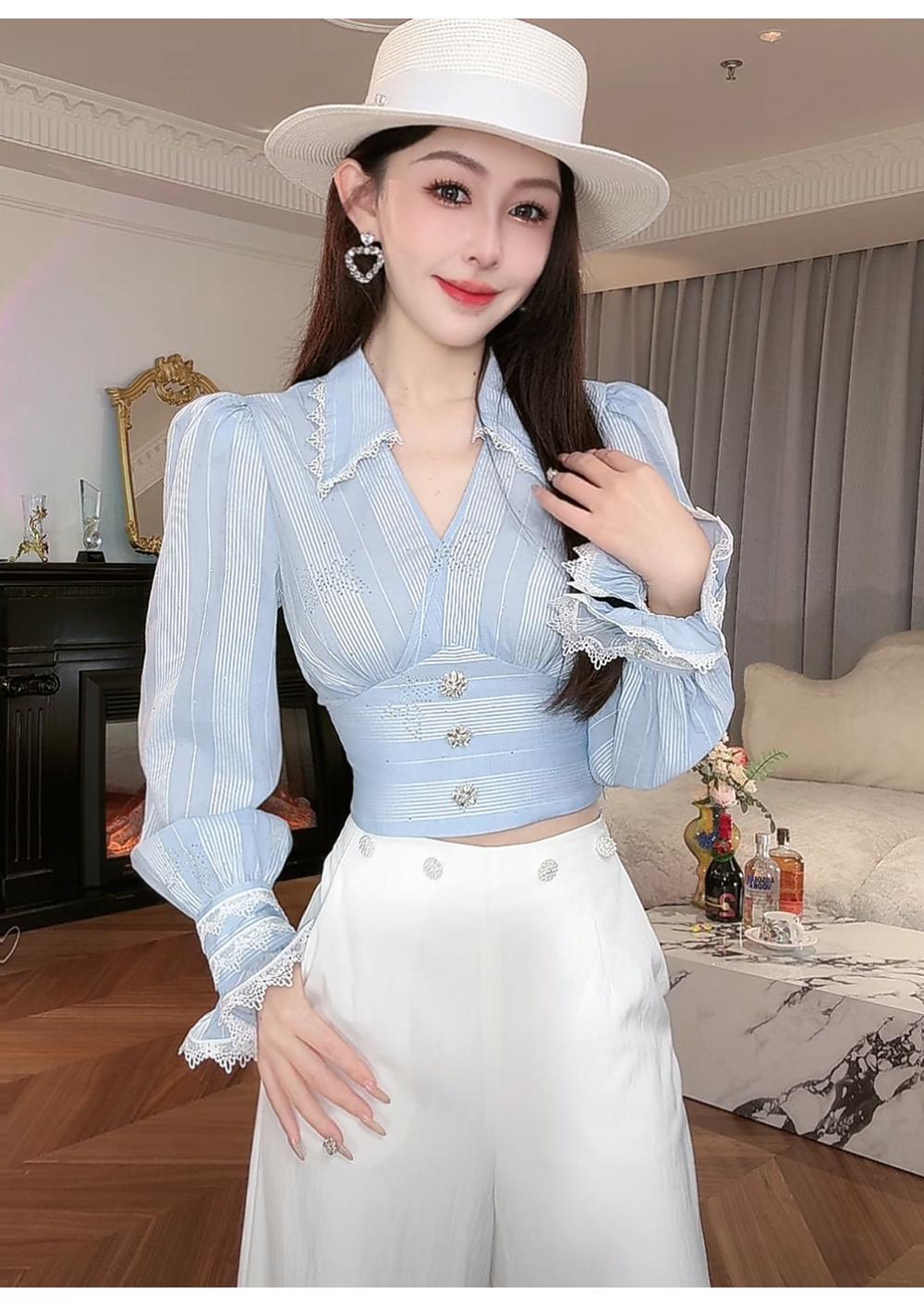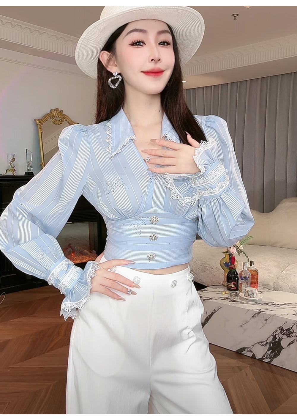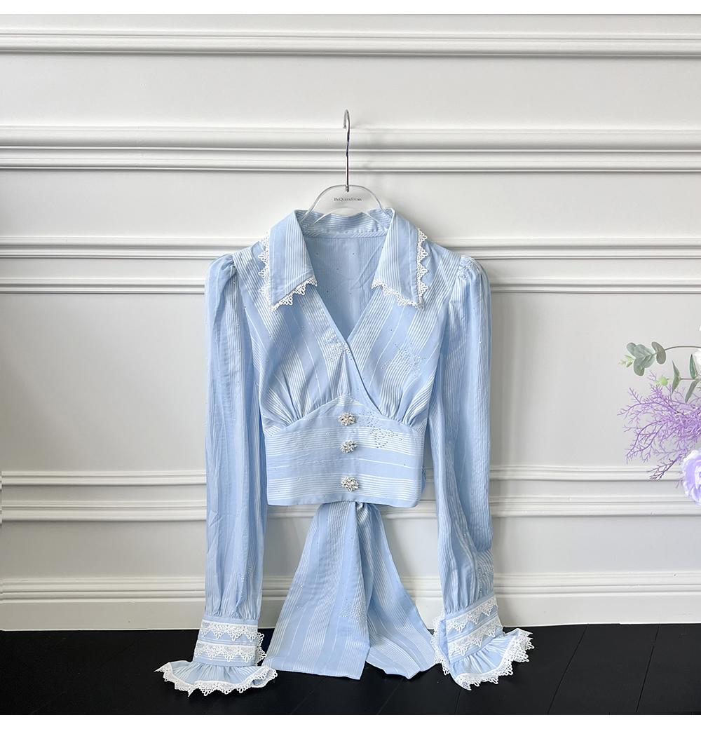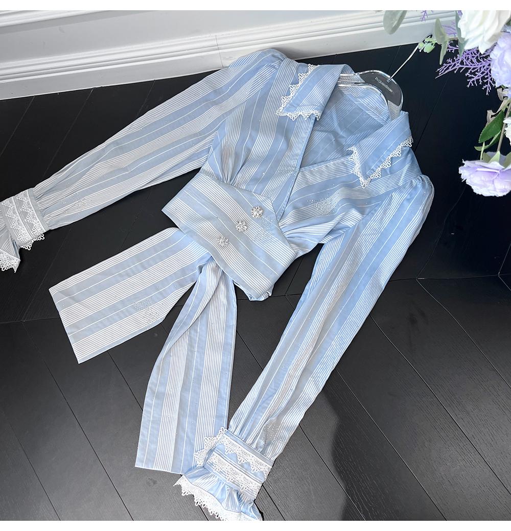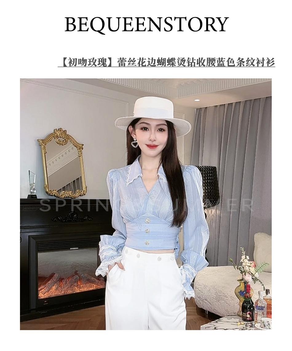 BeQueenStory【初吻玫瑰】设计感蕾丝花边烫钻收腰蓝色条纹衬衫