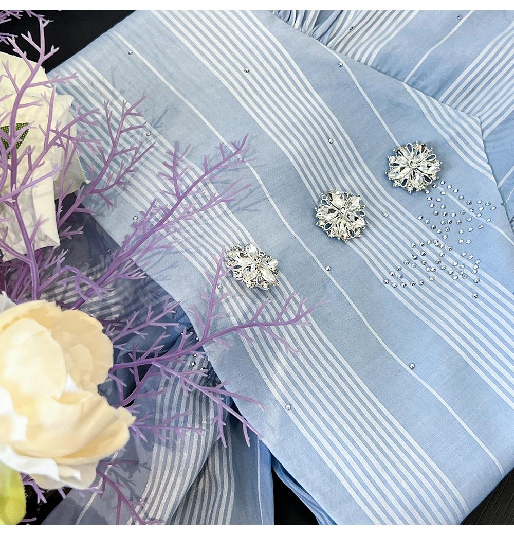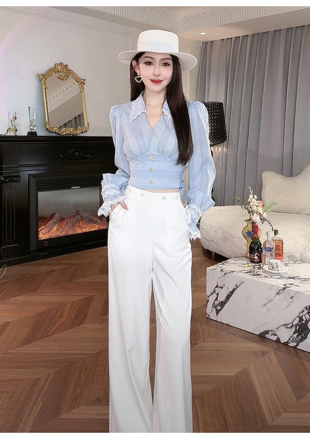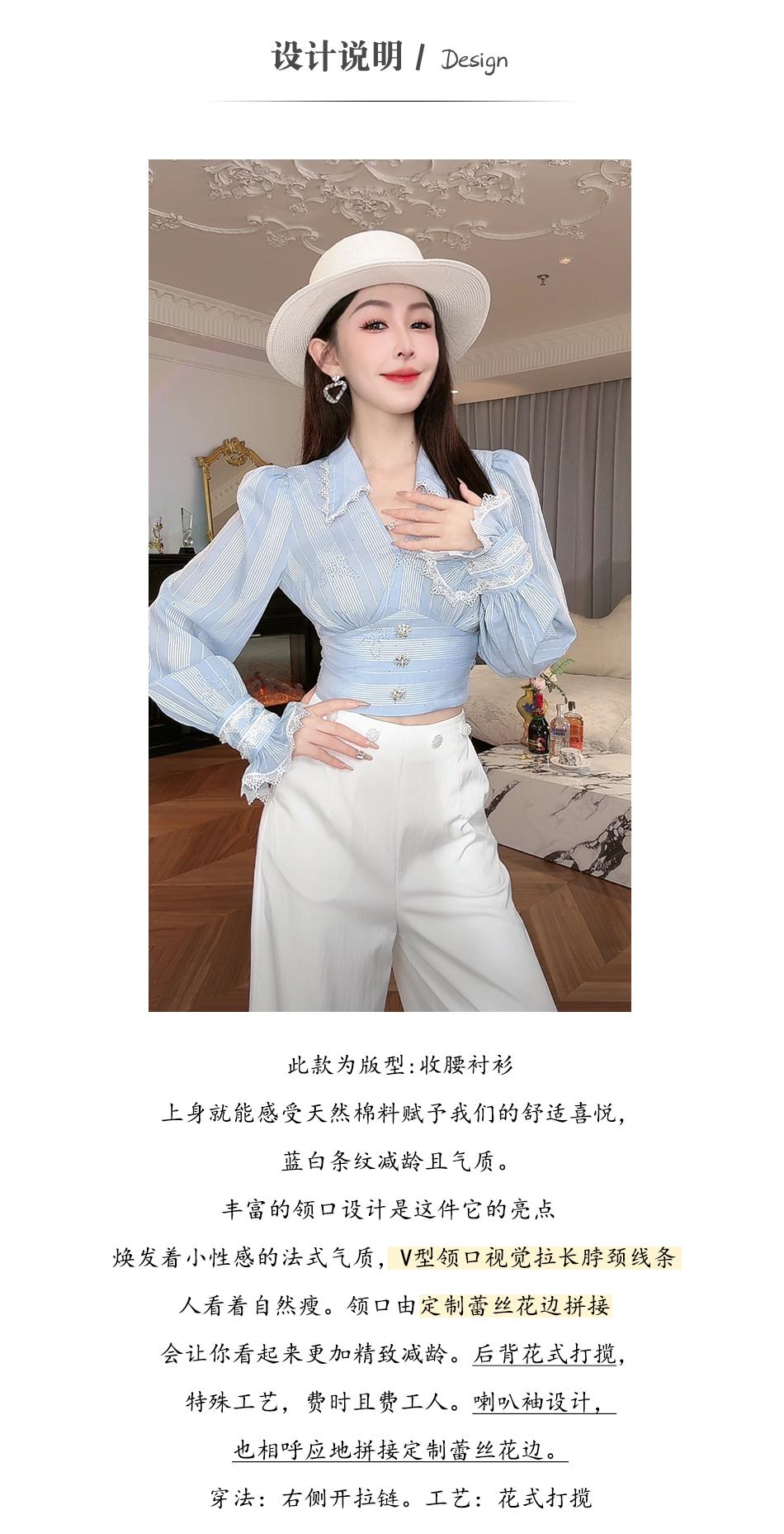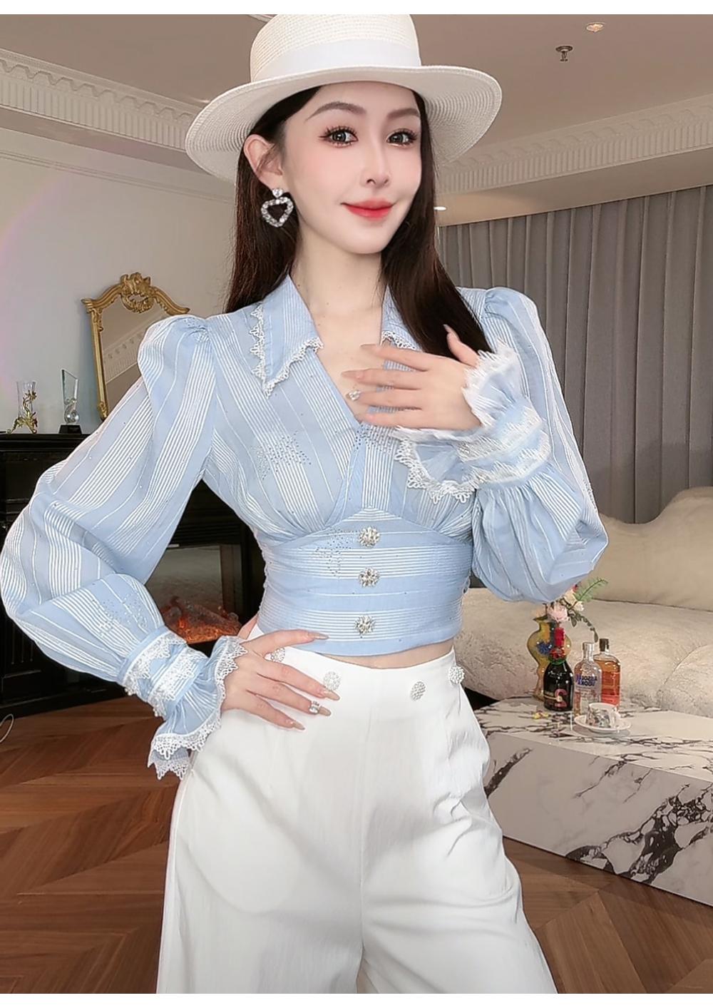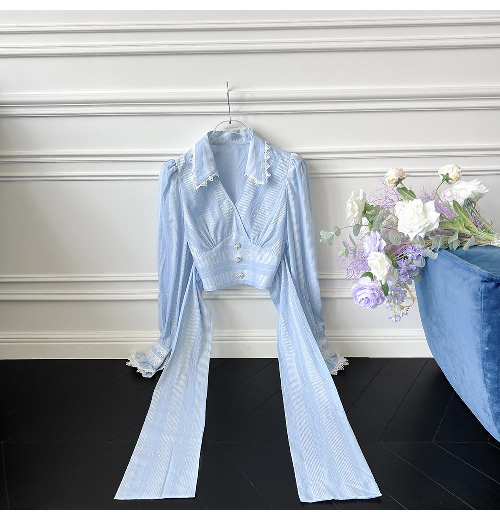 BeQueenStory【初吻玫瑰】设计感蕾丝花边烫钻收腰蓝色条纹衬衫