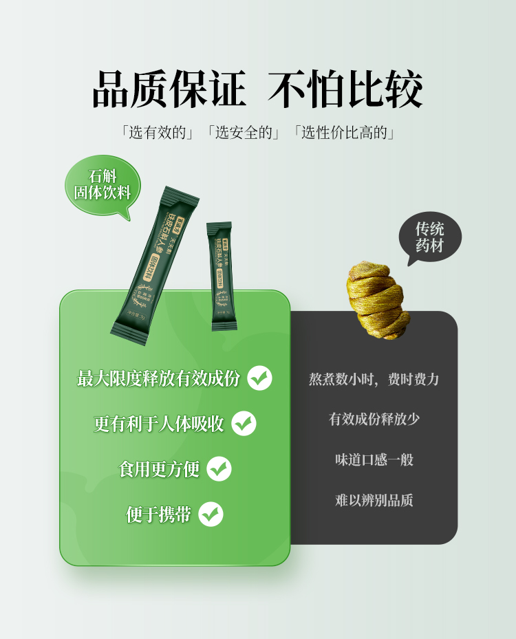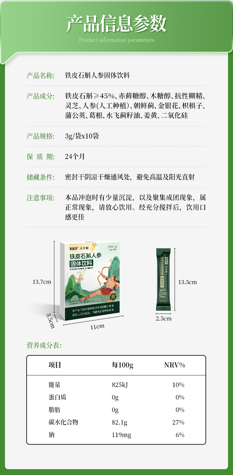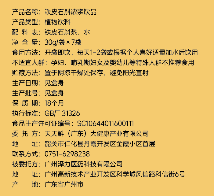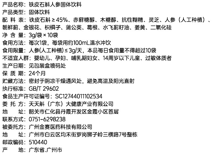 铁皮石斛人参固体饮料:铁皮石斛≥45%、赤醇糖醇、木糖醇、抗性糊精、灵芝、人参(人工种植)、朝鲜蓟、金银花、枳椇子、蒲公英、葛根、水飞蓟籽油、姜黄、二氧化硅