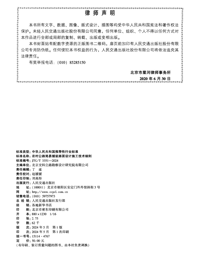 书名:农村公路简易铺装路面设计施工技术细则(JTG/T 3351—2024)