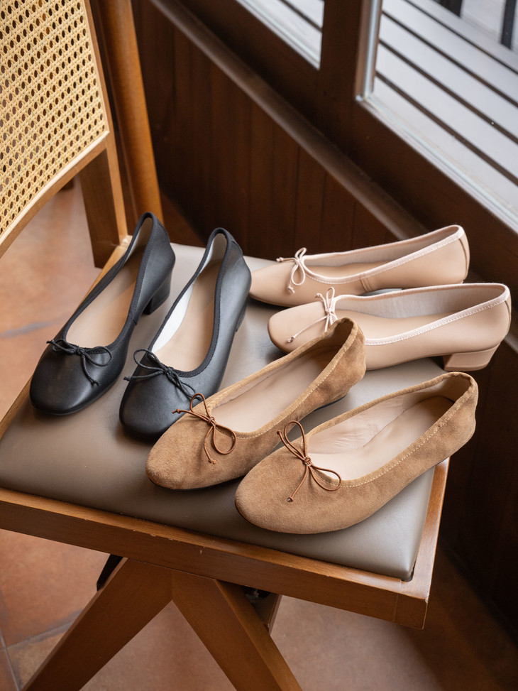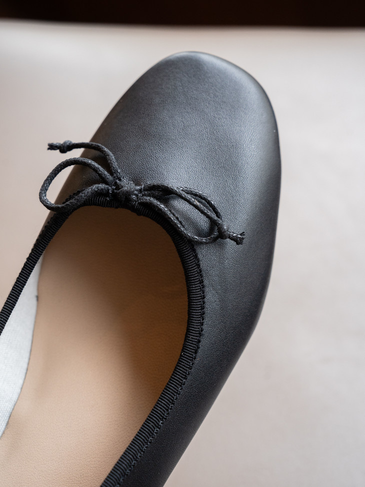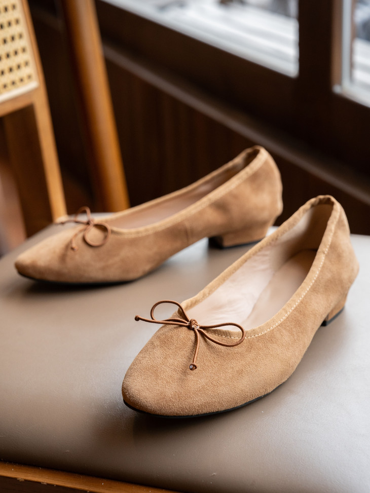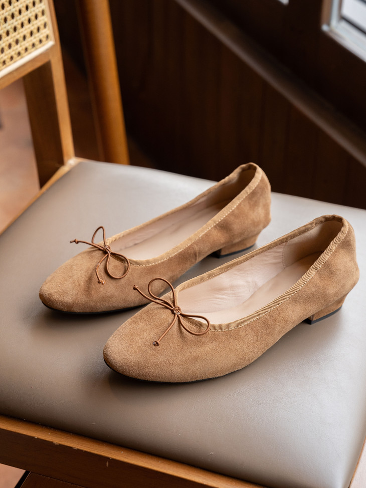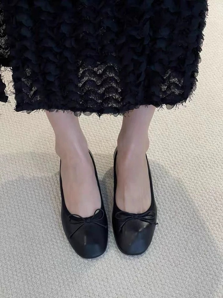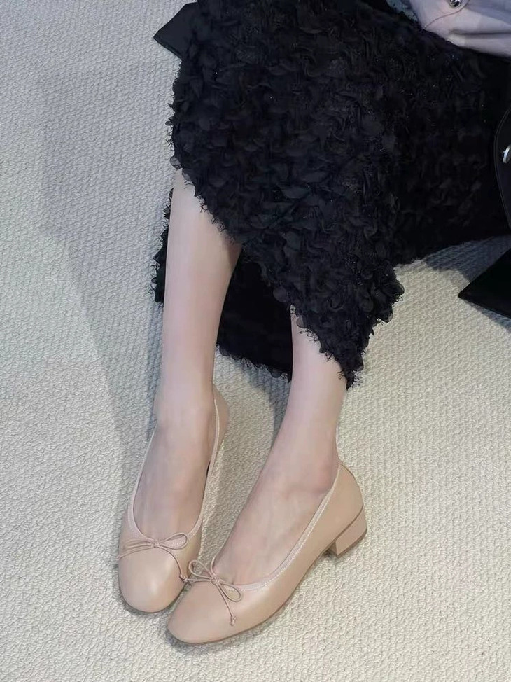 圆润又有点修长的鞋头 打上甜美的蝴蝶结! 既灵动秀气又可爱!奶乎乎的! 鞋面用的是羊皮 质感贼好,细腻有光泽!