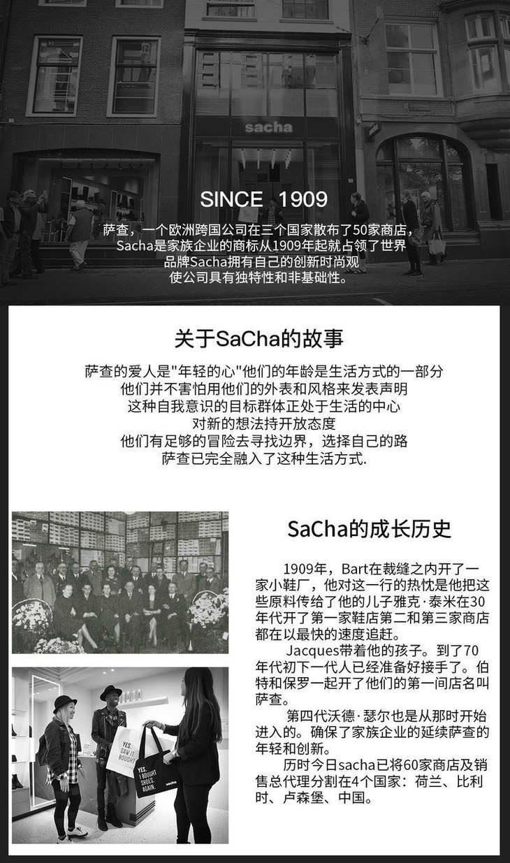 SACHA源自1909年的欧洲品牌 创始人Bart在裁缝之内开了一家小鞋厂 后来他把这些原料传给了他的儿子雅克·泰米 30年代接连开3家鞋店,以最快的速度发展 70年代初,下一代人已经准备好接手了 伯特和保罗一起开了他们的第一间店,名叫萨查 第四代沃德·瑟尔也是从那时开始进入的 确保了家族企业的延续萨查的年轻和创新 历时今日sacha已将60家商店及销售总代理 分割在4个国家:荷兰、比利时、卢森堡、中国