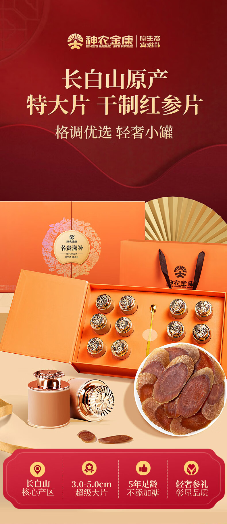 【中秋礼盒】神农金康红参片礼盒180克 长白山特大片切片 新中式滋补礼 原生态真滋补喝护家人健康