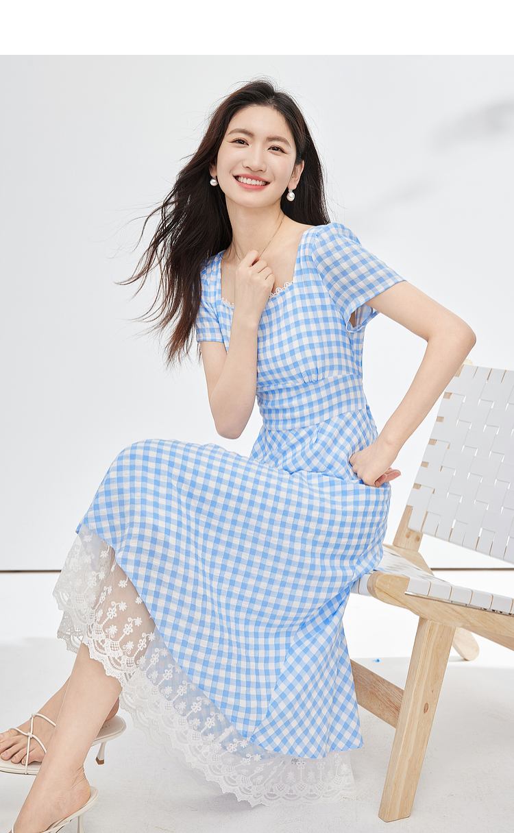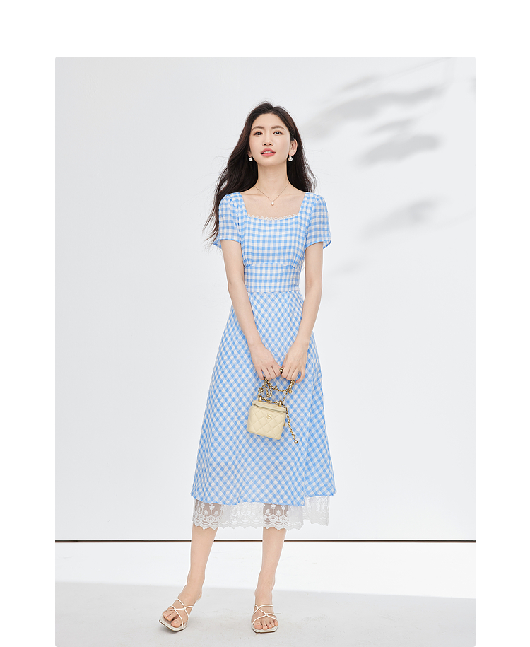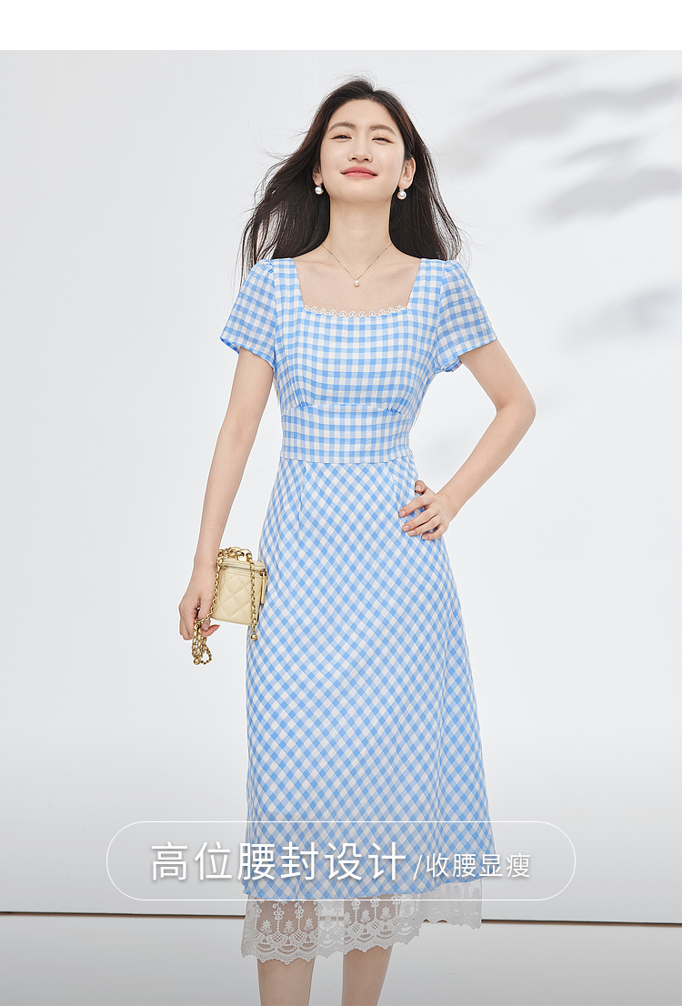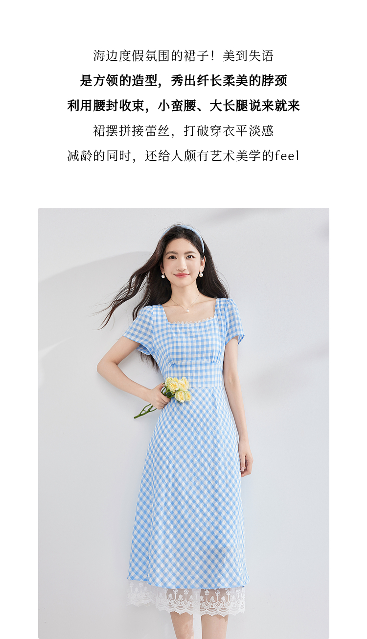 【专属特价】熙世界法式方领蓝白格子连衣裙女夏日海边度假风蕾丝拼接掐腰裙子