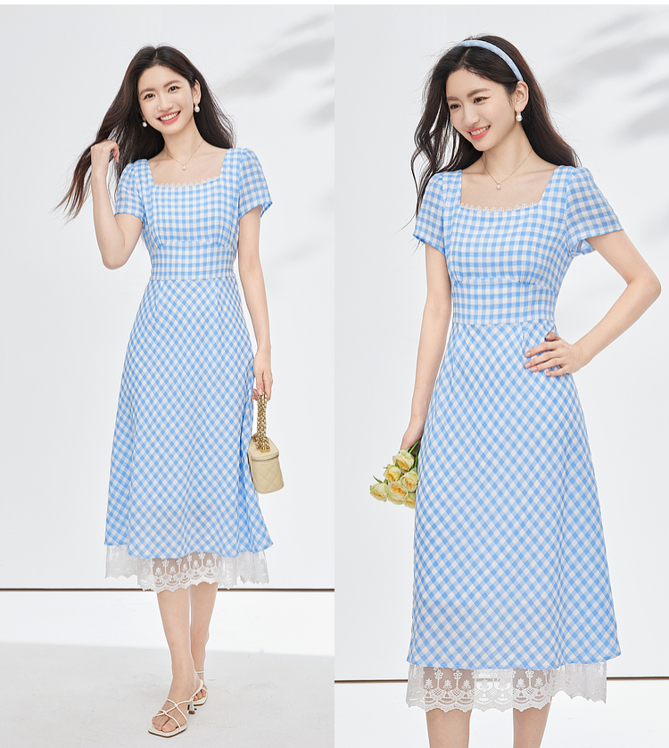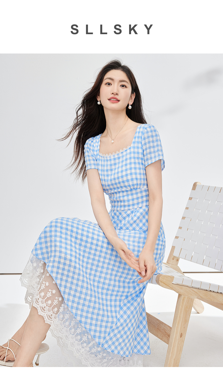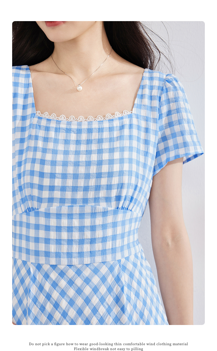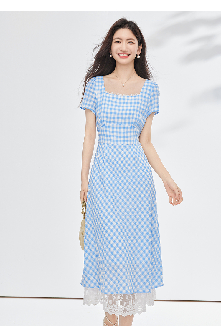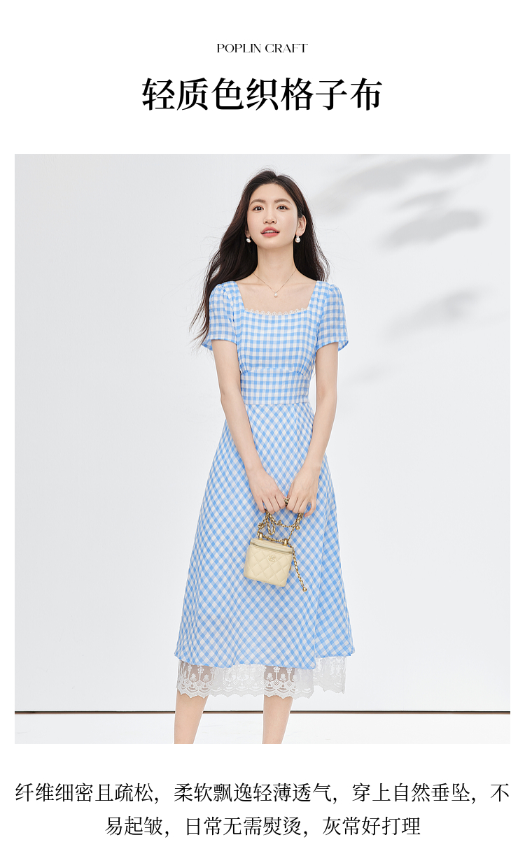 【专属特价】熙世界法式方领蓝白格子连衣裙女夏日海边度假风蕾丝拼接掐腰裙子