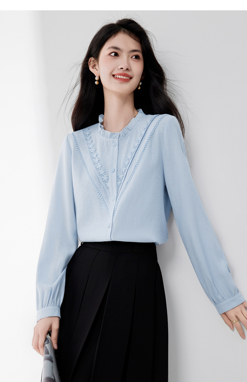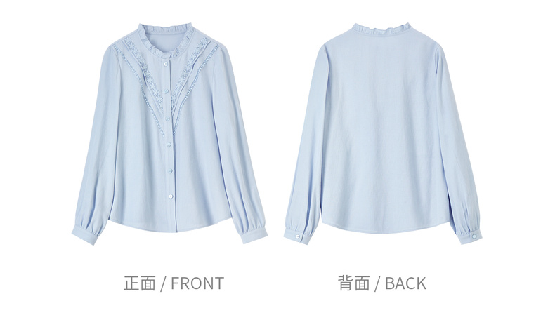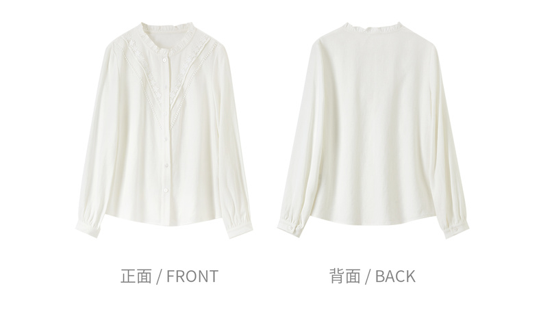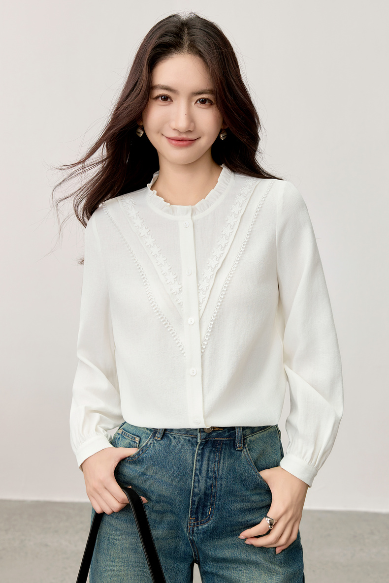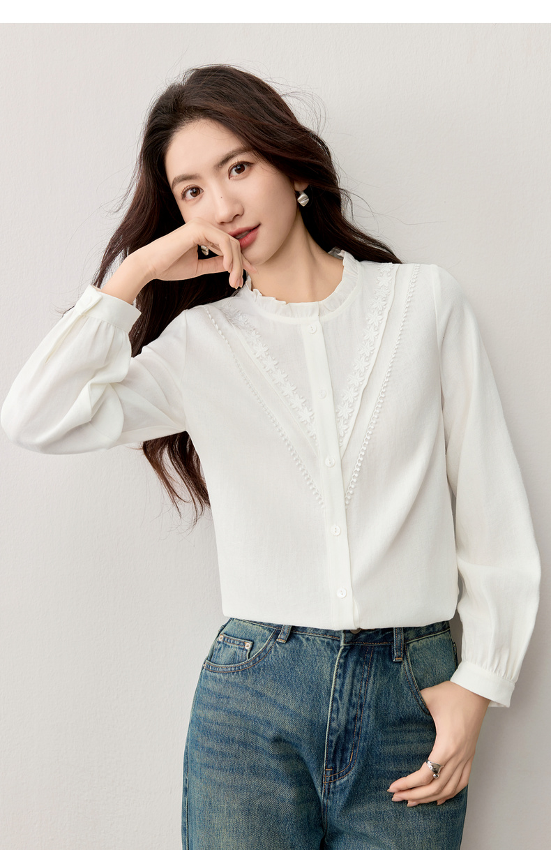 【内购】【含亚麻】优雅通勤木耳边圆领拼接花边长袖衬衫-153CB2513