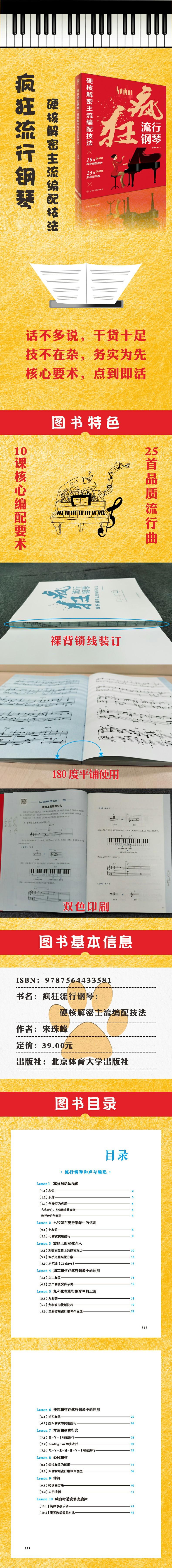 本书前半部分是流行钢琴和声与编配教程,后半部分是流行钢琴精编曲集。教程部分有十课,以色彩和弦的运用为主线,穿插常用的流行织体实战,为读者朋友们展现流行钢琴的核心编排要术。