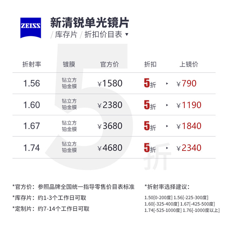 德国 ZEISS蔡司「 新清锐 」超薄非球面单光镜片 库存