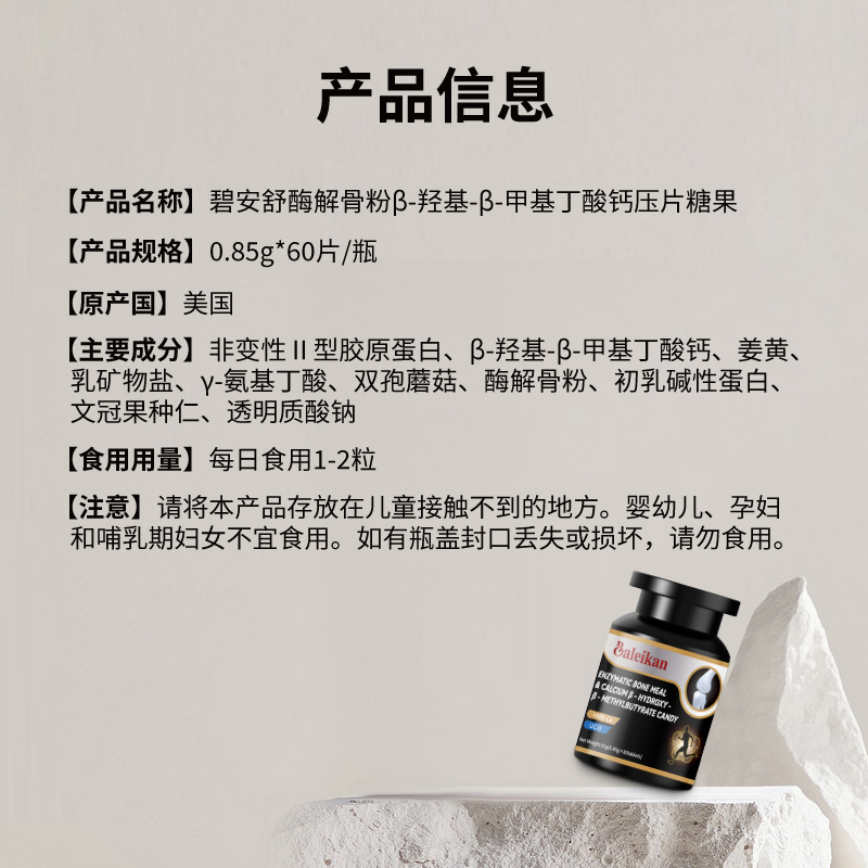 【美国进口】碧安舒酶解骨粉β-羟基-β-甲基丁酸钙压片糖果 0.85g*60片 骨胶原 润滑关节